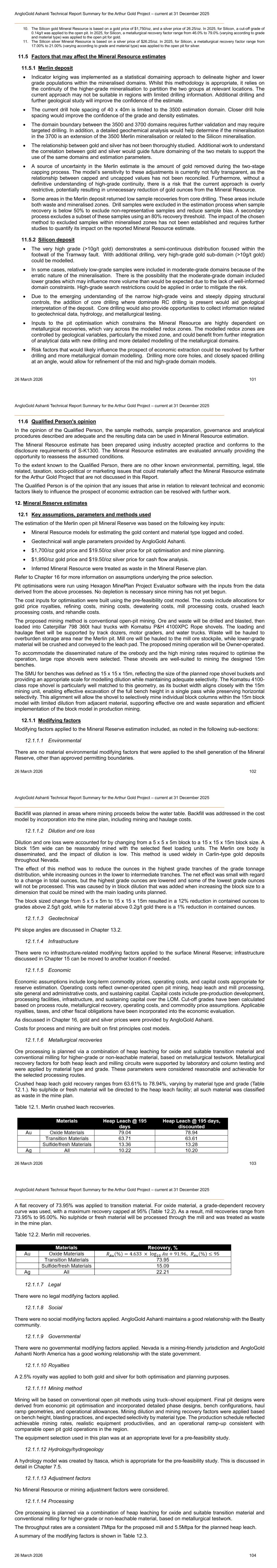 AngloGold Ashanti Technical Report Summary for the Arthur Gold Project – current at 31 December 2025 __________________________________________________________________________________________ 26 March 2026 101 10. The Silicon gold Mineral Resource is based on a gold price of $1,750/oz, and a silver price of 26.25/oz. In 2025, for Silicon, a cut-off grade of 0.14g/t was applied to the open pit. In 2025, for Silicon, a metallurgical recovery factor range from 46.0% to 79.0% (varying according to grade and material type) was applied to the open pit for gold. 11. The Silicon silver Mineral Resource is based on a silver price of $26.25/oz. In 2025, for Silicon, a metallurgical recovery factor range from 17.00% to 21.00% (varying according to grade and material type) was applied to the open pit for silver. 11.5 Factors that may affect the Mineral Resource estimates 11.5.1 Merlin deposit • Indicator kriging was implemented as a statistical domaining approach to delineate higher and lower grade populations within the mineralised domains. Whilst this methodology is appropriate, it relies on the continuity of the higher-grade mineralisation to partition the two groups at relevant locations. The current approach may not be suitable in regions with limited drilling information. Additional drilling and further geological study will improve the confidence of the estimate. • The current drill hole spacing of 40 x 40m is limited to the 3500 estimation domain. Closer drill hole spacing would improve the confidence of the grade and density estimates. • The domain boundary between the 3500 and 3700 domains requires further validation and may require targeted drilling. In addition, a detailed geochemical analysis would help determine if the mineralisation in the 3700 is an extension of the 3500 Merlin mineralisation or related to the Silicon mineralisation. • The relationship between gold and silver has not been thoroughly studied. Additional work to understand the correlation between gold and silver would guide future domaining of the two metals to support the use of the same domains and estimation parameters. • A source of uncertainty in the Merlin estimate is the amount of gold removed during the two-stage capping process. The model’s sensitivity to these adjustments is currently not fully transparent, as the relationship between capped and uncapped values has not been reconciled. Furthermore, without a definitive understanding of high-grade continuity, there is a risk that the current approach is overly restrictive, potentially resulting in unnecessary reduction of gold ounces from the Mineral Resource. • Some areas in the Merlin deposit returned low sample recoveries from core drilling. These areas include both waste and mineralised zones. Drill samples were excluded in the estimation process when sample recovery is below 50% to exclude non-representative samples and reduce sample bias. A secondary process excludes a subset of these samples using an 80% recovery threshold. The impact of the chosen method to excluded samples within mineralised zones has not been established and requires further studies to quantify its impact on the reported Mineral Resource estimate. 11.5.2 Silicon deposit • The very high grade (>10g/t gold) demonstrates a semi-continuous distribution focused within the footwall of the Tramway fault. With additional drilling, very high-grade gold sub-domain (>10g/t gold) could be modelled. • In some cases, relatively low-grade samples were included in moderate-grade domains because of the erratic nature of the mineralisation. There is the possibility that the moderate-grade domain included lower grades which may influence more volume than would be expected due to the lack of well-informed domain constraints. High-grade search restrictions could be applied in order to mitigate the risk. • Due to the emerging understanding of the narrow high-grade veins and steeply dipping structural controls, the addition of core drilling where dominate RC drilling is present would aid geological interpretation of the deposit. Core drilling would also provide opportunities to collect information related to geotechnical data, hydrology, and metallurgical testing. • Inputs to the pit optimisation which constrains the Mineral Resource are highly dependent on metallurgical recoveries, which vary across the modelled redox zones. The modelled redox zones are controlled by geological variables, particularly the mixed zone, and could benefit from further integration of analytical data with new drilling and more detailed modelling of the metallurgical domains. • Risk factors that would likely influence the prospect of economic extraction could be resolved by further drilling and more metallurgical domain modelling. Drilling more core holes, and closely spaced drilling at an angle, would allow for refinement of the mid and high-grade domain models. AngloGold Ashanti Technical Report Summary for the Arthur Gold Project – current at 31 December 2025 __________________________________________________________________________________________ 26 March 2026 102 11.6 Qualified Person's opinion In the opinion of the Qualified Person, the sample methods, sample preparation, governance and analytical procedures described are adequate and the resulting data can be used in Mineral Resource estimation. The Mineral Resource estimate has been prepared using industry accepted practice and conforms to the disclosure requirements of S-K1300. The Mineral Resource estimates are evaluated annually providing the opportunity to reassess the assumed conditions. To the extent known to the Qualified Person, there are no other known environmental, permitting, legal, title related, taxation, socio-political or marketing issues that could materially affect the Mineral Resource estimate for the Arthur Gold Project that are not discussed in this Report. The Qualified Person is of the opinion that any issues that arise