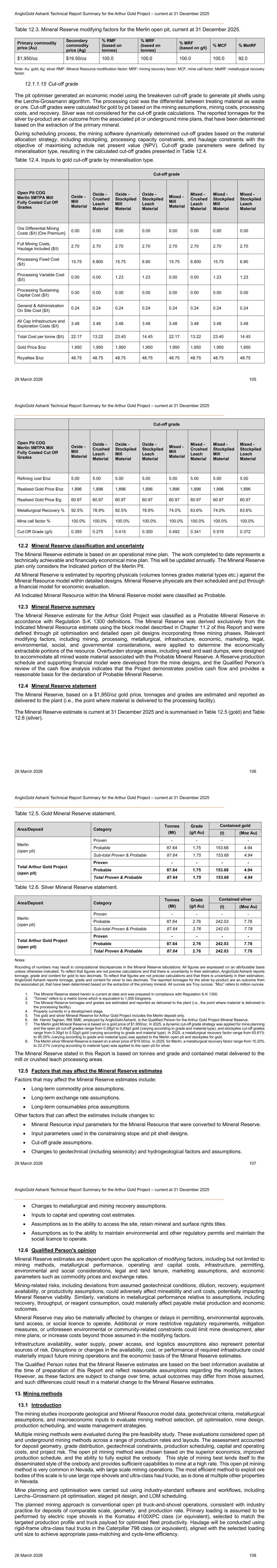 AngloGold Ashanti Technical Report Summary for the Arthur Gold Project – current at 31 December 2025 __________________________________________________________________________________________ 26 March 2026 105 Table 12.3. Mineral Reserve modifying factors for the Merlin open pit, current at 31 December 2025. Primary commodity price (Au) Secondary commodity price (Ag) % RMF (based on tonnes) % MRF (based on tonnes) % MRF (based on g/t) % MCF % MetRF $1,950/oz $19.50/oz 100.0 100.0 100.0 100.0 92.0 Note: Au: gold; Ag: silver RMF: Mineral Resource modification factor; MRF: mining recovery factor; MCF: mine call factor; MetRF: metallurgical recovery factor. 12.1.1.15 Cut-off grade The pit optimiser generated an economic model using the breakeven cut-off grade to generate pit shells using the Lerchs-Grossmann algorithm. The processing cost was the differential between treating material as waste or ore. Cut-off grades were calculated for gold by pit based on the mining assumptions, mining costs, processing costs, and recovery. Silver was not considered for the cut-off grade calculations. The reported tonnages for the silver by-product are an outcome from the associated pit or underground mine plans, that have been determined based on the extraction of the primary mineral. During scheduling process, the mining software dynamically determined cut-off grades based on the material allocation strategy, including stockpiling, processing capacity constraints, and haulage constraints with the objective of maximising schedule net present value (NPV). Cut-off grade parameters were defined by mineralisation type, resulting in the calculated cut-off grades presented in Table 12.4. Table 12.4. Inputs to gold cut-off grade by mineralisation type. Cut-off grade Open Pit COG Merlin 5MTPA Mill Fully Costed Cut Off Grades Oxide - Mill Material Oxide - Crushed Leach Material Oxide - Stockpiled Mill Material Oxide - Stockpiled Leach Material Mixed - Mill Material Mixed - Crushed Leach Material Mixed - Stockpiled Mill Material Mixed - Stockpiled Leach Material Ore Differential Mining Costs ($/t) {Ore Premium} 0.00 0.00 0.00 0.00 0.00 0.00 0.00 0.00 Full Mining Costs, Haulage Included ($/t) 2.70 2.70 2.70 2.70 2.70 2.70 2.70 2.70 Processing Fixed Cost ($/t) 15.75 6.800 15.75 6.80 15.75 6.800 15.75 6.80 Processing Variable Cost ($/t) 0.00 0.00 1.23 1.23 0.00 0.00 1.23 1.23 Processing Sustaining Capital Cost ($/t) 0.00 0.00 0.00 0.00 0.00 0.00 0.00 0.00 General & Administration On Site Cost ($/t) 0.24 0.24 0.24 0.24 0.24 0.24 0.24 0.24 All Cap Infrastructure and Exploration Costs ($/t) 3.48 3.48 3.48 3.48 3.48 3.48 3.48 3.48 Total Cost per tonne ($/t) 22.17 13.22 23.40 14.45 22.17 13.22 23.40 14.45 Gold Price $/oz 1,950 1,950 1,950 1,950 1,950 1,950 1,950 1,950 Royalties $/oz 48.75 48.75 48.75 48.75 48.75 48.75 48.75 48.75 AngloGold Ashanti Technical Report Summary for the Arthur Gold Project – current at 31 December 2025 __________________________________________________________________________________________ 26 March 2026 106 Cut-off grade Open Pit COG Merlin 5MTPA Mill Fully Costed Cut Off Grades Oxide - Mill Material Oxide - Crushed Leach Material Oxide - Stockpiled Mill Material Oxide - Stockpiled Leach Material Mixed - Mill Material Mixed - Crushed Leach Material Mixed - Stockpiled Mill Material Mixed - Stockpiled Leach Material Refining cost $/oz 5.00 5.00 5.00 5.00 5.00 5.00 5.00 5.00 Realised Gold Price $/oz 1,896 1,896 1,896 1,896 1,896 1,896 1,896 1,896 Realised Gold Price $/g 60.97 60.97 60.97 60.97 60.97 60.97 60.97 60.97 Metallurgical Recovery % 92.5% 78.9% 92.5% 78.9% 74.0% 63.6% 74.0% 63.6% Mine call factor % 100.0% 100.0% 100.0% 100.0% 100.0% 100.0% 100.0% 100.0% Cut-Off Grade (g/t) 0.393 0.275 0.415 0.300 0.492 0.341 0.519 0.372 12.2 Mineral Reserve classification and uncertainty The Mineral Reserve estimate is based on an operational mine plan. The work completed to date represents a technically achievable and financially economical mine plan. This will be updated annually. The Mineral Reserve plan only considers the Indicated portion of the Merlin Pit. All Mineral Reserve is estimated by reporting physicals (volumes tonnes grades material types etc.) against the Mineral Resource model within detailed designs. Mineral Reserve physicals are then scheduled and put through a financial model for economic evaluation. All Indicated Mineral Resource within the Mineral Reserve model were classified as Probable. 12.3 Mineral Reserve summary The Mineral Reserve estimate for the Arthur Gold Project was classified as a Probable Mineral Reserve in accordance with Regulation S-K 1300 definitions. The Mineral Reserve was derived exclusively from the Indicated Mineral Resource estimate using the block model described in Chapter 11.2 of this Report and were defined through pit optimisation and detailed open pit designs incorporating three mining phases. Relevant modifying factors, including mining, processing, metallurgical, infrastructure, economic, marketing, legal, environmental, social, and governmental considerations, were applied to determine the economically extractable portions of the resource. Overburden storage areas, including west and east dumps, were designed to accommodate all mined waste material associated with the Probable Mineral Reserve. A Reserve production schedule and supporting financial model were developed from the mine designs, and the Qualified Person’s review of the cash flow analysis indicates that the Project demonstrates positive cash flow and provides a reasonable basis for the declaration of Probable Mineral Reserve. 12.4 Mineral Reserve statement The Mineral Reserve, based on a $1,950/oz gold price, tonnages and grades are estimated and reported as delivered to the plant (i.e., the point where material is delivered to the processing facility). The Mineral Reserve estimate is current at 31 December 2025 and is summarised in Table 12.5 (gold) and Table 12.6 (silver). AngloGold