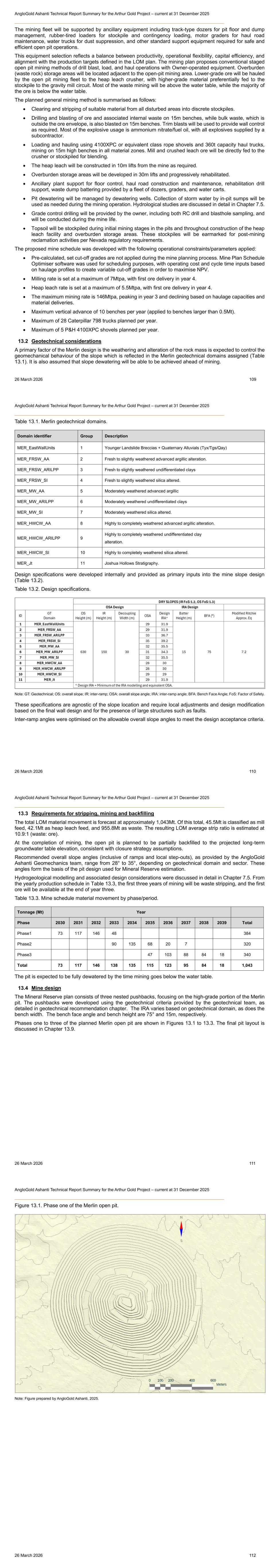 AngloGold Ashanti Technical Report Summary for the Arthur Gold Project – current at 31 December 2025 __________________________________________________________________________________________ 26 March 2026 109 The mining fleet will be supported by ancillary equipment including track-type dozers for pit floor and dump management, rubber-tired loaders for stockpile and contingency loading, motor graders for haul road maintenance, water trucks for dust suppression, and other standard support equipment required for safe and efficient open pit operations. This equipment selection reflects a balance between productivity, operational flexibility, capital efficiency, and alignment with the production targets defined in the LOM plan. The mining plan proposes conventional staged open pit mining methods of drill blast, load, and haul operations with Owner-operated equipment. Overburden (waste rock) storage areas will be located adjacent to the open-pit mining area. Lower-grade ore will be hauled by the open pit mining fleet to the heap leach crusher, with higher-grade material preferentially fed to the stockpile to the gravity mill circuit. Most of the waste mining will be above the water table, while the majority of the ore is below the water table. The planned general mining method is summarised as follows: • Clearing and stripping of suitable material from all disturbed areas into discrete stockpiles. • Drilling and blasting of ore and associated internal waste on 15m benches, while bulk waste, which is outside the ore envelope, is also blasted on 15m benches. Trim blasts will be used to provide wall control as required. Most of the explosive usage is ammonium nitrate/fuel oil, with all explosives supplied by a subcontractor. • Loading and hauling using 4100XPC or equivalent class rope shovels and 360t capacity haul trucks, mining on 15m high benches in all material zones. Mill and crushed leach ore will be directly fed to the crusher or stockpiled for blending. • The heap leach will be constructed in 10m lifts from the mine as required. • Overburden storage areas will be developed in 30m lifts and progressively rehabilitated. • Ancillary plant support for floor control, haul road construction and maintenance, rehabilitation drill support, waste dump battering provided by a fleet of dozers, graders, and water carts. • Pit dewatering will be managed by dewatering wells. Collection of storm water by in-pit sumps will be used as needed during the mining operation. Hydrological studies are discussed in detail in Chapter 7.5. • Grade control drilling will be provided by the owner, including both RC drill and blasthole sampling, and will be conducted during the mine life. • Topsoil will be stockpiled during initial mining stages in the pits and throughout construction of the heap leach facility and overburden storage areas. These stockpiles will be earmarked for post-mining reclamation activities per Nevada regulatory requirements. The proposed mine schedule was developed with the following operational constraints/parameters applied: • Pre-calculated, set cut-off grades are not applied during the mine planning process. Mine Plan Schedule Optimiser software was used for scheduling purposes, with operating cost and cycle time inputs based on haulage profiles to create variable cut-off grades in order to maximise NPV. • Milling rate is set at a maximum of 7Mtpa, with first ore delivery in year 4. • Heap leach rate is set at a maximum of 5.5Mtpa, with first ore delivery in year 4. • The maximum mining rate is 146Mtpa, peaking in year 3 and declining based on haulage capacities and material deliveries. • Maximum vertical advance of 10 benches per year (applied to benches larger than 0.5Mt). • Maximum of 28 Caterpillar 798 trucks planned per year. • Maximum of 5 P&H 4100XPC shovels planned per year. 13.2 Geotechnical considerations A primary factor of the Merlin design is the weathering and alteration of the rock mass is expected to control the geomechanical behaviour of the slope which is reflected in the Merlin geotechnical domains assigned (Table 13.1). It is also assumed that slope dewatering will be able to be achieved ahead of mining. AngloGold Ashanti Technical Report Summary for the Arthur Gold Project – current at 31 December 2025 __________________________________________________________________________________________ 26 March 2026 110 Table 13.1. Merlin geotechnical domains. Domain identifier Group Description MER_EastWallUnits 1 Younger Landslide Breccias + Quaternary Alluvials (Tyx/Tgs/Qay) MER_FRSW_AA 2 Fresh to slightly weathered advanced argillic alteration. MER_FRSW_ARILPP 3 Fresh to slightly weathered undifferentiated clays MER_FRSW_SI 4 Fresh to slightly weathered silica altered. MER_MW_AA 5 Moderately weathered advanced argillic MER_MW_ARILPP 6 Moderately weathered undifferentiated clays MER_MW_SI 7 Moderately weathered silica altered. MER_HWCW_AA 8 Highly to completely weathered advanced argillic alteration. MER_HWCW_ARILPP 9 Highly to completely weathered undifferentiated clay alteration. MER_HWCW_SI 10 Highly to completely weathered silica altered. MER_Jt 11 Joshua Hollows Stratigraphy. Design specifications were developed internally and provided as primary inputs into the mine slope design (Table 13.2). Table 13.2. Design specifications. Note: GT: Geotechnical; OS: overall slope; IR: inter-ramp; OSA: overall slope angle; IRA: inter-ramp angle; BFA: Bench Face Angle; FoS: Factor of Safety. These specifications are agnostic of the slope location and require local adjustments and design modification based on the final wall design and for the presence of large structures such as faults. Inter-ramp angles were optimised on the allowable overall slope angles to meet the design acceptance criteria. AngloGold Ashanti Technical Report Summary for the Arthur Gold Project – current at 31 December 2025 _______________________________________________________