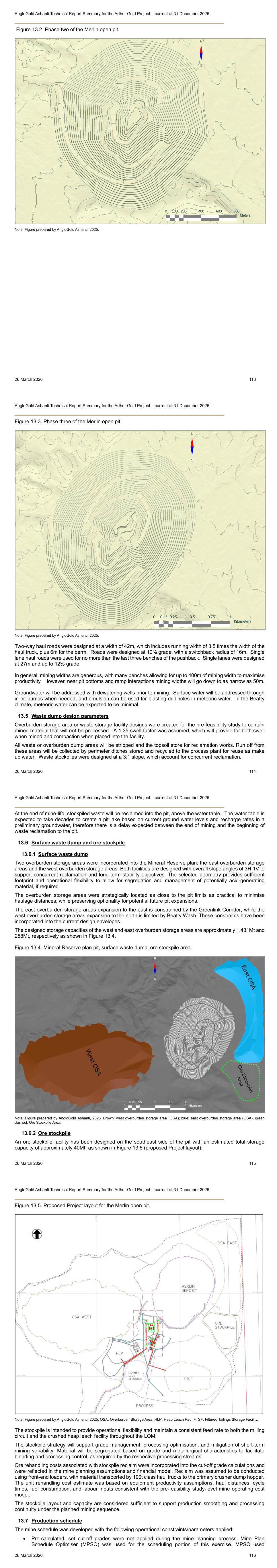 AngloGold Ashanti Technical Report Summary for the Arthur Gold Project – current at 31 December 2025 __________________________________________________________________________________________ 26 March 2026 113 Figure 13.2. Phase two of the Merlin open pit. Note: Figure prepared by AngloGold Ashanti, 2025. AngloGold Ashanti Technical Report Summary for the Arthur Gold Project – current at 31 December 2025 __________________________________________________________________________________________ 26 March 2026 114 Figure 13.3. Phase three of the Merlin open pit. Note: Figure prepared by AngloGold Ashanti, 2025. Two-way haul roads were designed at a width of 42m, which includes running width of 3.5 times the width of the haul truck, plus 6m for the berm. Roads were designed at 10% grade, with a switchback radius of 16m. Single lane haul roads were used for no more than the last three benches of the pushback. Single lanes were designed at 27m and up to 12% grade. In general, mining widths are generous, with many benches allowing for up to 400m of mining width to maximise productivity. However, near pit bottoms and ramp interactions mining widths will go down to as narrow as 50m. Groundwater will be addressed with dewatering wells prior to mining. Surface water will be addressed through in-pit pumps when needed, and emulsion can be used for blasting drill holes in meteoric water. In the Beatty climate, meteoric water can be expected to be minimal. 13.5 Waste dump design parameters Overburden storage area or waste storage facility designs were created for the pre-feasibility study to contain mined material that will not be processed. A 1.35 swell factor was assumed, which will provide for both swell when mined and compaction when placed into the facility. All waste or overburden dump areas will be stripped and the topsoil store for reclamation works. Run off from these areas will be collected by perimeter ditches stored and recycled to the process plant for reuse as make up water. Waste stockpiles were designed at a 3:1 slope, which account for concurrent reclamation. AngloGold Ashanti Technical Report Summary for the Arthur Gold Project – current at 31 December 2025 __________________________________________________________________________________________ 26 March 2026 115 At the end of mine-life, stockpiled waste will be reclaimed into the pit, above the water table. The water table is expected to take decades to create a pit lake based on current ground water levels and recharge rates in a preliminary groundwater, therefore there is a delay expected between the end of mining and the beginning of waste reclamation to the pit. 13.6 Surface waste dump and ore stockpile 13.6.1 Surface waste dump Two overburden storage areas were incorporated into the Mineral Reserve plan: the east overburden storage areas and the west overburden storage areas. Both facilities are designed with overall slope angles of 3H:1V to support concurrent reclamation and long-term stability objectives. The selected geometry provides sufficient footprint and operational flexibility to allow for segregation and management of potentially acid-generating material, if required. The overburden storage areas were strategically located as close to the pit limits as practical to minimise haulage distances, while preserving optionality for potential future pit expansions. The east overburden storage areas expansion to the east is constrained by the Greenlink Corridor, while the west overburden storage areas expansion to the north is limited by Beatty Wash. These constraints have been incorporated into the current design envelopes. The designed storage capacities of the west and east overburden storage areas are approximately 1,431Mt and 258Mt, respectively as shown in Figure 13.4. Figure 13.4. Mineral Reserve plan pit, surface waste dump, ore stockpile area. Note: Figure prepared by AngloGold Ashanti, 2025. Brown: west overburden storage area (OSA); blue: east overburden storage area (OSA), green dashed: Ore Stockpile Area. 13.6.2 Ore stockpile An ore stockpile facility has been designed on the southeast side of the pit with an estimated total storage capacity of approximately 40Mt, as shown in Figure 13.5 (proposed Project layout). AngloGold Ashanti Technical Report Summary for the Arthur Gold Project – current at 31 December 2025 __________________________________________________________________________________________ 26 March 2026 116 Figure 13.5. Proposed Project layout for the Merlin open pit. Note: Figure prepared by AngloGold Ashanti, 2025. OSA: Overburden Storage Area; HLP: Heap Leach Pad; FTSF: Filtered Tailings Storage Facility. The stockpile is intended to provide operational flexibility and maintain a consistent feed rate to both the milling circuit and the crushed heap leach facility throughout the LOM. The stockpile strategy will support grade management, processing optimisation, and mitigation of short-term mining variability. Material will be segregated based on grade and metallurgical characteristics to facilitate blending and processing control, as required by the respective processing streams. Ore rehandling costs associated with stockpile reclaim were incorporated into the cut-off grade calculations and were reflected in the mine planning assumptions and financial model. Reclaim was assumed to be conducted using front-end loaders, with material transported by 100t class haul trucks to the primary crusher dump hopper. The unit rehandling cost estimate was based on equipment productivity assumptions, haul distances, cycle times, fuel consumption, and labour inputs consistent with the pre-feasibility study-level mine operating cost model. The stockpile layout and capacity are considered sufficient to support production smoothing and processing continuity under the planned mining sequence. 13.7 Production schedule The mine schedule was developed with the following operational constraints/parameters applied: 
