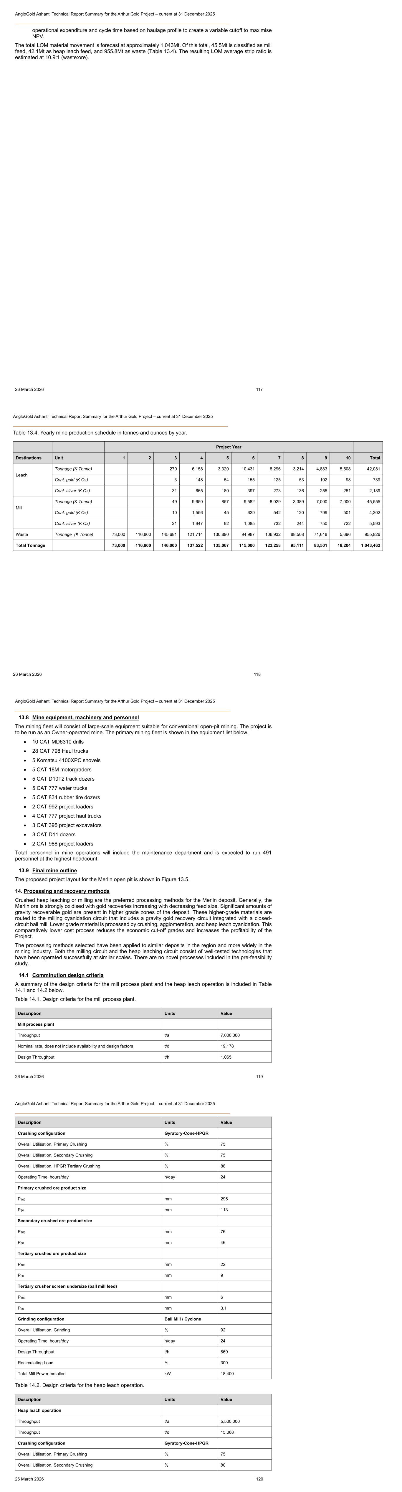 AngloGold Ashanti Technical Report Summary for the Arthur Gold Project – current at 31 December 2025 __________________________________________________________________________________________ 26 March 2026 117 operational expenditure and cycle time based on haulage profile to create a variable cutoff to maximise NPV. The total LOM material movement is forecast at approximately 1,043Mt. Of this total, 45.5Mt is classified as mill feed, 42.1Mt as heap leach feed, and 955.8Mt as waste (Table 13.4). The resulting LOM average strip ratio is estimated at 10.9:1 (waste:ore). AngloGold Ashanti Technical Report Summary for the Arthur Gold Project – current at 31 December 2025 __________________________________________________________________________________________ 26 March 2026 118 Table 13.4. Yearly mine production schedule in tonnes and ounces by year. Project Year Destinations Unit 1 2 3 4 5 6 7 8 9 10 Total Leach Tonnage (K Tonne) 270 6,158 3,320 10,431 8,296 3,214 4,883 5,508 42,081 Cont. gold (K Oz) 3 148 54 155 125 53 102 98 739 Cont. silver (K Oz) 31 665 180 397 273 136 255 251 2,189 Mill Tonnage (K Tonne) 49 9,650 857 9,582 8,029 3,389 7,000 7,000 45,555 Cont. gold (K Oz) 10 1,556 45 629 542 120 799 501 4,202 Cont. silver (K Oz) 21 1,947 92 1,085 732 244 750 722 5,593 Waste Tonnage (K Tonne) 73,000 116,800 145,681 121,714 130,890 94,987 106,932 88,508 71,618 5,696 955,826 Total Tonnage 73,000 116,800 146,000 137,522 135,067 115,000 123,258 95,111 83,501 18,204 1,043,462 AngloGold Ashanti Technical Report Summary for the Arthur Gold Project – current at 31 December 2025 __________________________________________________________________________________________ 26 March 2026 119 13.8 Mine equipment, machinery and personnel The mining fleet will consist of large-scale equipment suitable for conventional open-pit mining. The project is to be run as an Owner-operated mine. The primary mining fleet is shown in the equipment list below. • 10 CAT MD6310 drills • 28 CAT 798 Haul trucks • 5 Komatsu 4100XPC shovels • 5 CAT 18M motorgraders • 5 CAT D10T2 track dozers • 5 CAT 777 water trucks • 5 CAT 834 rubber tire dozers • 2 CAT 992 project loaders • 4 CAT 777 project haul trucks • 3 CAT 395 project excavators • 3 CAT D11 dozers • 2 CAT 988 project loaders Total personnel in mine operations will include the maintenance department and is expected to run 491 personnel at the highest headcount. 13.9 Final mine outline The proposed project layout for the Merlin open pit is shown in Figure 13.5. 14. Processing and recovery methods Crushed heap leaching or milling are the preferred processing methods for the Merlin deposit. Generally, the Merlin ore is strongly oxidised with gold recoveries increasing with decreasing feed size. Significant amounts of gravity recoverable gold are present in higher grade zones of the deposit. These higher-grade materials are routed to the milling cyanidation circuit that includes a gravity gold recovery circuit integrated with a closed- circuit ball mill. Lower grade material is processed by crushing, agglomeration, and heap leach cyanidation. This comparatively lower cost process reduces the economic cut-off grades and increases the profitability of the Project. The processing methods selected have been applied to similar deposits in the region and more widely in the mining industry. Both the milling circuit and the heap leaching circuit consist of well-tested technologies that have been operated successfully at similar scales. There are no novel processes included in the pre-feasibility study. 14.1 Comminution design criteria A summary of the design criteria for the mill process plant and the heap leach operation is included in Table 14.1 and 14.2 below. Table 14.1. Design criteria for the mill process plant. Description Units Value Mill process plant Throughput t/a 7,000,000 Nominal rate, does not include availability and design factors t/d 19,178 Design Throughput t/h 1,065 AngloGold Ashanti Technical Report Summary for the Arthur Gold Project – current at 31 December 2025 __________________________________________________________________________________________ 26 March 2026 120 Description Units Value Crushing configuration Gyratory-Cone-HPGR Overall Utilisation, Primary Crushing % 75 Overall Utilisation, Secondary Crushing % 75 Overall Utilisation, HPGR Tertiary Crushing % 88 Operating Time, hours/day h/day 24 Primary crushed ore product size P100 mm 295 P80 mm 113 Secondary crushed ore product size P100 mm 76 P80 mm 46 Tertiary crushed ore product size P100 mm 22 P80 mm 9 Tertiary crusher screen undersize (ball mill feed) P100 mm 6 P80 mm 3.1 Grinding configuration Ball Mill / Cyclone Overall Utilisation, Grinding % 92 Operating Time, hours/day h/day 24 Design Throughput t/h 869 Recirculating Load % 300 Total Mill Power Installed kW 18,400 Table 14.2. Design criteria for the heap leach operation. Description Units Value Heap leach operation Throughput t/a 5,500,000 Throughput t/d 15,068 Crushing configuration Gyratory-Cone-HPGR Overall Utilisation, Primary Crushing % 75 Overall Utilisation, Secondary Crushing % 80