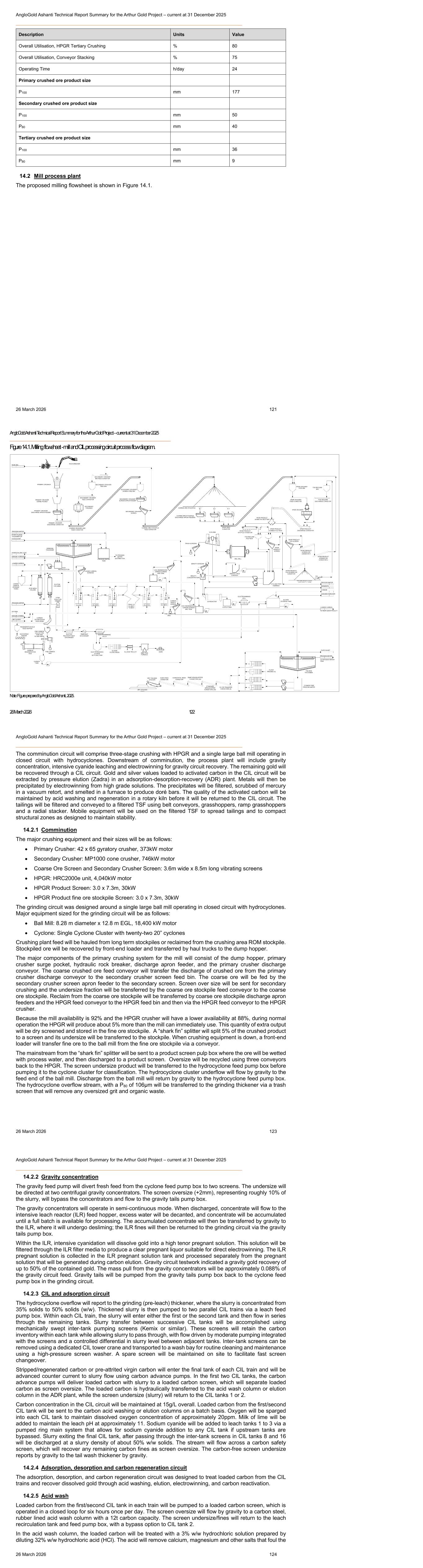 AngloGold Ashanti Technical Report Summary for the Arthur Gold Project – current at 31 December 2025 __________________________________________________________________________________________ 26 March 2026 121 Description Units Value Overall Utilisation, HPGR Tertiary Crushing % 80 Overall Utilisation, Conveyor Stacking % 75 Operating Time h/day 24 Primary crushed ore product size P100 mm 177 Secondary crushed ore product size P100 mm 50 P80 mm 40 Tertiary crushed ore product size P100 mm 36 P80 mm 9 14.2 Mill process plant The proposed milling flowsheet is shown in Figure 14.1. AngloGold Ashanti Technical Report Summary for the Arthur Gold Project – current at 31 December 2025 __________________________________________________________________________________________ 26 March 2026 122 Figure 14.1. Milling flowsheet - mill and CIL processing circuit process flow diagram. Note: Figure prepared by AngloGold Ashanti, 2025. AngloGold Ashanti Technical Report Summary for the Arthur Gold Project – current at 31 December 2025 __________________________________________________________________________________________ 26 March 2026 123 The comminution circuit will comprise three-stage crushing with HPGR and a single large ball mill operating in closed circuit with hydrocyclones. Downstream of comminution, the process plant will include gravity concentration, intensive cyanide leaching and electrowinning for gravity circuit recovery. The remaining gold will be recovered through a CIL circuit. Gold and silver values loaded to activated carbon in the CIL circuit will be extracted by pressure elution (Zadra) in an adsorption-desorption-recovery (ADR) plant. Metals will then be precipitated by electrowinning from high grade solutions. The precipitates will be filtered, scrubbed of mercury in a vacuum retort, and smelted in a furnace to produce doré bars. The quality of the activated carbon will be maintained by acid washing and regeneration in a rotary kiln before it will be returned to the CIL circuit. The tailings will be filtered and conveyed to a filtered TSF using belt conveyors, grasshoppers, ramp grasshoppers and a radial stacker. Mobile equipment will be used on the filtered TSF to spread tailings and to compact structural zones as designed to maintain stability. 14.2.1 Comminution The major crushing equipment and their sizes will be as follows: • Primary Crusher: 42 x 65 gyratory crusher, 373kW motor • Secondary Crusher: MP1000 cone crusher, 746kW motor • Coarse Ore Screen and Secondary Crusher Screen: 3.6m wide x 8.5m long vibrating screens • HPGR: HRC2000e unit, 4,040kW motor • HPGR Product Screen: 3.0 x 7.3m, 30kW • HPGR Product fine ore stockpile Screen: 3.0 x 7.3m, 30kW The grinding circuit was designed around a single large ball mill operating in closed circuit with hydrocyclones. Major equipment sized for the grinding circuit will be as follows: • Ball Mill: 8.28 m diameter x 12.8 m EGL, 18,400 kW motor • Cyclone: Single Cyclone Cluster with twenty-two 20” cyclones Crushing plant feed will be hauled from long term stockpiles or reclaimed from the crushing area ROM stockpile. Stockpiled ore will be recovered by front-end loader and transferred by haul trucks to the dump hopper. The major components of the primary crushing system for the mill will consist of the dump hopper, primary crusher surge pocket, hydraulic rock breaker, discharge apron feeder, and the primary crusher discharge conveyor. The coarse crushed ore feed conveyor will transfer the discharge of crushed ore from the primary crusher discharge conveyor to the secondary crusher screen feed bin. The coarse ore will be fed by the secondary crusher screen apron feeder to the secondary screen. Screen over size will be sent for secondary crushing and the undersize fraction will be transferred by the coarse ore stockpile feed conveyor to the coarse ore stockpile. Reclaim from the coarse ore stockpile will be transferred by coarse ore stockpile discharge apron feeders and the HPGR feed conveyor to the HPGR feed bin and then via the HPGR feed conveyor to the HPGR crusher. Because the mill availability is 92% and the HPGR crusher will have a lower availability at 88%, during normal operation the HPGR will produce about 5% more than the mill can immediately use. This quantity of extra output will be dry screened and stored in the fine ore stockpile. A “shark fin” splitter will split 5% of the crushed product to a screen and its undersize will be transferred to the stockpile. When crushing equipment is down, a front-end loader will transfer fine ore to the ball mill from the fine ore stockpile via a conveyor. The mainstream from the “shark fin” splitter will be sent to a product screen pulp box where the ore will be wetted with process water, and then discharged to a product screen. Oversize will be recycled using three conveyors back to the HPGR. The screen undersize product will be transferred to the hydrocyclone feed pump box before pumping it to the cyclone cluster for classification. The hydrocyclone cluster underflow will flow by gravity to the feed end of the ball mill. Discharge from the ball mill will return by gravity to the hydrocyclone feed pump box. The hydrocyclone overflow stream, with a P80 of 106µm will be transferred to the grinding thickener via a trash screen that will remove any oversized grit and organic waste. AngloGold Ashanti Technical Report Summary for the Arthur Gold Project – current at 31 December 2025 __________________________________________________________________________________________ 26 March 2026 124 14.2.2 Gravity concentration The gravity feed pump will divert fresh feed from the cyclone feed pump box to two screens. The undersize will be directed at two centrifugal gravity concentrators. The screen oversize (+2mm), representing roughly 10% of the slurry, will bypass the concentrators and flow to the gravity tails pump box. The gravity concentrators will operate