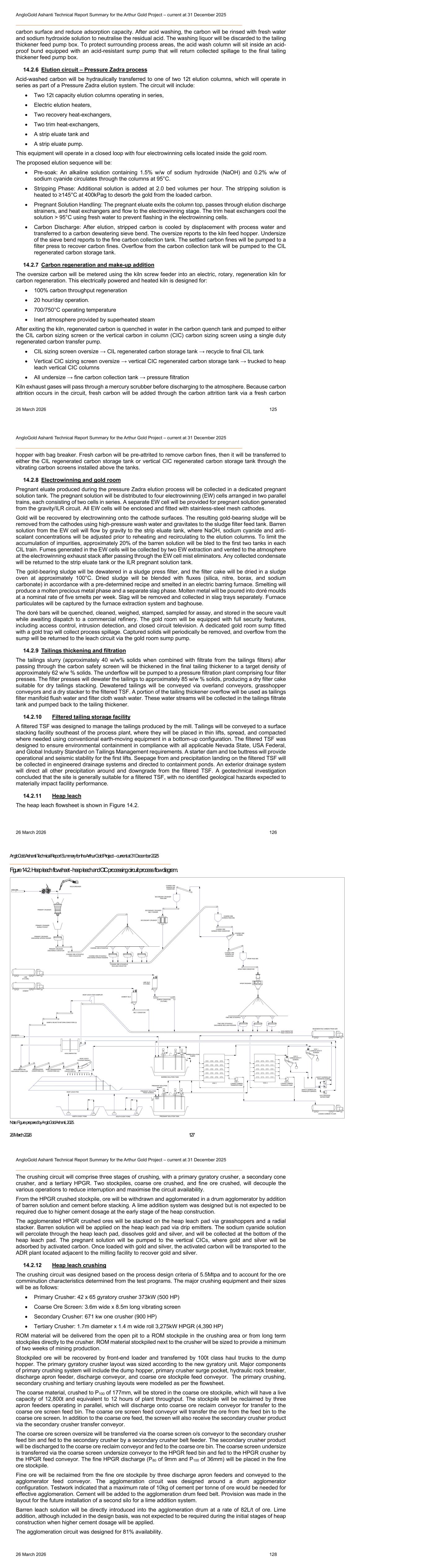 AngloGold Ashanti Technical Report Summary for the Arthur Gold Project – current at 31 December 2025 __________________________________________________________________________________________ 26 March 2026 129 A bulk sampling system was incorporated into the process to support metallurgical accounting requirements (not shown on the layout), as reflected in the process flow diagram. 14.2.13 Heap leach facility Ore discharged from the agglomerator drum will be conveyed via the agglomerator discharge conveyor to a series of grasshopper conveyors and ramp grasshopper conveyors, which feed an index feed conveyor and a radial stacker for heap construction. The heap will be built in nominal 8m lifts to a planned maximum height of 96m. Heap leaching will be conducted with an average leach cycle of 65 days. The initial heap area is approximately 10.1Mft2. The heap leach facility was developed to a pre-feasibility study level based on the design prepared by NewFields. The overall facility will comprise a lined heap leach pad, process pond, and event pond, with the heap leach pad designed for staged development in two phases. Phase one will include the initial pad area together with solution management infrastructure. Phase two will provide for a future pad expansion. Each phase was designed to accommodate 32Mt of ore, for 64Mt total. Ore will be conveyed to the heap leach pad and stacked in nominal lifts on a composite-lined pad incorporating a low-permeability soil or geosynthetic clay liner overlain by a high density polyethylene (HDPE) primary liner and drainage layer. The pad and solution collection systems were designed to accommodate a nominal solution application rate of 0.005gpm/ft² and a maximum solution return rate of approximately 5,000gpm, consistent with the selected heap leach operating parameters. A geotechnical investigation concluded that the site is generally suitable for heap leach facility development, with no identified geological hazards expected to materially impact facility performance. 14.2.14 Carbon adsorption plant Pregnant leach solution (PLS) will drain by gravity from the heap to the pregnant solution tank and will be pumped to the vertical CIC units at a design rate of 5,000gpm using two operating vertical pumps. Gold adsorption will occur in two vertical CIC units operating in parallel. Each vertical CIC unit will consist of a closed-top, five-stage carbon adsorption column. Loaded carbon will be withdrawn from the bottom stage of each vertical CIC using a dedicated carbon transfer pump and discharged into a tanker truck. Excess solution accompanying the loaded carbon will be drained and returned to the process circuit. Loaded carbon will be transported by truck to the centralised ADR facility located at the mill. Regenerated carbon will be returned from the mill ADR to the vertical CIC circuit by truck. After removing loaded carbon from the bottom stage, the same carbon pump will advance carbon down the column, one stage at a time. When the top stage is finished transferring, regenerated carbon will be loaded from a nearby storage tank. 14.3 Reagents Reagent selection and consumption were based on project-specific metallurgical testwork and industry operating practice. All reagents will be stored, mixed and handled in dedicated areas to prevent cross- contamination and ensure personnel safety. Alkaline and acidic reagents will be stored in separate contained and bunded areas equipped with sumps and sump pumps to manage potential spills. Storage tanks were sized to accommodate projected consumption rates and delivery volumes and will be provided with level instrumentation and alarms to prevent overfilling. Reagent transfer and preparation areas will be equipped with appropriate ventilation, fire suppression systems, and safety shower stations, and Material Safety Data Sheet stations. Forklifts will be used for handling reagent bulk bags and totes. 14.3.1 Milk of lime Quicklime will be delivered by tank truck and pneumatically transferred by a truck carried blower to the storage silo. Air entering the silo with the quicklime will exit the silo through a baghouse filtered silo vent at top of the silo. Quicklime from the cone bottom of the silo will be delivered by a screw conveyor to a vertical grinding mill type slaker. Fresh water will be fed to the slaker with control manifold to control the slaking temperature to an ideal range (normally between 75 to 85°C) for optimal slaking. Slaked lime milk will be further diluted to 20% w/w and discharged to a transfer pump box and transferred to the milk of lime storage tank. A recirculating pumping system will be delivering the lime milk to various dosing points for pH control of CIL slurry. AngloGold Ashanti Technical Report Summary for the Arthur Gold Project – current at 31 December 2025 __________________________________________________________________________________________ 26 March 2026 130 14.3.2 Sodium cyanide Sodium cyanide will be delivered to site as solid briquettes with ISO containers. A mixing/recirculation pumping system with suction from the mixing/recirculation tank will pump pH adjusted solution (pH ≥10.5) to the ISO container to dissolve the solid briquettes and recirculate back by compressed air to the mixing tank. The mixing tank was sized to contain one ISO container’s sodium cyanide (17.5 ton of 98% w/w) with solution diluted to concentration of 30%. The mixing/recirculation pump will then pump the solution from mixing tank to the cyanide holding tank. From there, cyanide feed pumps will distribute cyanide solution to the CIL, ILR and elution circuits via a ring main piping system. Spillages in the sodium cyanide area will be collected at the sodium cyanide area sump and will be delivered to the leach tanks area by using the sodium cyanide area sump pump. 14.3.3 Sodium hydroxide (NaOH) NaOH will be delivered to site in bulk form at 50 w/w % solution and held in a dedicated storage tank. The