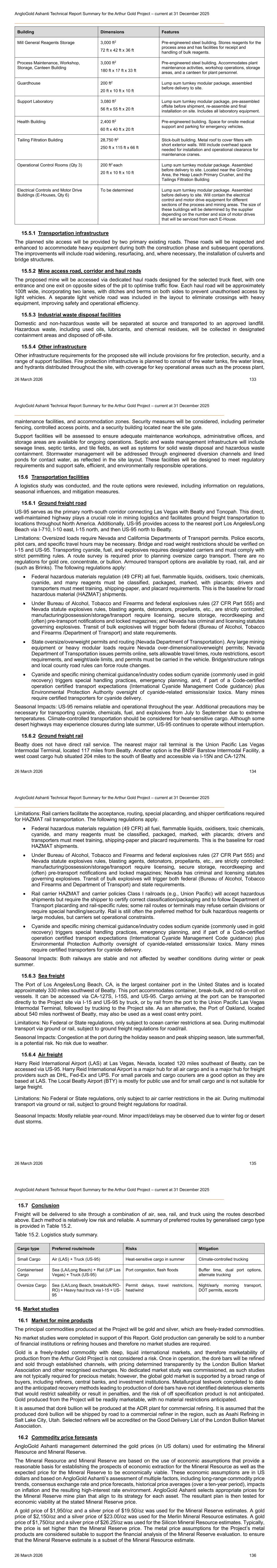 AngloGold Ashanti Technical Report Summary for the Arthur Gold Project – current at 31 December 2025 __________________________________________________________________________________________ 26 March 2026 133 Building Dimensions Features Mill General Reagents Storage 3,000 ft2 72 ft x 42 ft x 36 ft Pre-engineered steel building. Stores reagents for the process area and has facilities for receipt and handling of bulk reagents. Process Maintenance, Workshop, Storage, Canteen Building 3,000 ft2 180 ft x 17 ft x 33 ft Pre-engineered steel building. Accommodates plant maintenance activities, workshop operations, storage areas, and a canteen for plant personnel. Guardhouse 200 ft2 20 ft x 10 ft x 10 ft Lump sum turnkey modular package, assembled before delivery to site. Support Laboratory 3,080 ft2 56 ft x 55 ft x 20 ft Lump sum turnkey modular package, pre-assembled offsite before shipment, re-assemble and final installation on site. Includes all laboratory equipment. Health Building 2,400 ft2 60 ft x 40 ft x 20 ft Pre-engineered building. Space for onsite medical support and parking for emergency vehicles. Tailing Filtration Building 28,750 ft2 250 ft x 115 ft x 66 ft Stick-built building. Metal roof to cover filters with short exterior walls. Will include overhead space needed for installation and operational clearance for maintenance cranes. Operational Control Rooms (Qty 3) 200 ft2 each 20 ft x 10 ft x 10 ft Lump sum turnkey modular package. Assembled before delivery to site. Located near the Grinding Area, the Heap Leach Primary Crusher, and the Tailings Filtration Building Electrical Controls and Motor Drive Buildings (E-Houses, Qty 6) To be determined Lump sum turnkey modular package. Assembled before delivery to site. Will contain the electrical control and motor drive equipment for different sections of the process and mining areas. The size of these buildings will be determined by the supplier depending on the number and size of motor drives that will be serviced from each E-House. 15.5.1 Transportation infrastructure The planned site access will be provided by two primary existing roads. These roads will be inspected and enhanced to accommodate heavy equipment during both the construction phase and subsequent operations. The improvements will include road widening, resurfacing, and, where necessary, the installation of culverts and bridge structures. 15.5.2 Mine access road, corridor and haul roads The proposed mine will be accessed via dedicated haul roads designed for the selected truck fleet, with one entrance and one exit on opposite sides of the pit to optimise traffic flow. Each haul road will be approximately 100ft wide, incorporating two lanes, with ditches and berms on both sides to prevent unauthorised access by light vehicles. A separate light vehicle road was included in the layout to eliminate crossings with heavy equipment, improving safety and operational efficiency. 15.5.3 Industrial waste disposal facilities Domestic and non-hazardous waste will be separated at source and transported to an approved landfill. Hazardous waste, including used oils, lubricants, and chemical residues, will be collected in designated containment areas and disposed of off-site. 15.5.4 Other infrastructure Other infrastructure requirements for the proposed site will include provisions for fire protection, security, and a range of support facilities. Fire protection infrastructure is planned to consist of fire water tanks, fire water lines, and hydrants distributed throughout the site, with coverage for key operational areas such as the process plant, AngloGold Ashanti Technical Report Summary for the Arthur Gold Project – current at 31 December 2025 __________________________________________________________________________________________ 26 March 2026 134 maintenance facilities, and accommodation zones. Security measures will be considered, including perimeter fencing, controlled access points, and a security building located near the site gate. Support facilities will be assessed to ensure adequate maintenance workshops, administrative offices, and storage areas are available for ongoing operations. Septic and waste management infrastructure will include sewage lines, septic tanks, and tile fields, as well as systems for solid waste disposal and hazardous waste containment. Stormwater management will be addressed through engineered diversion channels and lined ponds for contact water, as reflected in the site layout. These facilities will be designed to meet regulatory requirements and support safe, efficient, and environmentally responsible operations. 15.6 Transportation facilities A logistics study was conducted, and the route options were reviewed, including information on regulations, seasonal influences, and mitigation measures. 15.6.1 Ground freight road US-95 serves as the primary north-south corridor connecting Las Vegas with Beatty and Tonopah. This direct, well-maintained highway plays a crucial role in mining logistics and facilitates ground freight transportation to locations throughout North America. Additionally, US-95 provides access to the nearest port Los Angeles/Long Beach via I-710, I-10 east, I-15 north, and then US-95 north to Beatty. Limitations: Oversized loads require Nevada and California Departments of Transport permits. Police escorts, pilot cars, and specific travel hours may be necessary. Bridge and road weight restrictions should be verified on I-15 and US-95. Transporting cyanide, fuel, and explosives requires designated carriers and must comply with strict permitting rules. A route survey is required prior to planning oversize cargo transport. There are no regulations for gold ore, concentrate, or bullion. Armoured transport options are available by road, rail, and air (such as Brinks). The following regulations apply: • Federal hazardous materials regulation (49 CFR) all fuel, flammable liquids, oxidisers, toxic chemicals, cyanide, and many reagen