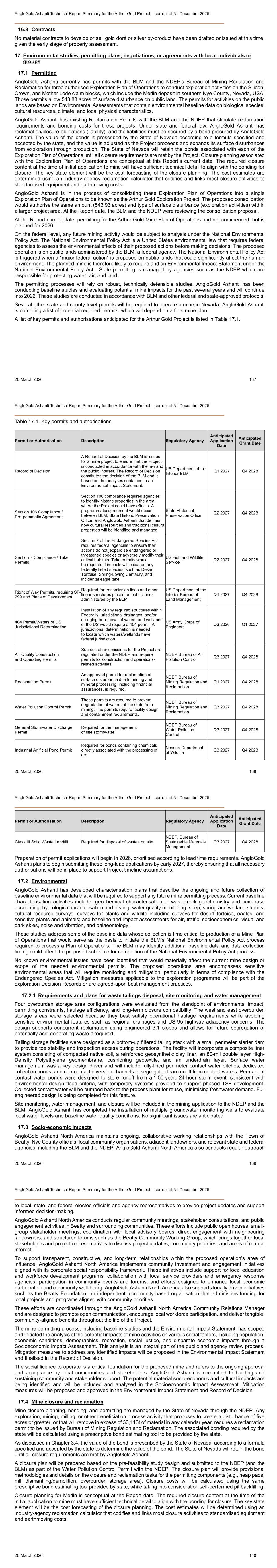 AngloGold Ashanti Technical Report Summary for the Arthur Gold Project – current at 31 December 2025 __________________________________________________________________________________________ 26 March 2026 137 16.3 Contracts No material contracts to develop or sell gold doré or silver by-product have been drafted or issued at this time, given the early stage of property assessment. 17. Environmental studies, permitting plans, negotiations, or agreements with local individuals or groups 17.1 Permitting AngloGold Ashanti currently has permits with the BLM and the NDEP’s Bureau of Mining Regulation and Reclamation for three authorised Exploration Plan of Operations to conduct exploration activities on the Silicon, Crown, and Mother Lode claim blocks, which include the Merlin deposit in southern Nye County, Nevada, USA. Those permits allow 543.83 acres of surface disturbance on public land. The permits for activities on the public lands are based on Environmental Assessments that contain environmental baseline data on biological species, cultural resources, climate, and local physical characteristics. AngloGold Ashanti has existing Reclamation Permits with the BLM and the NDEP that stipulate reclamation requirements and bonding costs for these projects. Under state and federal law, AngloGold Ashanti has reclamation/closure obligations (liability), and the liabilities must be secured by a bond procured by AngloGold Ashanti. The value of the bonds is prescribed by the State of Nevada according to a formula specified and accepted by the state, and the value is adjusted as the Project proceeds and expands its surface disturbances from exploration through production. The State of Nevada will retain the bonds associated with each of the Exploration Plan of Operations until all closure requirements are met by the Project. Closure planning associated with the Exploration Plan of Operations are conceptual at this Report’s current date. The required closure content at the time of initial application to mine will have sufficient technical detail to align with the bonding for closure. The key state element will be the cost forecasting of the closure planning. The cost estimates are determined using an industry-agency reclamation calculator that codifies and links most closure activities to standardised equipment and earthmoving costs. AngloGold Ashanti is in the process of consolidating these Exploration Plan of Operations into a single Exploration Plan of Operations to be known as the Arthur Gold Exploration Project. The proposed consolidation would authorise the same amount (543.93 acres) and type of surface disturbance (exploration activities) within a larger project area. At the Report date, the BLM and the NDEP were reviewing the consolidation proposal. At the Report current date, permitting for the Arthur Gold Mine Plan of Operations had not commenced, but is planned for 2026. On the federal level, any future mining activity would be subject to analysis under the National Environmental Policy Act. The National Environmental Policy Act is a United States environmental law that requires federal agencies to assess the environmental effects of their proposed actions before making decisions. The proposed operation is on public lands administered by the BLM, a federal agency. The National Environmental Policy Act is triggered when a "major federal action" is proposed on public lands that could significantly affect the human environment. The planned mine is therefore likely to require and an Environmental Impact Statement under the National Environmental Policy Act. State permitting is managed by agencies such as the NDEP which are responsible for protecting water, air, and land. The permitting processes will rely on robust, technically defensible studies. AngloGold Ashanti has been conducting baseline studies and evaluating potential mine impacts for the past several years and will continue into 2026. These studies are conducted in accordance with BLM and other federal and state-approved protocols. Several other state and county-level permits will be required to operate a mine in Nevada. AngloGold Ashanti is compiling a list of potential required permits, which will depend on a final mine plan. A list of key permits and authorisations anticipated for the Arthur Gold Project is listed in Table 17.1. AngloGold Ashanti Technical Report Summary for the Arthur Gold Project – current at 31 December 2025 __________________________________________________________________________________________ 26 March 2026 138 Table 17.1. Key permits and authorisations. Permit or Authorisation Description Regulatory Agency Anticipated Application Date Anticipated Grant Date Record of Decision A Record of Decision by the BLM is issued for a mine project to ensure that the Project is conducted in accordance with the law and the public interest. The Record of Decision constitutes the decision of the BLM and is based on the analyses contained in an Environmental Impact Statement. US Department of the Interior BLM Q1 2027 Q4 2028 Section 106 Compliance / Programmatic Agreement Section 106 compliance requires agencies to identify historic properties in the area where the Project could have effects. A programmatic agreement would occur between BLM, State Historic Preservation Office, and AngloGold Ashanti that defines how cultural resources and traditional cultural properties will be identified and managed. State Historical Preservation Office Q2 2027 Q4 2028 Section 7 Compliance / Take Permits Section 7 of the Endangered Species Act requires federal agencies to ensure their actions do not jeopardise endangered or threatened species or adversely modify their critical habitats. Take permits would be required if impacts will occur on any federally listed species, such as Desert Tortoise, Spring-Loving Centaury, and incidental eagle take. US Fish and Wildlife Service Q2 2027 Q4 2028 Right of Way Permits, requiring SF- 299 and 