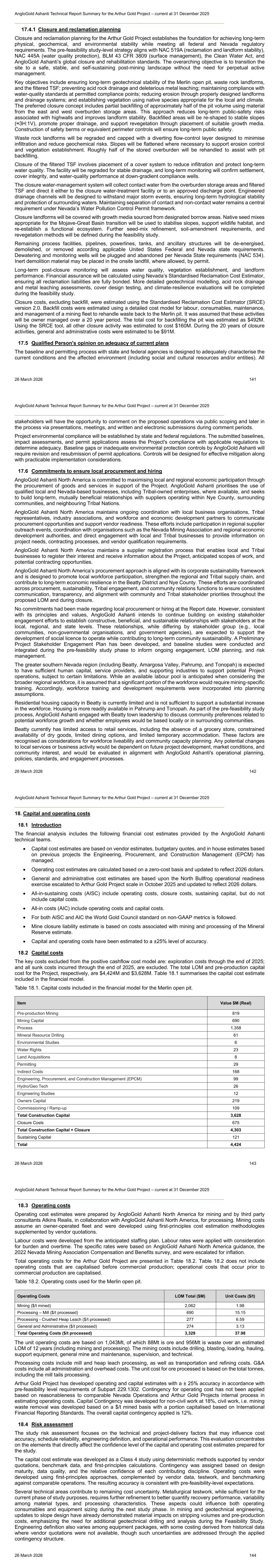 AngloGold Ashanti Technical Report Summary for the Arthur Gold Project – current at 31 December 2025 __________________________________________________________________________________________ 26 March 2026 141 17.4.1 Closure and reclamation planning Closure and reclamation planning for the Arthur Gold Project establishes the foundation for achieving long-term physical, geochemical, and environmental stability while meeting all federal and Nevada regulatory requirements. The pre-feasibility study-level strategy aligns with NAC 519A (reclamation and landform stability), NAC 445A (water quality protection), BLM 43 CFR 3809 (surface management), the Clean Water Act, and AngloGold Ashanti’s global closure and rehabilitation standards. The overarching objective is to transition the site to a safe, stable, and self-sustaining post-mining landscape without the need for perpetual active management. Key objectives include ensuring long-term geotechnical stability of the Merlin open pit, waste rock landforms, and the filtered TSF; preventing acid rock drainage and deleterious metal leaching; maintaining compliance with water-quality standards at permitted compliance points; reducing erosion through properly designed landforms and drainage systems; and establishing vegetation using native species appropriate for the local arid climate. The preferred closure concept includes partial backfilling of approximately half of the pit volume using material from the east and west overburden storage areas. This approach reduces long-term public-safety risks associated with highwalls and improves landform stability. Backfilled areas will be re-shaped to stable slopes (≈3H:1V), promote proper drainage, and support revegetation through placement of suitable growth media. Construction of safety berms or equivalent perimeter controls will ensure long-term public safety. Waste rock landforms will be regraded and capped with a diverting flow-control layer designed to minimise infiltration and reduce geochemical risks. Slopes will be flattened where necessary to support erosion control and vegetation establishment. Roughly half of the stored overburden will be rehandled to assist with pit backfilling. Closure of the filtered TSF involves placement of a cover system to reduce infiltration and protect long-term water quality. The facility will be regraded for stable drainage, and long-term monitoring will confirm settlement, cover integrity, and water-quality performance at down-gradient compliance wells. The closure water-management system will collect contact water from the overburden storage areas and filtered TSF and direct it either to the closure water-treatment facility or to an approved discharge point. Engineered drainage channels will be designed to withstand major storm events, ensuring long-term hydrological stability and protection of surrounding waters. Maintaining separation of contact and non-contact water remains a central requirement under Nevada’s Water Pollution Control Permit framework. Closure landforms will be covered with growth media sourced from designated borrow areas. Native seed mixes appropriate for the Mojave-Great Basin transition will be used to stabilise slopes, support wildlife habitat, and re-establish a functional ecosystem. Further seed-mix refinement, soil-amendment requirements, and revegetation methods will be defined during the feasibility study. Remaining process facilities, pipelines, powerlines, tanks, and ancillary structures will be de-energised, demolished, or removed according applicable United States Federal and Nevada state requirements. Dewatering and monitoring wells will be plugged and abandoned per Nevada State requirements (NAC 534). Inert demolition material may be placed in the onsite landfill, where allowed, by permit. Long-term post-closure monitoring will assess water quality, vegetation establishment, and landform performance. Financial assurance will be calculated using Nevada’s Standardised Reclamation Cost Estimator, ensuring all reclamation liabilities are fully bonded. More detailed geotechnical modelling, acid rock drainage and metal leaching assessments, cover design testing, and climate-resilience evaluations will be completed during the feasibility study. Closure costs, excluding backfill, were estimated using the Standardised Reclamation Cost Estimator (SRCE) version 2.0. Backfill costs were estimated using a detailed cost model for labour, consumables, maintenance, and management of a mining fleet to rehandle waste back to the Merlin pit. It was assumed that these activities will be owner managed over a 20 year period. The total cost for backfilling the pit was estimated as $492M. Using the SRCE tool, all other closure activity was estimated to cost $160M. During the 20 years of closure activities, general and administrative costs were estimated to be $91M. 17.5 Qualified Person's opinion on adequacy of current plans The baseline and permitting process with state and federal agencies is designed to adequately characterise the current conditions and the affected environment (including social and cultural resources and/or entities). All AngloGold Ashanti Technical Report Summary for the Arthur Gold Project – current at 31 December 2025 __________________________________________________________________________________________ 26 March 2026 142 stakeholders will have the opportunity to comment on the proposed operations via public scoping and later in the process via presentations, meetings, and written and electronic submissions during comment periods. Project environmental compliance will be established by state and federal regulations. The submitted baselines, impact assessments, and permit applications assess the Project's compliance with applicable regulations to determine adequacy. Baseline gaps or inadequate environmental protection controls by AngloGold Ashanti will require revision and resubmission of permit applications. Controls 