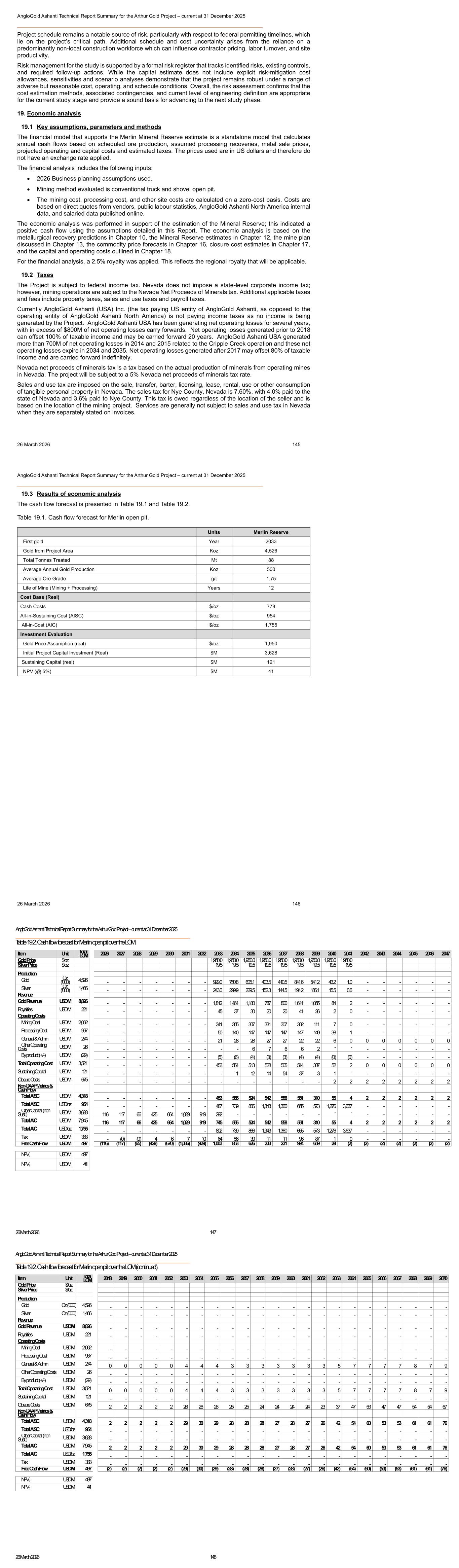 AngloGold Ashanti Technical Report Summary for the Arthur Gold Project – current at 31 December 2025 __________________________________________________________________________________________ 26 March 2026 145 Project schedule remains a notable source of risk, particularly with respect to federal permitting timelines, which lie on the project’s critical path. Additional schedule and cost uncertainty arises from the reliance on a predominantly non-local construction workforce which can influence contractor pricing, labor turnover, and site productivity. Risk management for the study is supported by a formal risk register that tracks identified risks, existing controls, and required follow-up actions. While the capital estimate does not include explicit risk-mitigation cost allowances, sensitivities and scenario analyses demonstrate that the project remains robust under a range of adverse but reasonable cost, operating, and schedule conditions. Overall, the risk assessment confirms that the cost estimation methods, associated contingencies, and current level of engineering definition are appropriate for the current study stage and provide a sound basis for advancing to the next study phase. 19. Economic analysis 19.1 Key assumptions, parameters and methods The financial model that supports the Merlin Mineral Reserve estimate is a standalone model that calculates annual cash flows based on scheduled ore production, assumed processing recoveries, metal sale prices, projected operating and capital costs and estimated taxes. The prices used are in US dollars and therefore do not have an exchange rate applied. The financial analysis includes the following inputs: • 2026 Business planning assumptions used. • Mining method evaluated is conventional truck and shovel open pit. • The mining cost, processing cost, and other site costs are calculated on a zero-cost basis. Costs are based on direct quotes from vendors, public labour statistics, AngloGold Ashanti North America internal data, and salaried data published online. The economic analysis was performed in support of the estimation of the Mineral Reserve; this indicated a positive cash flow using the assumptions detailed in this Report. The economic analysis is based on the metallurgical recovery predictions in Chapter 10, the Mineral Reserve estimates in Chapter 12, the mine plan discussed in Chapter 13, the commodity price forecasts in Chapter 16, closure cost estimates in Chapter 17, and the capital and operating costs outlined in Chapter 18. For the financial analysis, a 2.5% royalty was applied. This reflects the regional royalty that will be applicable. 19.2 Taxes The Project is subject to federal income tax. Nevada does not impose a state-level corporate income tax; however, mining operations are subject to the Nevada Net Proceeds of Minerals tax. Additional applicable taxes and fees include property taxes, sales and use taxes and payroll taxes. Currently AngloGold Ashanti (USA) Inc. (the tax paying US entity of AngloGold Ashanti, as opposed to the operating entity of AngloGold Ashanti North America) is not paying income taxes as no income is being generated by the Project. AngloGold Ashanti USA has been generating net operating losses for several years, with in excess of $800M of net operating losses carry forwards. Net operating losses generated prior to 2018 can offset 100% of taxable income and may be carried forward 20 years. AngloGold Ashanti USA generated more than 700M of net operating losses in 2014 and 2015 related to the Cripple Creek operation and these net operating losses expire in 2034 and 2035. Net operating losses generated after 2017 may offset 80% of taxable income and are carried forward indefinitely. Nevada net proceeds of minerals tax is a tax based on the actual production of minerals from operating mines in Nevada. The project will be subject to a 5% Nevada net proceeds of minerals tax rate. Sales and use tax are imposed on the sale, transfer, barter, licensing, lease, rental, use or other consumption of tangible personal property in Nevada. The sales tax for Nye County, Nevada is 7.60%, with 4.0% paid to the state of Nevada and 3.6% paid to Nye County. This tax is owed regardless of the location of the seller and is based on the location of the mining project. Services are generally not subject to sales and use tax in Nevada when they are separately stated on invoices. AngloGold Ashanti Technical Report Summary for the Arthur Gold Project – current at 31 December 2025 __________________________________________________________________________________________ 26 March 2026 146 19.3 Results of economic analysis The cash flow forecast is presented in Table 19.1 and Table 19.2. Table 19.1. Cash flow forecast for Merlin open pit. Units Merlin Reserve First gold Year 2033 Gold from Project Area Koz 4,526 Total Tonnes Treated Mt 88 Average Annual Gold Production Koz 500 Average Ore Grade g/t 1.75 Life of Mine (Mining + Processing) Years 12 Cost Base (Real) Cash Costs $/oz 778 All-in-Sustaining Cost (AISC) $/oz 954 All-in-Cost (AIC) $/oz 1,755 Investment Evaluation Gold Price Assumption (real) $/oz 1,950 Initial Project Capital Investment (Real) $M 3,628 Sustaining Capital (real) $M 121 NPV (@ 5%) $M 41 AngloGold Ashanti Technical Report Summary for the Arthur Gold Project – current at 31 December 2025 __________________________________________________________________________________________ 26 March 2026 147 Table 19.2. Cash flow forecast for Merlin open pit over the LOM. Item Unit Total LOM 2026 2027 2028 2029 2030 2031 2032 2033 2034 2035 2036 2037 2038 2039 2040 2041 2042 2043 2044 2045 2046 2047 Gold Price $/oz 1,950.0 1,950.0 1,950.0 1,950.0 1,950.0 1,950.0 1,950.0 1,950.0 1,950.0 Silver Price $/oz 19.5 19.5 19.5 19.5 19.5 19.5 19.5 19.5 19.5 Production Gold Oz ('000) 4,526 - - - - - - - 929.0 750.8 605.1 403.5 410.5 841.6 541.2 43.2 1.0 - - - - - - Silver Oz ('000) 1,466 - - - - - - - 243.0 299.9 229.
