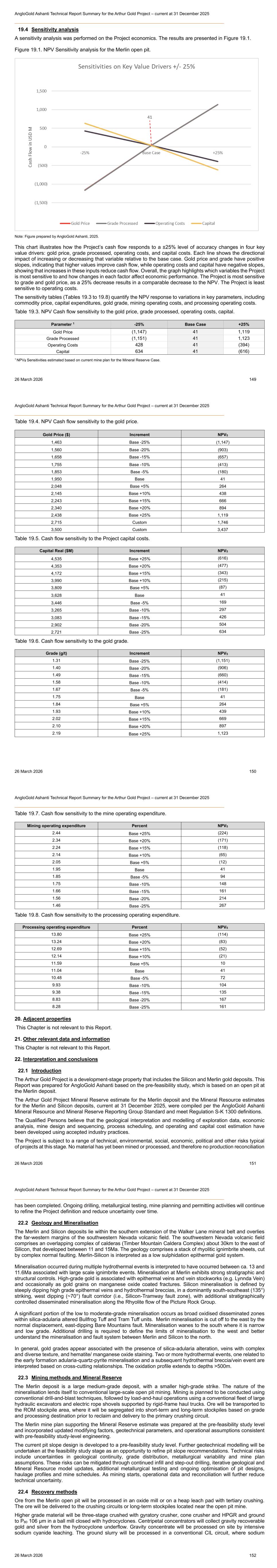 AngloGold Ashanti Technical Report Summary for the Arthur Gold Project – current at 31 December 2025 __________________________________________________________________________________________ 26 March 2026 149 19.4 Sensitivity analysis A sensitivity analysis was performed on the Project economics. The results are presented in Figure 19.1. Figure 19.1. NPV Sensitivity analysis for the Merlin open pit. Note: Figure prepared by AngloGold Ashanti, 2025. This chart illustrates how the Project’s cash flow responds to a ±25% level of accuracy changes in four key value drivers: gold price, grade processed, operating costs, and capital costs. Each line shows the directional impact of increasing or decreasing that variable relative to the base case. Gold price and grade have positive slopes, indicating that higher values improve cash flow, while operating costs and capital have negative slopes, showing that increases in these inputs reduce cash flow. Overall, the graph highlights which variables the Project is most sensitive to and how changes in each factor affect economic performance. The Project is most sensitive to grade and gold price, as a 25% decrease results in a comparable decrease to the NPV. The Project is least sensitive to operating costs. The sensitivity tables (Tables 19.3 to 19.8) quantify the NPV response to variations in key parameters, including commodity price, capital expenditures, gold grade, mining operating costs, and processing operating costs. Table 19.3. NPV Cash flow sensitivity to the gold price, grade processed, operating costs, capital. Parameter 1 -25% Base Case +25% Gold Price (1,147) 41 1,119 Grade Processed (1,151) 41 1,123 Operating Costs 428 41 (394) Capital 634 41 (616) 1 NPV5 Sensitivities estimated based on current mine plan for the Mineral Reserve Case. AngloGold Ashanti Technical Report Summary for the Arthur Gold Project – current at 31 December 2025 __________________________________________________________________________________________ 26 March 2026 150 Table 19.4. NPV Cash flow sensitivity to the gold price. Gold Price ($) Increment NPV5 1,463 Base -25% (1,147) 1,560 Base -20% (903) 1,658 Base -15% (657) 1,755 Base -10% (413) 1,853 Base -5% (180) 1,950 Base 41 2,048 Base +5% 264 2,145 Base +10% 438 2,243 Base +15% 666 2,340 Base +20% 894 2,438 Base +25% 1,119 2,715 Custom 1,746 3,500 Custom 3,437 Table 19.5. Cash flow sensitivity to the Project capital costs. Capital Real ($M) Increment NPV5 4,535 Base +25% (616) 4,353 Base +20% (477) 4,172 Base +15% (343) 3,990 Base +10% (215) 3,809 Base +5% (87) 3,628 Base 41 3,446 Base -5% 169 3,265 Base -10% 297 3,083 Base -15% 426 2,902 Base -20% 504 2,721 Base -25% 634 Table 19.6. Cash flow sensitivity to the gold grade. Grade (g/t) Increment NPV5 1.31 Base -25% (1,151) 1.40 Base -20% (906) 1.49 Base -15% (660) 1.58 Base -10% (414) 1.67 Base -5% (181) 1.75 Base 41 1.84 Base +5% 264 1.93 Base +10% 439 2.02 Base +15% 669 2.10 Base +20% 897 2.19 Base +25% 1,123 AngloGold Ashanti Technical Report Summary for the Arthur Gold Project – current at 31 December 2025 __________________________________________________________________________________________ 26 March 2026 151 Table 19.7. Cash flow sensitivity to the mine operating expenditure. Mining operating expenditure Percent NPV5 2.44 Base +25% (224) 2.34 Base +20% (171) 2.24 Base +15% (118) 2.14 Base +10% (65) 2.05 Base +5% (12) 1.95 Base 41 1.85 Base -5% 94 1.75 Base -10% 148 1.66 Base -15% 161 1.56 Base -20% 214 1.46 Base -25% 267 Table 19.8. Cash flow sensitivity to the processing operating expenditure. Processing operating expenditure Percent NPV5 13.80 Base +25% (114) 13.24 Base +20% (83) 12.69 Base +15% (52) 12.14 Base +10% (21) 11.59 Base +5% 10 11.04 Base 41 10.48 Base -5% 72 9.93 Base -10% 104 9.38 Base -15% 135 8.83 Base -20% 167 8.28 Base -25% 161 20. Adjacent properties This Chapter is not relevant to this Report. 21. Other relevant data and information This Chapter is not relevant to this Report. 22. Interpretation and conclusions 22.1 Introduction The Arthur Gold Project is a development-stage property that includes the Silicon and Merlin gold deposits. This Report was prepared for AngloGold Ashanti based on the pre-feasibility study, which is based on an open pit at the Merlin deposit. The Arthur Gold Project Mineral Reserve estimate for the Merlin deposit and the Mineral Resource estimates for the Merlin and Silicon deposits, current at 31 December 2025, were compiled per the AngloGold Ashanti Mineral Resource and Mineral Reserve Reporting Group Standard and meet Regulation S-K 1300 definitions. The Qualified Persons believe that the geological interpretation and modelling of exploration data, economic analysis, mine design and sequencing, process scheduling, and operating and capital cost estimation have been developed using accepted industry practices. The Project is subject to a range of technical, environmental, social, economic, political and other risks typical of projects at this stage. No material has yet been mined or processed, and therefore no production reconciliation AngloGold Ashanti Technical Report Summary for the Arthur Gold Project – current at 31 December 2025 __________________________________________________________________________________________ 26 March 2026 152 has been completed. Ongoing drilling, metallurgical testing, mine planning and permitting activities will continue to refine the Project definition and reduce uncertainty over time. 22.2 Geology and Mineralisation The Merlin and Silicon deposits lie within the southern extension of the Walker Lane mineral belt and overlies the far-western margins of the southwestern Nevada volcanic field. The southwestern Nevada volcanic field comprises an overlapping complex of calderas (Timber Mountain Caldera Complex) about 30km to the east of Silicon, that developed between 11 and 15Ma. The geology comprises a stack of rhyolitic ignimbrite sheets, cut by complex normal fa