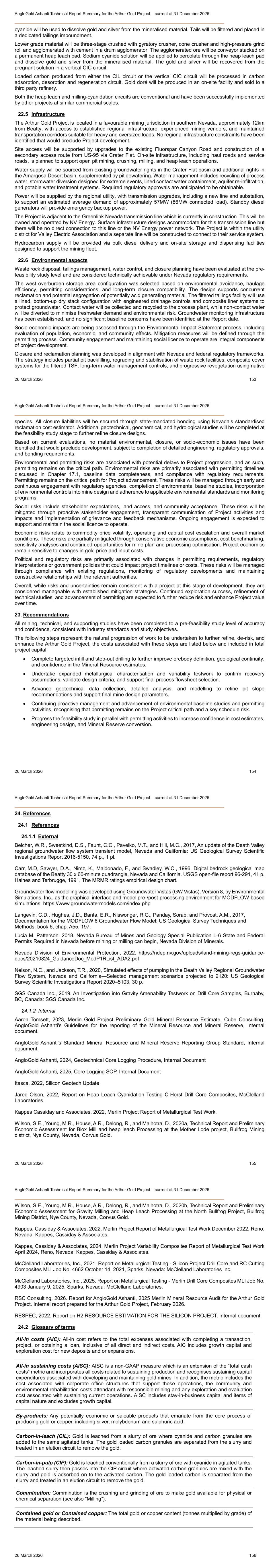 AngloGold Ashanti Technical Report Summary for the Arthur Gold Project – current at 31 December 2025 __________________________________________________________________________________________ 26 March 2026 153 cyanide will be used to dissolve gold and silver from the mineralised material. Tails will be filtered and placed in a dedicated tailings impoundment. Lower grade material will be three-stage crushed with gyratory crusher, cone crusher and high-pressure grind roll and agglomerated with cement in a drum agglomerator. The agglomerated ore will be conveyor stacked on a permanent heap leach pad. Sodium cyanide solution will be applied to percolate through the heap leach pad and dissolve gold and silver from the mineralised material. The gold and silver will be recovered from the pregnant solution in a vertical CIC circuit. Loaded carbon produced from either the CIL circuit or the vertical CIC circuit will be processed in carbon adsorption, desorption and regeneration circuit. Gold doré will be produced in an on-site facility and sold to a third party refinery. Both the heap leach and milling-cyanidation circuits are conventional and have been successfully implemented by other projects at similar commercial scales. 22.5 Infrastructure The Arthur Gold Project is located in a favourable mining jurisdiction in southern Nevada, approximately 12km from Beatty, with access to established regional infrastructure, experienced mining vendors, and maintained transportation corridors suitable for heavy and oversized loads. No regional infrastructure constraints have been identified that would preclude Project development. Site access will be supported by upgrades to the existing Fluorspar Canyon Road and construction of a secondary access route from US-95 via Crater Flat. On-site infrastructure, including haul roads and service roads, is planned to support open pit mining, crushing, milling, and heap leach operations. Water supply will be sourced from existing groundwater rights in the Crater Flat basin and additional rights in the Amargosa Desert basin, supplemented by pit dewatering. Water management includes recycling of process water, stormwater diversion designed for extreme events, lined contact water containment, aquifer re-infiltration, and potable water treatment systems. Required regulatory approvals are anticipated to be obtainable. Power will be supplied by the regional utility, with transmission upgrades, including a new line and substation, to support an estimated average demand of approximately 57MW (86MW connected load). Standby diesel generators will provide emergency backup power. The Project is adjacent to the Greenlink Nevada transmission line which is currently in construction. This will be owned and operated by NV Energy. Surface infrastructure designs accommodate for this transmission line but there will be no direct connection to this line or the NV Energy power network. The Project is within the utility district for Valley Electric Association and a separate line will be constructed to connect to their service system. Hydrocarbon supply will be provided via bulk diesel delivery and on-site storage and dispensing facilities designed to support the mining fleet. 22.6 Environmental aspects Waste rock disposal, tailings management, water control, and closure planning have been evaluated at the pre- feasibility study level and are considered technically achievable under Nevada regulatory requirements. The west overburden storage area configuration was selected based on environmental avoidance, haulage efficiency, permitting considerations, and long-term closure compatibility. The design supports concurrent reclamation and potential segregation of potentially acid generating material. The filtered tailings facility will use a lined, bottom-up dry stack configuration with engineered drainage controls and composite liner systems to protect groundwater. Contact water will be collected and recycled to the process plant, while non-contact water will be diverted to minimise freshwater demand and environmental risk. Groundwater monitoring infrastructure has been established, and no significant baseline concerns have been identified at the Report date. Socio-economic impacts are being assessed through the Environmental Impact Statement process, including evaluation of population, economic, and community effects. Mitigation measures will be defined through the permitting process. Community engagement and maintaining social licence to operate are integral components of project development. Closure and reclamation planning was developed in alignment with Nevada and federal regulatory frameworks. The strategy includes partial pit backfilling, regrading and stabilisation of waste rock facilities, composite cover systems for the filtered TSF, long-term water management controls, and progressive revegetation using native AngloGold Ashanti Technical Report Summary for the Arthur Gold Project – current at 31 December 2025 __________________________________________________________________________________________ 26 March 2026 154 species. All closure liabilities will be secured through state-mandated bonding using Nevada’s standardised reclamation cost estimator. Additional geotechnical, geochemical, and hydrological studies will be completed at the feasibility study stage to further refine closure designs. Based on current evaluations, no material environmental, closure, or socio-economic issues have been identified that would preclude development, subject to completion of detailed engineering, regulatory approvals, and bonding requirements. Environmental and permitting risks are associated with potential delays to Project progression, and as such, permitting remains on the critical path. Environmental risks are primarily associated with permitting timelines discussed in Chapter 17.1, baseline data completeness, and compliance with regulatory requirements. Permitting remains on the critic