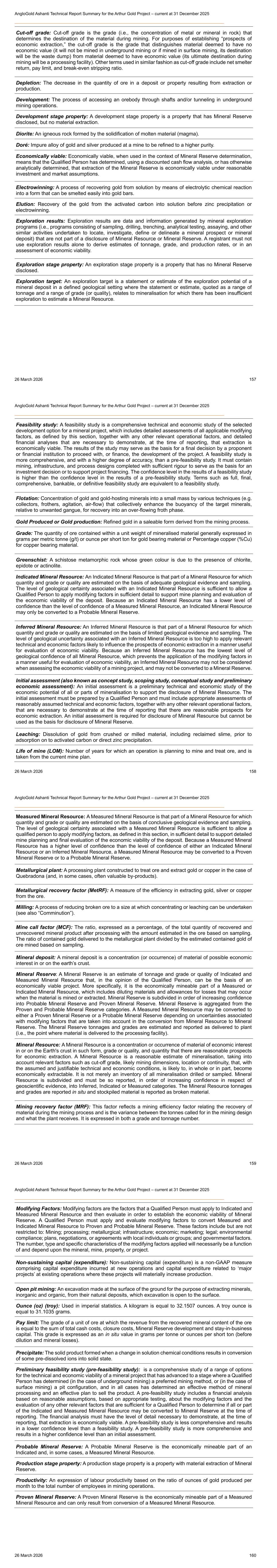 AngloGold Ashanti Technical Report Summary for the Arthur Gold Project – current at 31 December 2025 __________________________________________________________________________________________ 26 March 2026 157 Cut-off grade: Cut-off grade is the grade (i.e., the concentration of metal or mineral in rock) that determines the destination of the material during mining. For purposes of establishing “prospects of economic extraction,” the cut-off grade is the grade that distinguishes material deemed to have no economic value (it will not be mined in underground mining or if mined in surface mining, its destination will be the waste dump) from material deemed to have economic value (its ultimate destination during mining will be a processing facility). Other terms used in similar fashion as cut-off grade include net smelter return, pay limit, and break-even stripping ratio. Depletion: The decrease in the quantity of ore in a deposit or property resulting from extraction or production. Development: The process of accessing an orebody through shafts and/or tunneling in underground mining operations. Development stage property: A development stage property is a property that has Mineral Reserve disclosed, but no material extraction. Diorite: An igneous rock formed by the solidification of molten material (magma). Doré: Impure alloy of gold and silver produced at a mine to be refined to a higher purity. Economically viable: Economically viable, when used in the context of Mineral Reserve determination, means that the Qualified Person has determined, using a discounted cash flow analysis, or has otherwise analytically determined, that extraction of the Mineral Reserve is economically viable under reasonable investment and market assumptions. Electrowinning: A process of recovering gold from solution by means of electrolytic chemical reaction into a form that can be smelted easily into gold bars. Elution: Recovery of the gold from the activated carbon into solution before zinc precipitation or electrowinning. Exploration results: Exploration results are data and information generated by mineral exploration programs (i.e., programs consisting of sampling, drilling, trenching, analytical testing, assaying, and other similar activities undertaken to locate, investigate, define or delineate a mineral prospect or mineral deposit) that are not part of a disclosure of Mineral Resource or Mineral Reserve. A registrant must not use exploration results alone to derive estimates of tonnage, grade, and production rates, or in an assessment of economic viability. Exploration stage property: An exploration stage property is a property that has no Mineral Reserve disclosed. Exploration target: An exploration target is a statement or estimate of the exploration potential of a mineral deposit in a defined geological setting where the statement or estimate, quoted as a range of tonnage and a range of grade (or quality), relates to mineralisation for which there has been insufficient exploration to estimate a Mineral Resource. AngloGold Ashanti Technical Report Summary for the Arthur Gold Project – current at 31 December 2025 __________________________________________________________________________________________ 26 March 2026 158 Feasibility study: A feasibility study is a comprehensive technical and economic study of the selected development option for a mineral project, which includes detailed assessments of all applicable modifying factors, as defined by this section, together with any other relevant operational factors, and detailed financial analyses that are necessary to demonstrate, at the time of reporting, that extraction is economically viable. The results of the study may serve as the basis for a final decision by a proponent or financial institution to proceed with, or finance, the development of the project. A feasibility study is more comprehensive, and with a higher degree of accuracy, than a pre-feasibility study. It must contain mining, infrastructure, and process designs completed with sufficient rigour to serve as the basis for an investment decision or to support project financing. The confidence level in the results of a feasibility study is higher than the confidence level in the results of a pre-feasibility study. Terms such as full, final, comprehensive, bankable, or definitive feasibility study are equivalent to a feasibility study. Flotation: Concentration of gold and gold-hosting minerals into a small mass by various techniques (e.g. collectors, frothers, agitation, air-flow) that collectively enhance the buoyancy of the target minerals, relative to unwanted gangue, for recovery into an over-flowing froth phase. Gold Produced or Gold production: Refined gold in a saleable form derived from the mining process. Grade: The quantity of ore contained within a unit weight of mineralised material generally expressed in grams per metric tonne (g/t) or ounce per short ton for gold bearing material or Percentage copper (%Cu) for copper bearing material. Greenschist: A schistose metamorphic rock whose green colour is due to the presence of chlorite, epidote or actinolite. Indicated Mineral Resource: An Indicated Mineral Resource is that part of a Mineral Resource for which quantity and grade or quality are estimated on the basis of adequate geological evidence and sampling. The level of geological certainty associated with an Indicated Mineral Resource is sufficient to allow a Qualified Person to apply modifying factors in sufficient detail to support mine planning and evaluation of the economic viability of the deposit. Because an Indicated Mineral Resource has a lower level of confidence than the level of confidence of a Measured Mineral Resource, an Indicated Mineral Resource may only be converted to a Probable Mineral Reserve. Inferred Mineral Resource: An Inferred Mineral Resource is that part of a Mineral Resource for which quantity and grade or quality are estimated on the basis of l