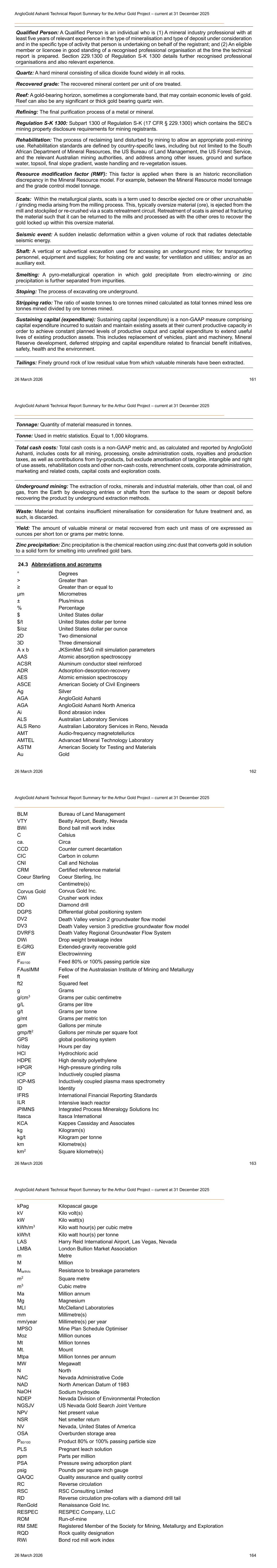 AngloGold Ashanti Technical Report Summary for the Arthur Gold Project – current at 31 December 2025 __________________________________________________________________________________________ 26 March 2026 161 Qualified Person: A Qualified Person is an individual who is (1) A mineral industry professional with at least five years of relevant experience in the type of mineralisation and type of deposit under consideration and in the specific type of activity that person is undertaking on behalf of the registrant; and (2) An eligible member or licencee in good standing of a recognised professional organisation at the time the technical report is prepared. Section 229.1300 of Regulation S-K 1300 details further recognised professional organisations and also relevant experience. Quartz: A hard mineral consisting of silica dioxide found widely in all rocks. Recovered grade: The recovered mineral content per unit of ore treated. Reef: A gold-bearing horizon, sometimes a conglomerate band, that may contain economic levels of gold. Reef can also be any significant or thick gold bearing quartz vein. Refining: The final purification process of a metal or mineral. Regulation S-K 1300: Subpart 1300 of Regulation S-K (17 CFR § 229.1300) which contains the SEC’s mining property disclosure requirements for mining registrants. Rehabilitation: The process of reclaiming land disturbed by mining to allow an appropriate post-mining use. Rehabilitation standards are defined by country-specific laws, including but not limited to the South African Department of Mineral Resources, the US Bureau of Land Management, the US Forest Service, and the relevant Australian mining authorities, and address among other issues, ground and surface water, topsoil, final slope gradient, waste handling and re-vegetation issues. Resource modification factor (RMF): This factor is applied when there is an historic reconciliation discrepancy in the Mineral Resource model. For example, between the Mineral Resource model tonnage and the grade control model tonnage. It is expressed in both a grade and tonnage number. Scats: Within the metallurgical plants, scats is a term used to describe ejected ore or other uncrushable / grinding media arising from the milling process. This, typically oversize material (ore), is ejected from the mill and stockpiled or re-crushed via a scats retreatment circuit. Retreatment of scats is aimed at fracturing the material such that it can be returned to the mills and processed as with the other ores to recover the gold locked up within this oversize material. Seismic event: A sudden inelastic deformation within a given volume of rock that radiates detectable seismic energy. Shaft: A vertical or subvertical excavation used for accessing an underground mine; for transporting personnel, equipment and supplies; for hoisting ore and waste; for ventilation and utilities; and/or as an auxiliary exit. Smelting: A pyro-metallurgical operation in which gold precipitate from electro-winning or zinc precipitation is further separated from impurities. Stoping: The process of excavating ore underground. Stripping ratio: The ratio of waste tonnes to ore tonnes mined calculated as total tonnes mined less ore tonnes mined divided by ore tonnes mined. Sustaining capital (expenditure): Sustaining capital (expenditure) is a non-GAAP measure comprising capital expenditure incurred to sustain and maintain existing assets at their current productive capacity in order to achieve constant planned levels of productive output and capital expenditure to extend useful lives of existing production assets. This includes replacement of vehicles, plant and machinery, Mineral Reserve development, deferred stripping and capital expenditure related to financial benefit initiatives, safety, health and the environment. Tailings: Finely ground rock of low residual value from which valuable minerals have been extracted. AngloGold Ashanti Technical Report Summary for the Arthur Gold Project – current at 31 December 2025 __________________________________________________________________________________________ 26 March 2026 162 Tonnage: Quantity of material measured in tonnes. Tonne: Used in metric statistics. Equal to 1,000 kilograms. Total cash costs: Total cash costs is a non-GAAP metric and, as calculated and reported by AngloGold Ashanti, includes costs for all mining, processing, onsite administration costs, royalties and production taxes, as well as contributions from by-products, but exclude amortisation of tangible, intangible and right of use assets, rehabilitation costs and other non-cash costs, retrenchment costs, corporate administration, marketing and related costs, capital costs and exploration costs. Underground mining: The extraction of rocks, minerals and industrial materials, other than coal, oil and gas, from the Earth by developing entries or shafts from the surface to the seam or deposit before recovering the product by underground extraction methods. Waste: Material that contains insufficient mineralisation for consideration for future treatment and, as such, is discarded. Yield: The amount of valuable mineral or metal recovered from each unit mass of ore expressed as ounces per short ton or grams per metric tonne. Zinc precipitation: Zinc precipitation is the chemical reaction using zinc dust that converts gold in solution to a solid form for smelting into unrefined gold bars. 24.3 Abbreviations and acronyms ° Degrees > Greater than ≥ Greater than or equal to µm Micrometres ± Plus/minus % Percentage $ United States dollar $/t United States dollar per tonne $/oz United States dollar per ounce 2D Two dimensional 3D Three dimensional A x b JKSimMet SAG mill simulation parameters AAS Atomic absorption spectroscopy ACSR Aluminum conductor steel reinforced ADR Adsorption-desorption-recovery AES Atomic emission spectroscopy ASCE American Society of Civil Engineers Ag Silver AGA AngloGold Ashanti AGA AngloGold Ashanti