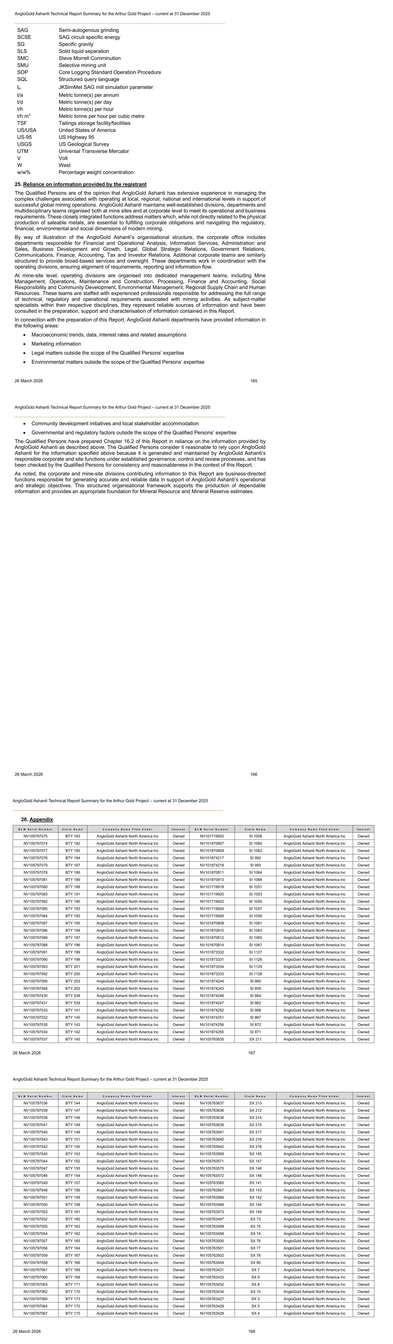 AngloGold Ashanti Technical Report Summary for the Arthur Gold Project – current at 31 December 2025 __________________________________________________________________________________________ 26 March 2026 165 SAG Semi-autogenous grinding SCSE SAG circuit specific energy SG Specific gravity SLS Solid liquid separation SMC Steve Morrell Comminution SMU Selective mining unit SOP Core Logging Standard Operation Procedure SQL Structured query language ta JKSimMet SAG mill simulation parameter t/a Metric tonne(s) per annum t/d Metric tonne(s) per day t/h Metric tonne(s) per hour t/h m3 Metric tonne per hour per cubic metre TSF Tailings storage facility/facilities US/USA United States of America US-95 US Highway 95 USGS US Geological Survey UTM Universal Transverse Mercator V Volt W West w/w% Percentage weight concentration 25. Reliance on information provided by the registrant The Qualified Persons are of the opinion that AngloGold Ashanti has extensive experience in managing the complex challenges associated with operating at local, regional, national and international levels in support of successful global mining operations. AngloGold Ashanti maintains well-established divisions, departments and multidisciplinary teams organised both at mine sites and at corporate level to meet its operational and business requirements. These closely integrated functions address matters which, while not directly related to the physical production of saleable metals, are essential to fulfilling corporate obligations and navigating the regulatory, financial, environmental and social dimensions of modern mining. By way of illustration of the AngloGold Ashanti’s organisational structure, the corporate office includes departments responsible for Financial and Operational Analysis, Information Services, Administration and Sales, Business Development and Growth, Legal, Global Strategic Relations, Government Relations, Communications, Finance, Accounting, Tax and Investor Relations. Additional corporate teams are similarly structured to provide broad-based services and oversight. These departments work in coordination with the operating divisions, ensuring alignment of requirements, reporting and information flow. At mine-site level, operating divisions are organised into dedicated management teams, including Mine Management, Operations, Maintenance and Construction, Processing, Finance and Accounting, Social Responsibility and Community Development, Environmental Management, Regional Supply Chain and Human Resources. These teams are staffed with experienced professionals responsible for addressing the full range of technical, regulatory and operational requirements associated with mining activities. As subject-matter specialists within their respective disciplines, they represent reliable sources of information and have been consulted in the preparation, support and characterisation of information contained in this Report. In connection with the preparation of this Report, AngloGold Ashanti departments have provided information in the following areas: • Macroeconomic trends, data, interest rates and related assumptions • Marketing information • Legal matters outside the scope of the Qualified Persons’ expertise • Environmental matters outside the scope of the Qualified Persons’ expertise AngloGold Ashanti Technical Report Summary for the Arthur Gold Project – current at 31 December 2025 __________________________________________________________________________________________ 26 March 2026 166 • Community development initiatives and local stakeholder accommodation • Governmental and regulatory factors outside the scope of the Qualified Persons’ expertise The Qualified Persons have prepared Chapter 16.2 of this Report in reliance on the information provided by AngloGold Ashanti as described above. The Qualified Persons consider it reasonable to rely upon AngloGold Ashanti for the information specified above because it is generated and maintained by AngloGold Ashanti’s responsible corporate and site functions under established governance, control and review processes, and has been checked by the Qualified Persons for consistency and reasonableness in the context of this Report. As noted, the corporate and mine-site divisions contributing information to this Report are business-directed functions responsible for generating accurate and reliable data in support of AngloGold Ashanti’s operational and strategic objectives. This structured organisational framework supports the production of dependable information and provides an appropriate foundation for Mineral Resource and Mineral Reserve estimates. AngloGold Ashanti Technical Report Summary for the Arthur Gold Project – current at 31 December 2025 __________________________________________________________________________________________ 26 March 2026 167 26. Appendix B L M S e r i a l N u m b e r C l a i m N a m e C o m p a n y N a m e F i l e d U n d e r I n t e r e s t B L M S e r i a l N u m b e r C l a i m N a m e C o m p a n y N a m e F i l e d U n d e r I n t e r e s t NV105797075 BTY 183 AngloGold Ashanti North America Inc Owned NV101719925 SI 1058 AngloGold Ashanti North America Inc Owned NV105797074 BTY 182 AngloGold Ashanti North America Inc Owned NV101870807 SI 1060 AngloGold Ashanti North America Inc Owned NV105797077 BTY 185 AngloGold Ashanti North America Inc Owned NV101870809 SI 1062 AngloGold Ashanti North America Inc Owned NV105797076 BTY 184 AngloGold Ashanti North America Inc Owned NV101874217 SI 992 AngloGold Ashanti North America Inc Owned NV105797079 BTY 187 AngloGold Ashanti North America Inc Owned NV101874218 SI 993 AngloGold Ashanti North America Inc Owned NV105797078 BTY 186 AngloGold Ashanti North America Inc Owned NV101870811 SI 1064 AngloGold Ashanti North America Inc Owned NV105797081 BTY 189 AngloGold Ashanti North America Inc Owned NV101870813 SI 1066 AngloGold Ashanti North America Inc Owned NV105797080 B