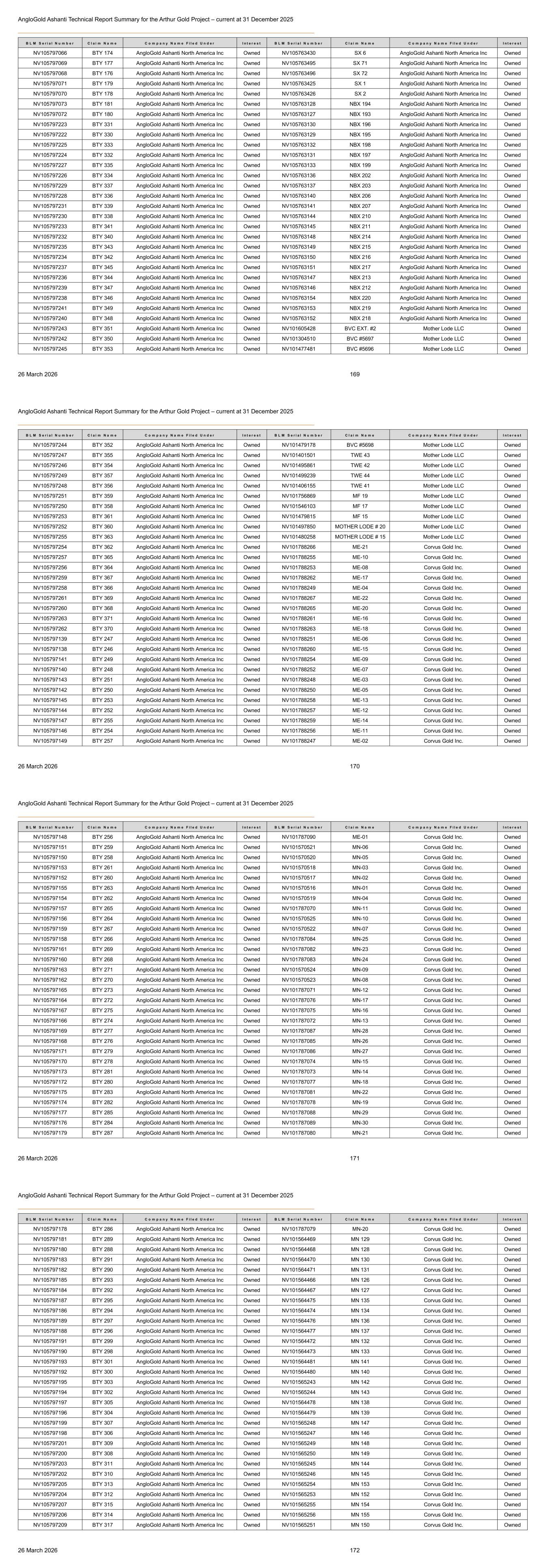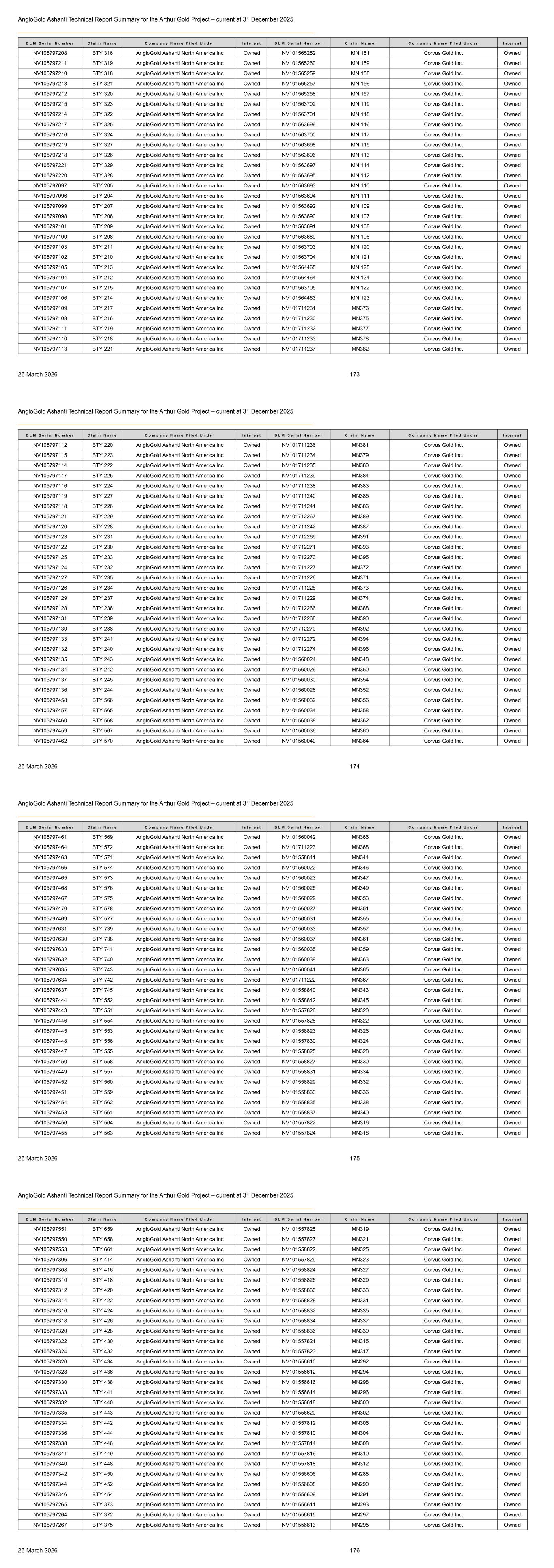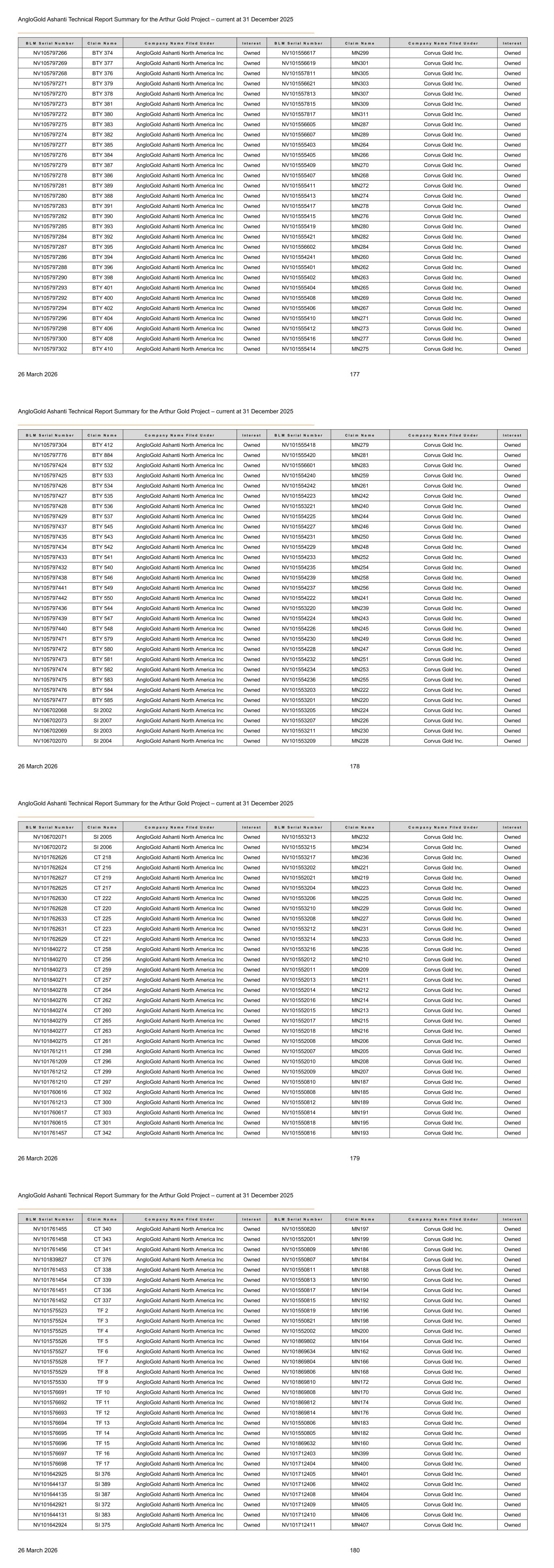 AngloGold Ashanti Technical Report Summary for the Arthur Gold Project – current at 31 December 2025 __________________________________________________________________________________________ 26 March 2026 173 B L M S e r i a l N u m b e r C l a i m N a m e C o m p a n y N a m e F i l e d U n d e r I n t e r e s t B L M S e r i a l N u m b e r C l a i m N a m e C o m p a n y N a m e F i l e d U n d e r I n t e r e s t NV105797208 BTY 316 AngloGold Ashanti North America Inc Owned NV101565252 MN 151 Corvus Gold Inc. Owned NV105797211 BTY 319 AngloGold Ashanti North America Inc Owned NV101565260 MN 159 Corvus Gold Inc. Owned NV105797210 BTY 318 AngloGold Ashanti North America Inc Owned NV101565259 MN 158 Corvus Gold Inc. Owned NV105797213 BTY 321 AngloGold Ashanti North America Inc Owned NV101565257 MN 156 Corvus Gold Inc. Owned NV105797212 BTY 320 AngloGold Ashanti North America Inc Owned NV101565258 MN 157 Corvus Gold Inc. Owned NV105797215 BTY 323 AngloGold Ashanti North America Inc Owned NV101563702 MN 119 Corvus Gold Inc. Owned NV105797214 BTY 322 AngloGold Ashanti North America Inc Owned NV101563701 MN 118 Corvus Gold Inc. Owned NV105797217 BTY 325 AngloGold Ashanti North America Inc Owned NV101563699 MN 116 Corvus Gold Inc. Owned NV105797216 BTY 324 AngloGold Ashanti North America Inc Owned NV101563700 MN 117 Corvus Gold Inc. Owned NV105797219 BTY 327 AngloGold Ashanti North America Inc Owned NV101563698 MN 115 Corvus Gold Inc. Owned NV105797218 BTY 326 AngloGold Ashanti North America Inc Owned NV101563696 MN 113 Corvus Gold Inc. Owned NV105797221 BTY 329 AngloGold Ashanti North America Inc Owned NV101563697 MN 114 Corvus Gold Inc. Owned NV105797220 BTY 328 AngloGold Ashanti North America Inc Owned NV101563695 MN 112 Corvus Gold Inc. Owned NV105797097 BTY 205 AngloGold Ashanti North America Inc Owned NV101563693 MN 110 Corvus Gold Inc. Owned NV105797096 BTY 204 AngloGold Ashanti North America Inc Owned NV101563694 MN 111 Corvus Gold Inc. Owned NV105797099 BTY 207 AngloGold Ashanti North America Inc Owned NV101563692 MN 109 Corvus Gold Inc. Owned NV105797098 BTY 206 AngloGold Ashanti North America Inc Owned NV101563690 MN 107 Corvus Gold Inc. Owned NV105797101 BTY 209 AngloGold Ashanti North America Inc Owned NV101563691 MN 108 Corvus Gold Inc. Owned NV105797100 BTY 208 AngloGold Ashanti North America Inc Owned NV101563689 MN 106 Corvus Gold Inc. Owned NV105797103 BTY 211 AngloGold Ashanti North America Inc Owned NV101563703 MN 120 Corvus Gold Inc. Owned NV105797102 BTY 210 AngloGold Ashanti North America Inc Owned NV101563704 MN 121 Corvus Gold Inc. Owned NV105797105 BTY 213 AngloGold Ashanti North America Inc Owned NV101564465 MN 125 Corvus Gold Inc. Owned NV105797104 BTY 212 AngloGold Ashanti North America Inc Owned NV101564464 MN 124 Corvus Gold Inc. Owned NV105797107 BTY 215 AngloGold Ashanti North America Inc Owned NV101563705 MN 122 Corvus Gold Inc. Owned NV105797106 BTY 214 AngloGold Ashanti North America Inc Owned NV101564463 MN 123 Corvus Gold Inc. Owned NV105797109 BTY 217 AngloGold Ashanti North America Inc Owned NV101711231 MN376 Corvus Gold Inc. Owned NV105797108 BTY 216 AngloGold Ashanti North America Inc Owned NV101711230 MN375 Corvus Gold Inc. Owned NV105797111 BTY 219 AngloGold Ashanti North America Inc Owned NV101711232 MN377 Corvus Gold Inc. Owned NV105797110 BTY 218 AngloGold Ashanti North America Inc Owned NV101711233 MN378 Corvus Gold Inc. Owned NV105797113 BTY 221 AngloGold Ashanti North America Inc Owned NV101711237 MN382 Corvus Gold Inc. Owned AngloGold Ashanti Technical Report Summary for the Arthur Gold Project – current at 31 December 2025 __________________________________________________________________________________________ 26 March 2026 174 B L M S e r i a l N u m b e r C l a i m N a m e C o m p a n y N a m e F i l e d U n d e r I n t e r e s t B L M S e r i a l N u m b e r C l a i m N a m e C o m p a n y N a m e F i l e d U n d e r I n t e r e s t NV105797112 BTY 220 AngloGold Ashanti North America Inc Owned NV101711236 MN381 Corvus Gold Inc. Owned NV105797115 BTY 223 AngloGold Ashanti North America Inc Owned NV101711234 MN379 Corvus Gold Inc. Owned NV105797114 BTY 222 AngloGold Ashanti North America Inc Owned NV101711235 MN380 Corvus Gold Inc. Owned NV105797117 BTY 225 AngloGold Ashanti North America Inc Owned NV101711239 MN384 Corvus Gold Inc. Owned NV105797116 BTY 224 AngloGold Ashanti North America Inc Owned NV101711238 MN383 Corvus Gold Inc. Owned NV105797119 BTY 227 AngloGold Ashanti North America Inc Owned NV101711240 MN385 Corvus Gold Inc. Owned NV105797118 BTY 226 AngloGold Ashanti North America Inc Owned NV101711241 MN386 Corvus Gold Inc. Owned NV105797121 BTY 229 AngloGold Ashanti North America Inc Owned NV101712267 MN389 Corvus Gold Inc. Owned NV105797120 BTY 228 AngloGold Ashanti North America Inc Owned NV101711242 MN387 Corvus Gold Inc. Owned NV105797123 BTY 231 AngloGold Ashanti North America Inc Owned NV101712269 MN391 Corvus Gold Inc. Owned NV105797122 BTY 230 AngloGold Ashanti North America Inc Owned NV101712271 MN393 Corvus Gold Inc. Owned NV105797125 BTY 233 AngloGold Ashanti North America Inc Owned NV101712273 MN395 Corvus Gold Inc. Owned NV105797124 BTY 232 AngloGold Ashanti North America Inc Owned NV101711227 MN372 Corvus Gold Inc. Owned NV105797127 BTY 235 AngloGold Ashanti North America Inc Owned NV101711226 MN371 Corvus Gold Inc. Owned NV105797126 BTY 234 AngloGold Ashanti North America Inc Owned NV101711228 MN373 Corvus Gold Inc. Owned NV105797129 BTY 237 AngloGold Ashanti North America Inc Owned NV101711229 MN374 Corvus Gold Inc. Owned NV105797128 BTY 236 AngloGold Ashanti North America Inc Owned NV101712266 MN388 Corvus Gold Inc. Owned NV105797131 BTY 239 AngloGold Ashanti North America Inc Owned NV101712268 MN390 Corvus Gold Inc. Owned NV105797130 BTY 238 AngloGold Ashanti North America Inc Owned NV101712270 MN392 Corvus Gold Inc. Owned NV105797133 BTY 241 AngloGold Ashanti North America Inc Owned NV101712272 MN394 