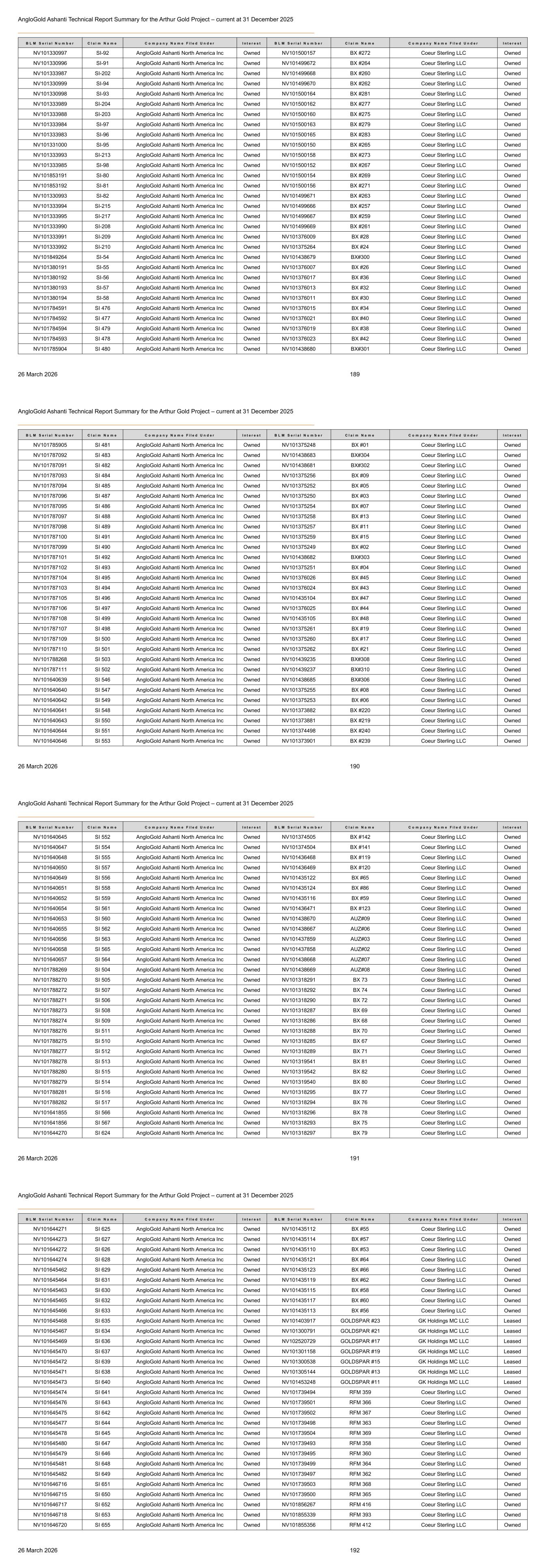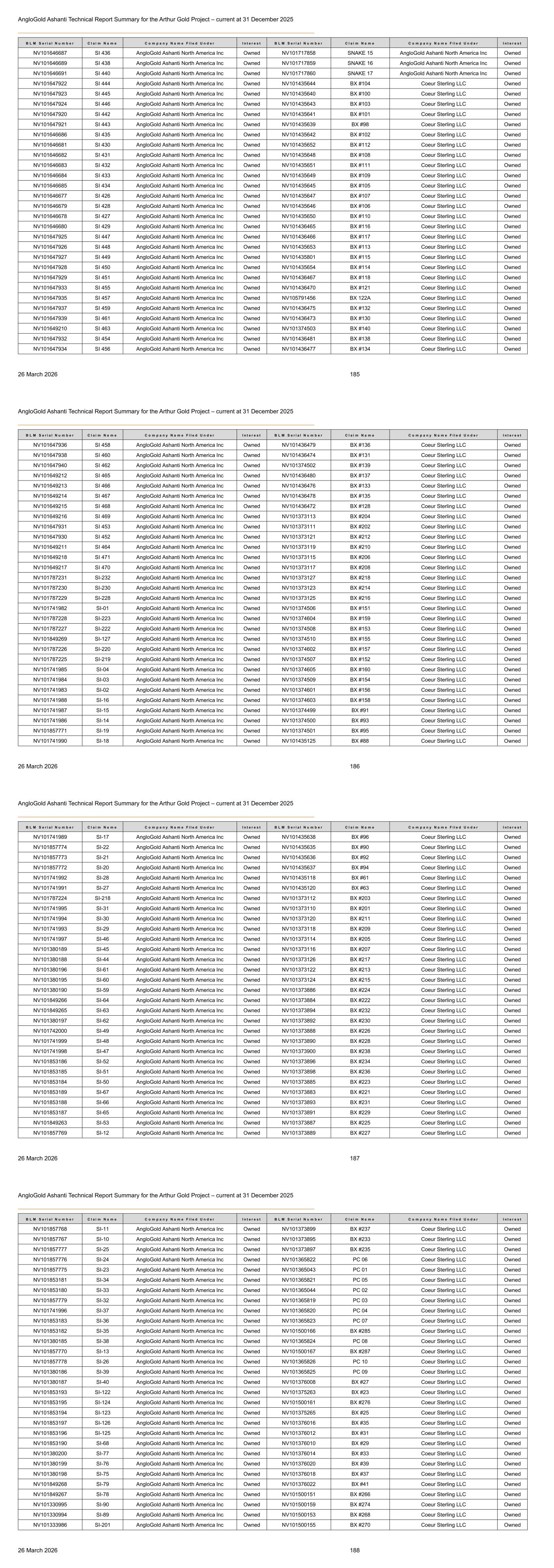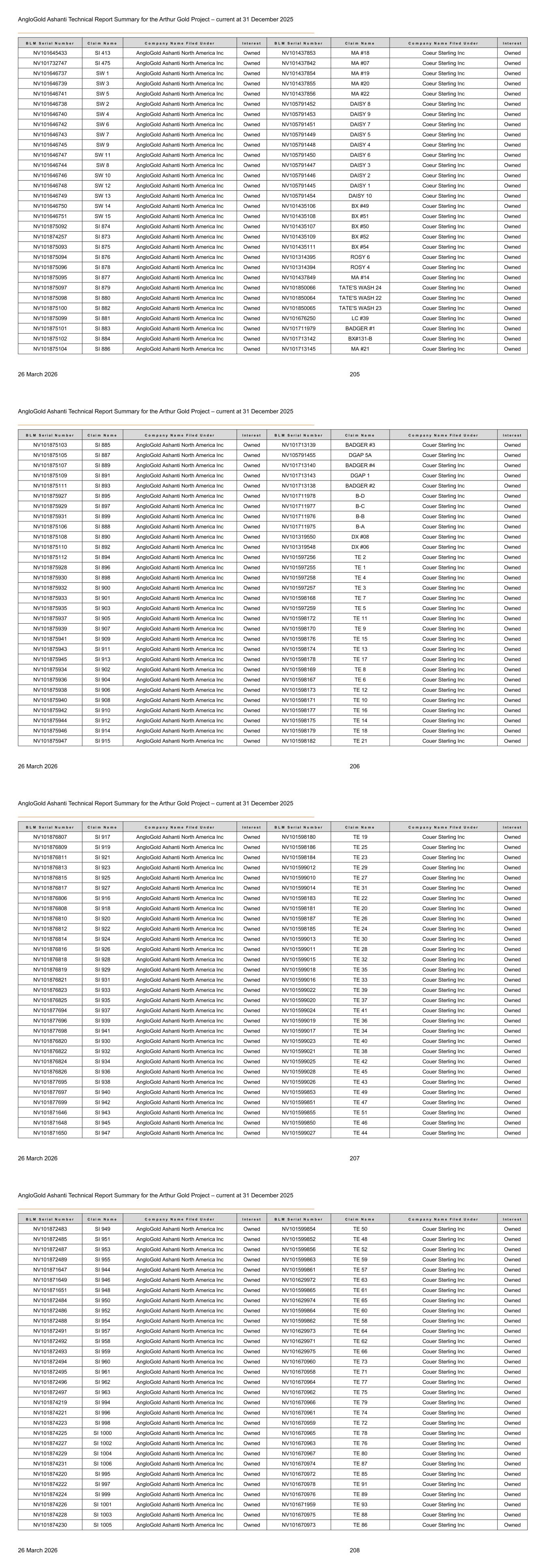AngloGold Ashanti Technical Report Summary for the Arthur Gold Project – current at 31 December 2025 __________________________________________________________________________________________ 26 March 2026 197 B L M S e r i a l N u m b e r C l a i m N a m e C o m p a n y N a m e F i l e d U n d e r I n t e r e s t B L M S e r i a l N u m b e r C l a i m N a m e C o m p a n y N a m e F i l e d U n d e r I n t e r e s t NV101643062 SI 595 AngloGold Ashanti North America Inc Owned NV101789461 RFM 112 Coeur Sterling Inc Owned NV101643063 SI 596 AngloGold Ashanti North America Inc Owned NV101789459 RFM 110 Coeur Sterling Inc Owned NV101643056 SI 589 AngloGold Ashanti North America Inc Owned NV101789460 RFM 111 Coeur Sterling Inc Owned NV101643071 SI 604 AngloGold Ashanti North America Inc Owned NV101789456 RFM 107 Coeur Sterling Inc Owned NV101643069 SI 602 AngloGold Ashanti North America Inc Owned NV101739487 RFM 468 Coeur Sterling Inc Owned NV101643067 SI 600 AngloGold Ashanti North America Inc Owned NV101739488 RFM 469 Coeur Sterling Inc Owned NV101644256 SI 610 AngloGold Ashanti North America Inc Owned NV101739490 RFM 471 Coeur Sterling Inc Owned NV101644254 SI 608 AngloGold Ashanti North America Inc Owned NV101739489 RFM 470 Coeur Sterling Inc Owned NV101643073 SI 606 AngloGold Ashanti North America Inc Owned NV101855571 RFM 34 Coeur Sterling Inc Owned NV101644257 SI 611 AngloGold Ashanti North America Inc Owned NV101855564 RFM 27 Coeur Sterling Inc Owned NV101644262 SI 616 AngloGold Ashanti North America Inc Owned NV101855573 RFM 36 Coeur Sterling Inc Owned NV101644260 SI 614 AngloGold Ashanti North America Inc Owned NV105234541 RFM 24 Coeur Sterling Inc Owned NV101644258 SI 612 AngloGold Ashanti North America Inc Owned NV101855566 RFM 29 Coeur Sterling Inc Owned NV101644268 SI 622 AngloGold Ashanti North America Inc Owned NV101855563 RFM 26 Coeur Sterling Inc Owned NV101644266 SI 620 AngloGold Ashanti North America Inc Owned NV101855572 RFM 35 Coeur Sterling Inc Owned NV101644263 SI 617 AngloGold Ashanti North America Inc Owned NV101855565 RFM 28 Coeur Sterling Inc Owned NV101644261 SI 615 AngloGold Ashanti North America Inc Owned NV101855568 RFM 31 Coeur Sterling Inc Owned NV101644259 SI 613 AngloGold Ashanti North America Inc Owned NV101855574 RFM 37 Coeur Sterling Inc Owned NV101644269 SI 623 AngloGold Ashanti North America Inc Owned NV101855575 RFM 38 Coeur Sterling Inc Owned NV101644267 SI 621 AngloGold Ashanti North America Inc Owned NV101855567 RFM 30 Coeur Sterling Inc Owned NV101644286 SI 715 AngloGold Ashanti North America Inc Owned NV101855569 RFM 32 Coeur Sterling Inc Owned NV101644285 SI 714 AngloGold Ashanti North America Inc Owned NV101641732 RFM 147 Coeur Sterling Inc Owned NV101643085 SI 693 AngloGold Ashanti North America Inc Owned NV101640633 RFM 138 Coeur Sterling Inc Owned NV101644265 SI 619 AngloGold Ashanti North America Inc Owned NV101640635 RFM 140 Coeur Sterling Inc Owned NV101644264 SI 618 AngloGold Ashanti North America Inc Owned NV101855597 RFM 81 Coeur Sterling Inc Owned NV101644293 SI 722 AngloGold Ashanti North America Inc Owned NV101855598 RFM 82 Coeur Sterling Inc Owned NV101644291 SI 720 AngloGold Ashanti North America Inc Owned NV101855596 RFM 80 Coeur Sterling Inc Owned NV101645486 SI 728 AngloGold Ashanti North America Inc Owned NV101855593 RFM 77 Coeur Sterling Inc Owned NV101645484 SI 726 AngloGold Ashanti North America Inc Owned NV101855592 RFM 76 Coeur Sterling Inc Owned NV101644295 SI 724 AngloGold Ashanti North America Inc Owned NV101855594 RFM 78 Coeur Sterling Inc Owned AngloGold Ashanti Technical Report Summary for the Arthur Gold Project – current at 31 December 2025 __________________________________________________________________________________________ 26 March 2026 198 B L M S e r i a l N u m b e r C l a i m N a m e C o m p a n y N a m e F i l e d U n d e r I n t e r e s t B L M S e r i a l N u m b e r C l a i m N a m e C o m p a n y N a m e F i l e d U n d e r I n t e r e s t NV101644289 SI 718 AngloGold Ashanti North America Inc Owned NV101855591 RFM 75 Coeur Sterling Inc Owned NV101644287 SI 716 AngloGold Ashanti North America Inc Owned NV101855595 RFM 79 Coeur Sterling Inc Owned NV101644294 SI 723 AngloGold Ashanti North America Inc Owned NV101855570 RFM 33 Coeur Sterling Inc Owned NV101644292 SI 721 AngloGold Ashanti North America Inc Owned NV101738569 RFM 463 Coeur Sterling Inc Owned NV101645487 SI 729 AngloGold Ashanti North America Inc Owned NV101738568 RFM 462 Coeur Sterling Inc Owned NV101645485 SI 727 AngloGold Ashanti North America Inc Owned NV101738567 RFM 461 Coeur Sterling Inc Owned NV101645483 SI 725 AngloGold Ashanti North America Inc Owned NV101855576 RFM 39 Coeur Sterling Inc Owned NV101644290 SI 719 AngloGold Ashanti North America Inc Owned NV101855577 RFM 40 Coeur Sterling Inc Owned NV101644288 SI 717 AngloGold Ashanti North America Inc Owned NV101738566 RFM 460 Coeur Sterling Inc Owned NV101645494 SI 736 AngloGold Ashanti North America Inc Owned NV101855599 RFM 83 Coeur Sterling Inc Owned NV101645492 SI 734 AngloGold Ashanti North America Inc Owned NV101856576 RFM 85 Coeur Sterling Inc Owned NV101645500 SI 742 AngloGold Ashanti North America Inc Owned NV101855600 RFM 84 Coeur Sterling Inc Owned NV101645498 SI 740 AngloGold Ashanti North America Inc Owned NV101856577 RFM 86 Coeur Sterling Inc Owned NV101645496 SI 738 AngloGold Ashanti North America Inc Owned NV101856578 RFM 87 Coeur Sterling Inc Owned NV101645490 SI 732 AngloGold Ashanti North America Inc Owned NV101641733 RFM 148 Coeur Sterling Inc Owned NV101645488 SI 730 AngloGold Ashanti North America Inc Owned NV101641737 RFM 152 Coeur Sterling Inc Owned NV101645495 SI 737 AngloGold Ashanti North America Inc Owned NV101641735 RFM 150 Coeur Sterling Inc Owned NV101645493 SI 735 AngloGold Ashanti North America Inc Owned NV101641845 RFM 154 Coeur Sterling Inc Owned NV101645501 SI 743 AngloGold Ashanti North America Inc Owned NV101641847 RFM 156 Coeur Sterli