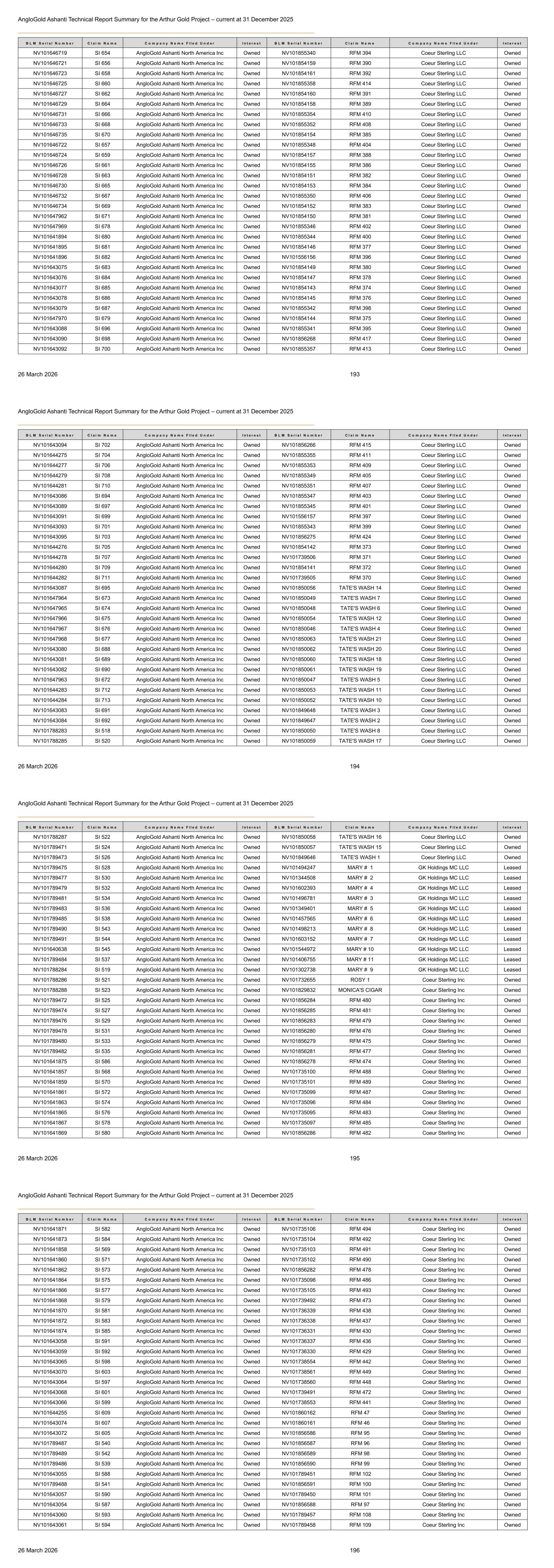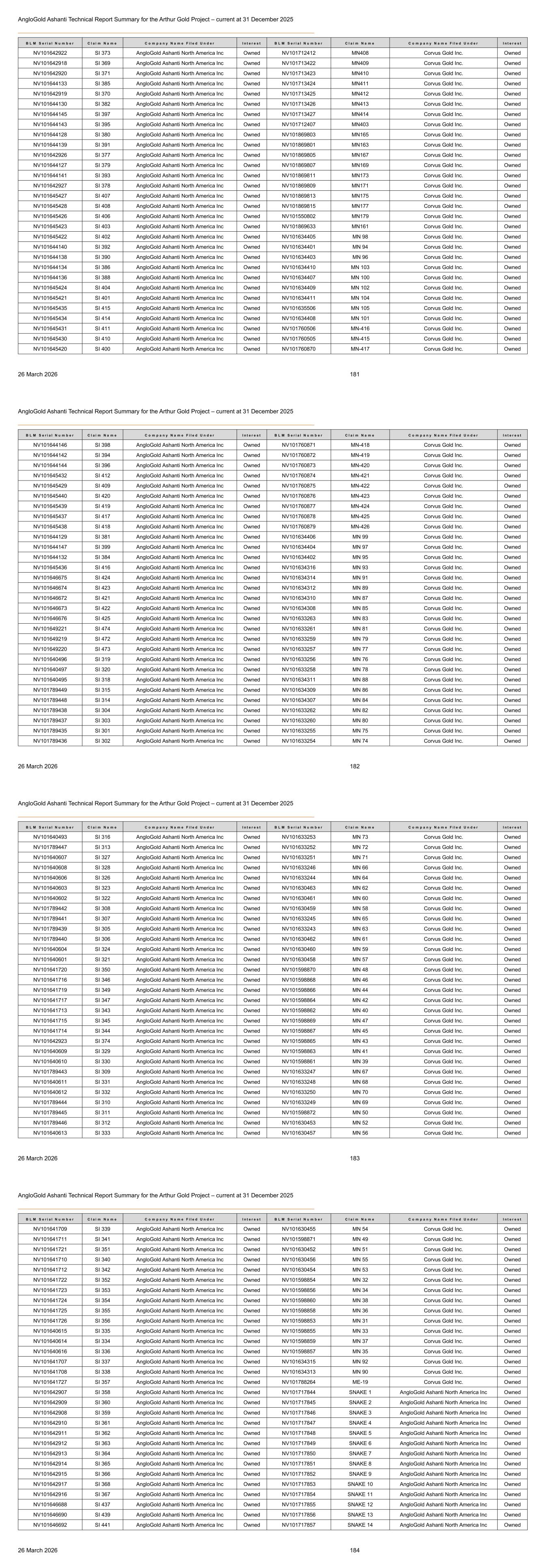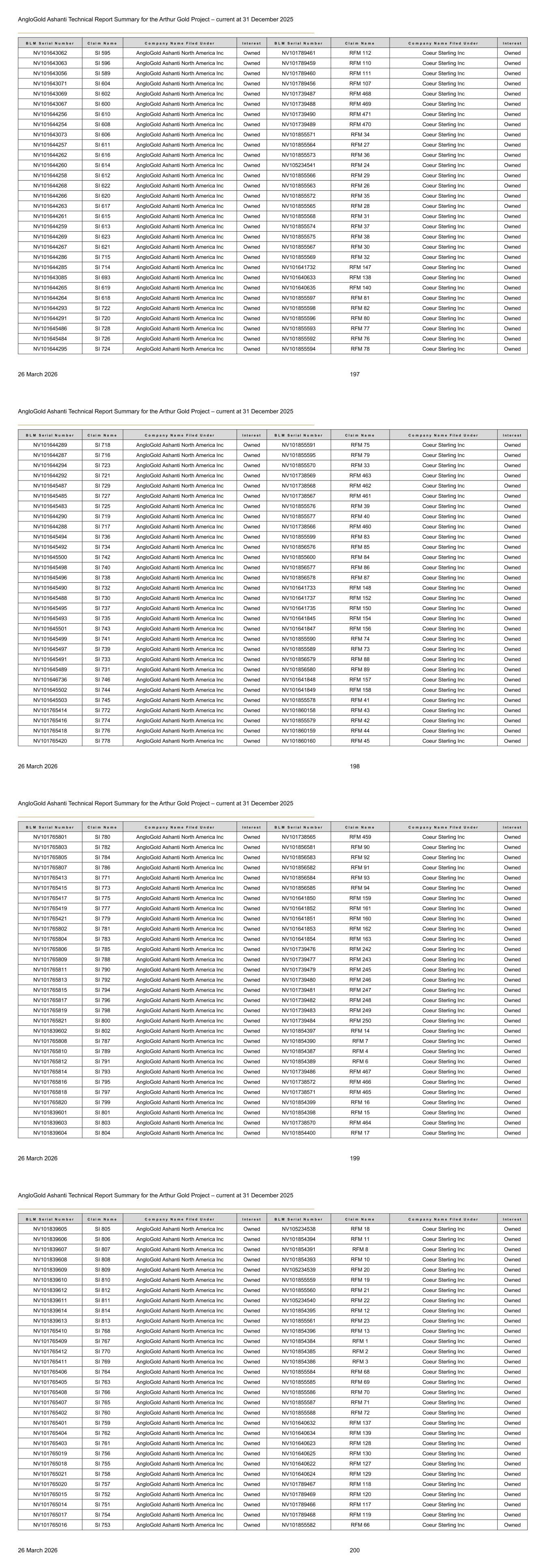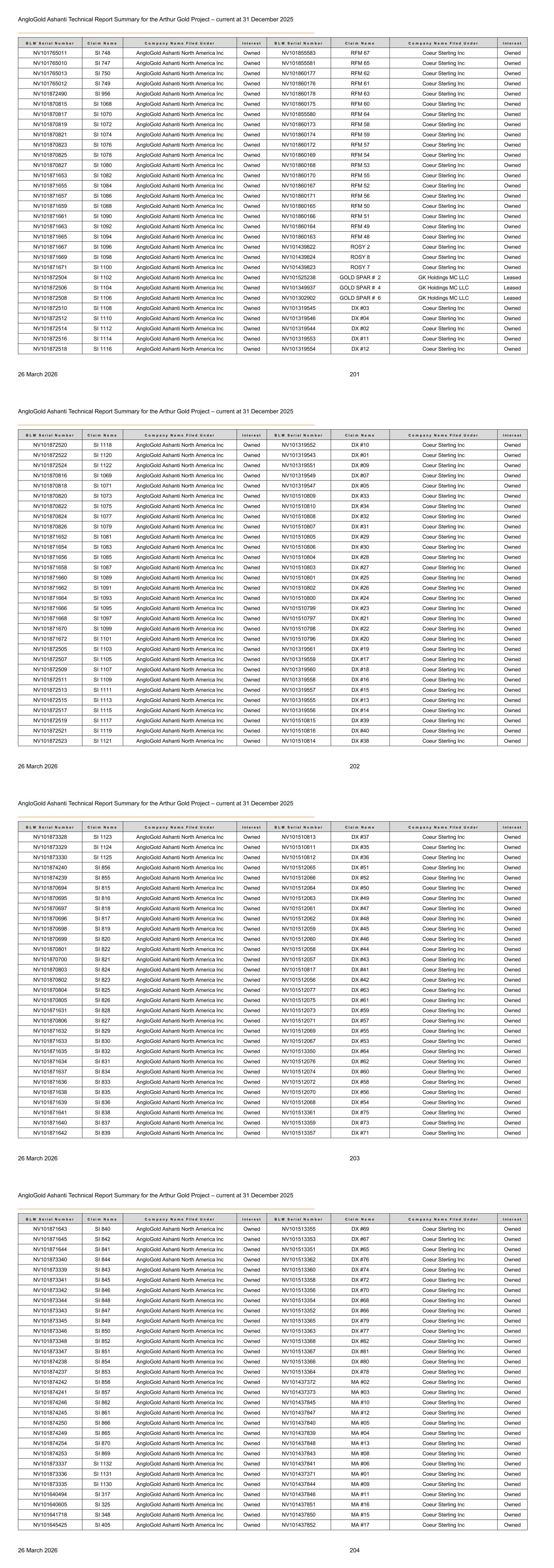 AngloGold Ashanti Technical Report Summary for the Arthur Gold Project – current at 31 December 2025 __________________________________________________________________________________________ 26 March 2026 197 B L M S e r i a l N u m b e r C l a i m N a m e C o m p a n y N a m e F i l e d U n d e r I n t e r e s t B L M S e r i a l N u m b e r C l a i m N a m e C o m p a n y N a m e F i l e d U n d e r I n t e r e s t NV101643062 SI 595 AngloGold Ashanti North America Inc Owned NV101789461 RFM 112 Coeur Sterling Inc Owned NV101643063 SI 596 AngloGold Ashanti North America Inc Owned NV101789459 RFM 110 Coeur Sterling Inc Owned NV101643056 SI 589 AngloGold Ashanti North America Inc Owned NV101789460 RFM 111 Coeur Sterling Inc Owned NV101643071 SI 604 AngloGold Ashanti North America Inc Owned NV101789456 RFM 107 Coeur Sterling Inc Owned NV101643069 SI 602 AngloGold Ashanti North America Inc Owned NV101739487 RFM 468 Coeur Sterling Inc Owned NV101643067 SI 600 AngloGold Ashanti North America Inc Owned NV101739488 RFM 469 Coeur Sterling Inc Owned NV101644256 SI 610 AngloGold Ashanti North America Inc Owned NV101739490 RFM 471 Coeur Sterling Inc Owned NV101644254 SI 608 AngloGold Ashanti North America Inc Owned NV101739489 RFM 470 Coeur Sterling Inc Owned NV101643073 SI 606 AngloGold Ashanti North America Inc Owned NV101855571 RFM 34 Coeur Sterling Inc Owned NV101644257 SI 611 AngloGold Ashanti North America Inc Owned NV101855564 RFM 27 Coeur Sterling Inc Owned NV101644262 SI 616 AngloGold Ashanti North America Inc Owned NV101855573 RFM 36 Coeur Sterling Inc Owned NV101644260 SI 614 AngloGold Ashanti North America Inc Owned NV105234541 RFM 24 Coeur Sterling Inc Owned NV101644258 SI 612 AngloGold Ashanti North America Inc Owned NV101855566 RFM 29 Coeur Sterling Inc Owned NV101644268 SI 622 AngloGold Ashanti North America Inc Owned NV101855563 RFM 26 Coeur Sterling Inc Owned NV101644266 SI 620 AngloGold Ashanti North America Inc Owned NV101855572 RFM 35 Coeur Sterling Inc Owned NV101644263 SI 617 AngloGold Ashanti North America Inc Owned NV101855565 RFM 28 Coeur Sterling Inc Owned NV101644261 SI 615 AngloGold Ashanti North America Inc Owned NV101855568 RFM 31 Coeur Sterling Inc Owned NV101644259 SI 613 AngloGold Ashanti North America Inc Owned NV101855574 RFM 37 Coeur Sterling Inc Owned NV101644269 SI 623 AngloGold Ashanti North America Inc Owned NV101855575 RFM 38 Coeur Sterling Inc Owned NV101644267 SI 621 AngloGold Ashanti North America Inc Owned NV101855567 RFM 30 Coeur Sterling Inc Owned NV101644286 SI 715 AngloGold Ashanti North America Inc Owned NV101855569 RFM 32 Coeur Sterling Inc Owned NV101644285 SI 714 AngloGold Ashanti North America Inc Owned NV101641732 RFM 147 Coeur Sterling Inc Owned NV101643085 SI 693 AngloGold Ashanti North America Inc Owned NV101640633 RFM 138 Coeur Sterling Inc Owned NV101644265 SI 619 AngloGold Ashanti North America Inc Owned NV101640635 RFM 140 Coeur Sterling Inc Owned NV101644264 SI 618 AngloGold Ashanti North America Inc Owned NV101855597 RFM 81 Coeur Sterling Inc Owned NV101644293 SI 722 AngloGold Ashanti North America Inc Owned NV101855598 RFM 82 Coeur Sterling Inc Owned NV101644291 SI 720 AngloGold Ashanti North America Inc Owned NV101855596 RFM 80 Coeur Sterling Inc Owned NV101645486 SI 728 AngloGold Ashanti North America Inc Owned NV101855593 RFM 77 Coeur Sterling Inc Owned NV101645484 SI 726 AngloGold Ashanti North America Inc Owned NV101855592 RFM 76 Coeur Sterling Inc Owned NV101644295 SI 724 AngloGold Ashanti North America Inc Owned NV101855594 RFM 78 Coeur Sterling Inc Owned AngloGold Ashanti Technical Report Summary for the Arthur Gold Project – current at 31 December 2025 __________________________________________________________________________________________ 26 March 2026 198 B L M S e r i a l N u m b e r C l a i m N a m e C o m p a n y N a m e F i l e d U n d e r I n t e r e s t B L M S e r i a l N u m b e r C l a i m N a m e C o m p a n y N a m e F i l e d U n d e r I n t e r e s t NV101644289 SI 718 AngloGold Ashanti North America Inc Owned NV101855591 RFM 75 Coeur Sterling Inc Owned NV101644287 SI 716 AngloGold Ashanti North America Inc Owned NV101855595 RFM 79 Coeur Sterling Inc Owned NV101644294 SI 723 AngloGold Ashanti North America Inc Owned NV101855570 RFM 33 Coeur Sterling Inc Owned NV101644292 SI 721 AngloGold Ashanti North America Inc Owned NV101738569 RFM 463 Coeur Sterling Inc Owned NV101645487 SI 729 AngloGold Ashanti North America Inc Owned NV101738568 RFM 462 Coeur Sterling Inc Owned NV101645485 SI 727 AngloGold Ashanti North America Inc Owned NV101738567 RFM 461 Coeur Sterling Inc Owned NV101645483 SI 725 AngloGold Ashanti North America Inc Owned NV101855576 RFM 39 Coeur Sterling Inc Owned NV101644290 SI 719 AngloGold Ashanti North America Inc Owned NV101855577 RFM 40 Coeur Sterling Inc Owned NV101644288 SI 717 AngloGold Ashanti North America Inc Owned NV101738566 RFM 460 Coeur Sterling Inc Owned NV101645494 SI 736 AngloGold Ashanti North America Inc Owned NV101855599 RFM 83 Coeur Sterling Inc Owned NV101645492 SI 734 AngloGold Ashanti North America Inc Owned NV101856576 RFM 85 Coeur Sterling Inc Owned NV101645500 SI 742 AngloGold Ashanti North America Inc Owned NV101855600 RFM 84 Coeur Sterling Inc Owned NV101645498 SI 740 AngloGold Ashanti North America Inc Owned NV101856577 RFM 86 Coeur Sterling Inc Owned NV101645496 SI 738 AngloGold Ashanti North America Inc Owned NV101856578 RFM 87 Coeur Sterling Inc Owned NV101645490 SI 732 AngloGold Ashanti North America Inc Owned NV101641733 RFM 148 Coeur Sterling Inc Owned NV101645488 SI 730 AngloGold Ashanti North America Inc Owned NV101641737 RFM 152 Coeur Sterling Inc Owned NV101645495 SI 737 AngloGold Ashanti North America Inc Owned NV101641735 RFM 150 Coeur Sterling Inc Owned NV101645493 SI 735 AngloGold Ashanti North America Inc Owned NV101641845 RFM 154 Coeur Sterling Inc Owned NV101645501 SI 743 AngloGold Ashanti North America Inc Owned NV101641847 RFM 156 Coeur Sterli