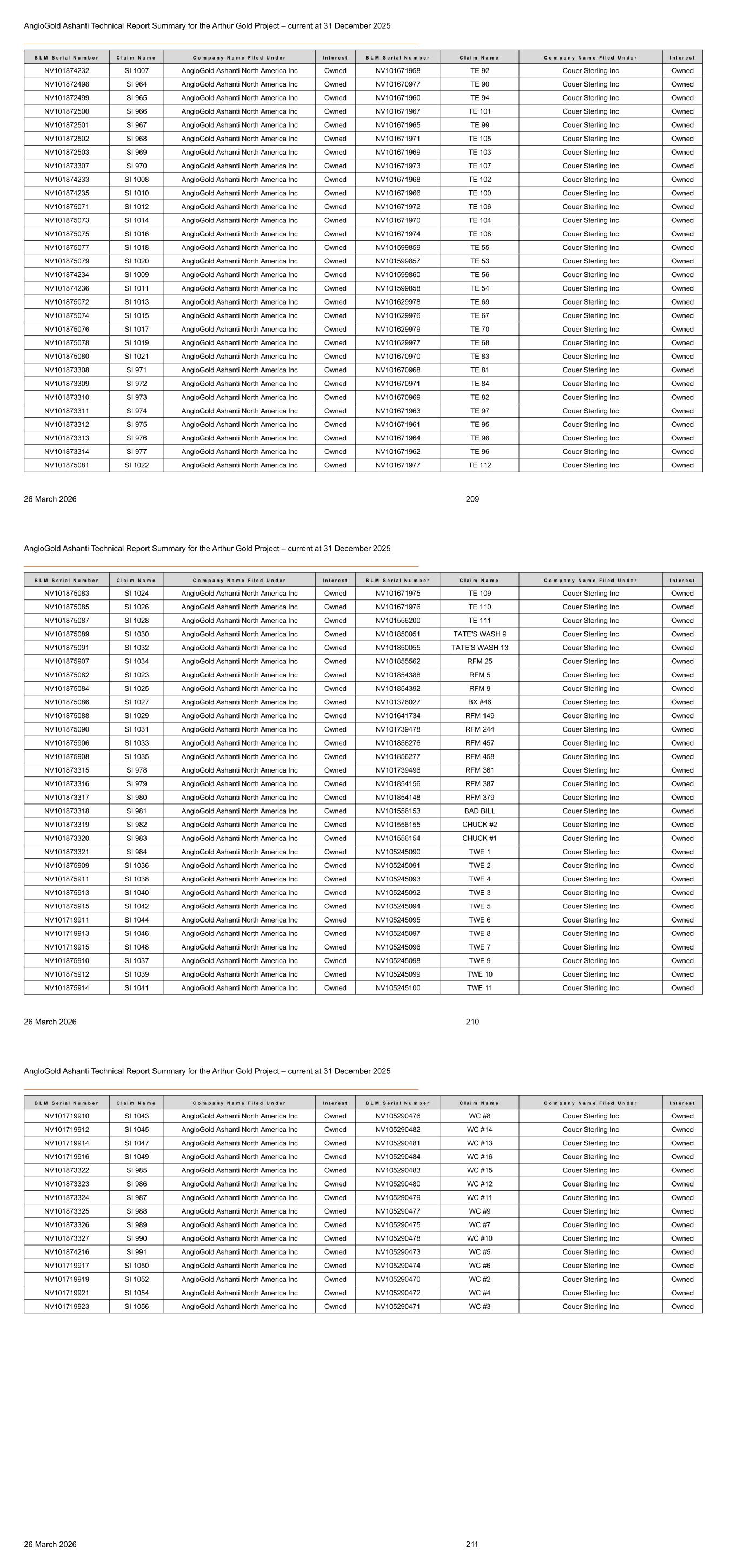 AngloGold Ashanti Technical Report Summary for the Arthur Gold Project – current at 31 December 2025 __________________________________________________________________________________________ 26 March 2026 201 B L M S e r i a l N u m b e r C l a i m N a m e C o m p a n y N a m e F i l e d U n d e r I n t e r e s t B L M S e r i a l N u m b e r C l a i m N a m e C o m p a n y N a m e F i l e d U n d e r I n t e r e s t NV101765011 SI 748 AngloGold Ashanti North America Inc Owned NV101855583 RFM 67 Coeur Sterling Inc Owned NV101765010 SI 747 AngloGold Ashanti North America Inc Owned NV101855581 RFM 65 Coeur Sterling Inc Owned NV101765013 SI 750 AngloGold Ashanti North America Inc Owned NV101860177 RFM 62 Coeur Sterling Inc Owned NV101765012 SI 749 AngloGold Ashanti North America Inc Owned NV101860176 RFM 61 Coeur Sterling Inc Owned NV101872490 SI 956 AngloGold Ashanti North America Inc Owned NV101860178 RFM 63 Coeur Sterling Inc Owned NV101870815 SI 1068 AngloGold Ashanti North America Inc Owned NV101860175 RFM 60 Coeur Sterling Inc Owned NV101870817 SI 1070 AngloGold Ashanti North America Inc Owned NV101855580 RFM 64 Coeur Sterling Inc Owned NV101870819 SI 1072 AngloGold Ashanti North America Inc Owned NV101860173 RFM 58 Coeur Sterling Inc Owned NV101870821 SI 1074 AngloGold Ashanti North America Inc Owned NV101860174 RFM 59 Coeur Sterling Inc Owned NV101870823 SI 1076 AngloGold Ashanti North America Inc Owned NV101860172 RFM 57 Coeur Sterling Inc Owned NV101870825 SI 1078 AngloGold Ashanti North America Inc Owned NV101860169 RFM 54 Coeur Sterling Inc Owned NV101870827 SI 1080 AngloGold Ashanti North America Inc Owned NV101860168 RFM 53 Coeur Sterling Inc Owned NV101871653 SI 1082 AngloGold Ashanti North America Inc Owned NV101860170 RFM 55 Coeur Sterling Inc Owned NV101871655 SI 1084 AngloGold Ashanti North America Inc Owned NV101860167 RFM 52 Coeur Sterling Inc Owned NV101871657 SI 1086 AngloGold Ashanti North America Inc Owned NV101860171 RFM 56 Coeur Sterling Inc Owned NV101871659 SI 1088 AngloGold Ashanti North America Inc Owned NV101860165 RFM 50 Coeur Sterling Inc Owned NV101871661 SI 1090 AngloGold Ashanti North America Inc Owned NV101860166 RFM 51 Coeur Sterling Inc Owned NV101871663 SI 1092 AngloGold Ashanti North America Inc Owned NV101860164 RFM 49 Coeur Sterling Inc Owned NV101871665 SI 1094 AngloGold Ashanti North America Inc Owned NV101860163 RFM 48 Coeur Sterling Inc Owned NV101871667 SI 1096 AngloGold Ashanti North America Inc Owned NV101439822 ROSY 2 Coeur Sterling Inc Owned NV101871669 SI 1098 AngloGold Ashanti North America Inc Owned NV101439824 ROSY 8 Coeur Sterling Inc Owned NV101871671 SI 1100 AngloGold Ashanti North America Inc Owned NV101439823 ROSY 7 Coeur Sterling Inc Owned NV101872504 SI 1102 AngloGold Ashanti North America Inc Owned NV101525238 GOLD SPAR # 2 GK Holdings MC LLC Leased NV101872506 SI 1104 AngloGold Ashanti North America Inc Owned NV101349937 GOLD SPAR # 4 GK Holdings MC LLC Leased NV101872508 SI 1106 AngloGold Ashanti North America Inc Owned NV101302902 GOLD SPAR # 6 GK Holdings MC LLC Leased NV101872510 SI 1108 AngloGold Ashanti North America Inc Owned NV101319545 DX #03 Coeur Sterling Inc Owned NV101872512 SI 1110 AngloGold Ashanti North America Inc Owned NV101319546 DX #04 Coeur Sterling Inc Owned NV101872514 SI 1112 AngloGold Ashanti North America Inc Owned NV101319544 DX #02 Coeur Sterling Inc Owned NV101872516 SI 1114 AngloGold Ashanti North America Inc Owned NV101319553 DX #11 Coeur Sterling Inc Owned NV101872518 SI 1116 AngloGold Ashanti North America Inc Owned NV101319554 DX #12 Coeur Sterling Inc Owned AngloGold Ashanti Technical Report Summary for the Arthur Gold Project – current at 31 December 2025 __________________________________________________________________________________________ 26 March 2026 202 B L M S e r i a l N u m b e r C l a i m N a m e C o m p a n y N a m e F i l e d U n d e r I n t e r e s t B L M S e r i a l N u m b e r C l a i m N a m e C o m p a n y N a m e F i l e d U n d e r I n t e r e s t NV101872520 SI 1118 AngloGold Ashanti North America Inc Owned NV101319552 DX #10 Coeur Sterling Inc Owned NV101872522 SI 1120 AngloGold Ashanti North America Inc Owned NV101319543 DX #01 Coeur Sterling Inc Owned NV101872524 SI 1122 AngloGold Ashanti North America Inc Owned NV101319551 DX #09 Coeur Sterling Inc Owned NV101870816 SI 1069 AngloGold Ashanti North America Inc Owned NV101319549 DX #07 Coeur Sterling Inc Owned NV101870818 SI 1071 AngloGold Ashanti North America Inc Owned NV101319547 DX #05 Coeur Sterling Inc Owned NV101870820 SI 1073 AngloGold Ashanti North America Inc Owned NV101510809 DX #33 Coeur Sterling Inc Owned NV101870822 SI 1075 AngloGold Ashanti North America Inc Owned NV101510810 DX #34 Coeur Sterling Inc Owned NV101870824 SI 1077 AngloGold Ashanti North America Inc Owned NV101510808 DX #32 Coeur Sterling Inc Owned NV101870826 SI 1079 AngloGold Ashanti North America Inc Owned NV101510807 DX #31 Coeur Sterling Inc Owned NV101871652 SI 1081 AngloGold Ashanti North America Inc Owned NV101510805 DX #29 Coeur Sterling Inc Owned NV101871654 SI 1083 AngloGold Ashanti North America Inc Owned NV101510806 DX #30 Coeur Sterling Inc Owned NV101871656 SI 1085 AngloGold Ashanti North America Inc Owned NV101510804 DX #28 Coeur Sterling Inc Owned NV101871658 SI 1087 AngloGold Ashanti North America Inc Owned NV101510803 DX #27 Coeur Sterling Inc Owned NV101871660 SI 1089 AngloGold Ashanti North America Inc Owned NV101510801 DX #25 Coeur Sterling Inc Owned NV101871662 SI 1091 AngloGold Ashanti North America Inc Owned NV101510802 DX #26 Coeur Sterling Inc Owned NV101871664 SI 1093 AngloGold Ashanti North America Inc Owned NV101510800 DX #24 Coeur Sterling Inc Owned NV101871666 SI 1095 AngloGold Ashanti North America Inc Owned NV101510799 DX #23 Coeur Sterling Inc Owned NV101871668 SI 1097 AngloGold Ashanti North America Inc Owned NV101510797 DX #21 Coeur Sterling Inc Owned NV101871670 SI 1099 AngloGold Ashanti North A