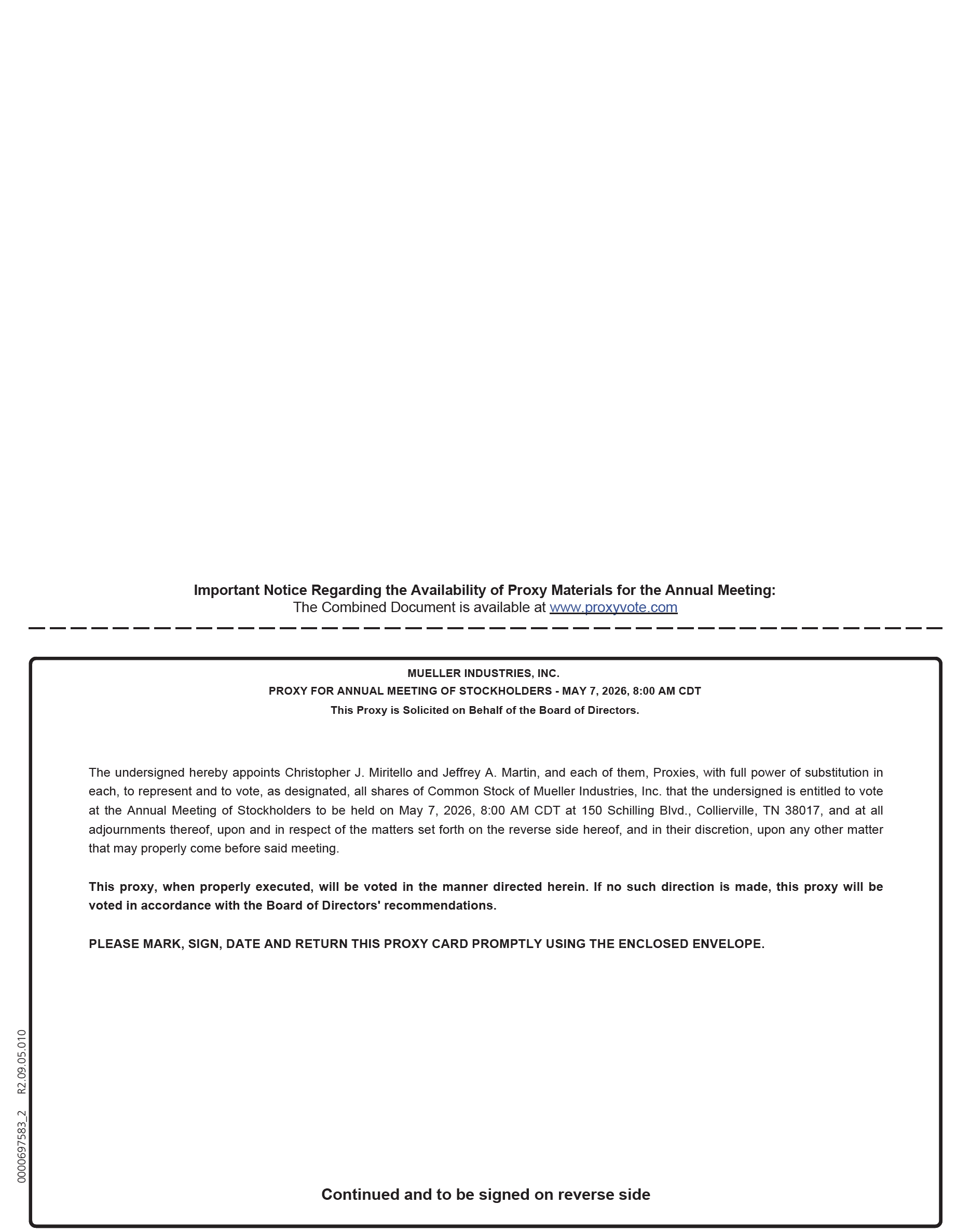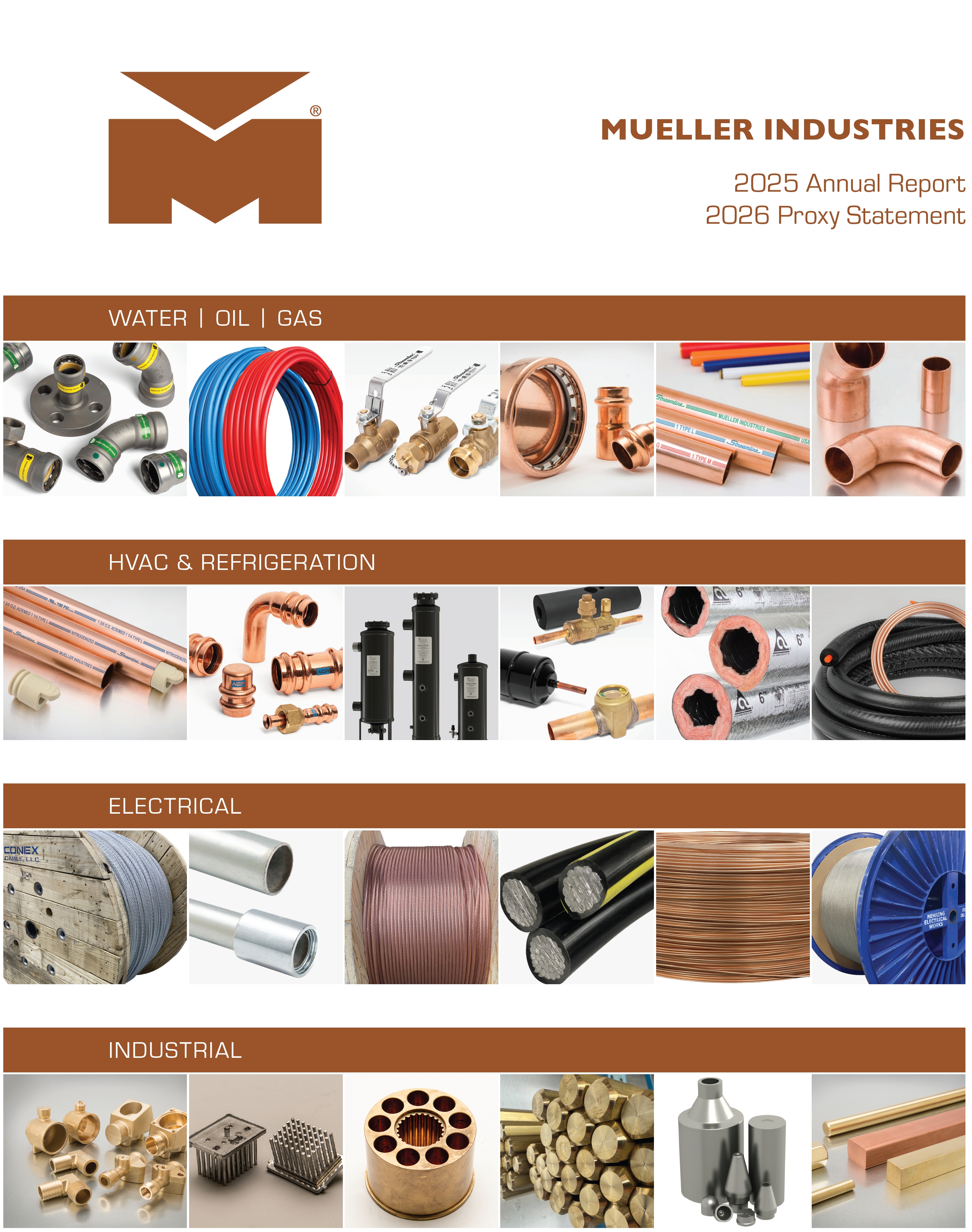 A COPY OF THE COMPANY’S ANNUAL REPORT ON FORM 10-K AS FILED FOR THE YEAR ENDED DECEMBER 27, 2025 (EXCLUDING EXHIBITS) OR, AS NOTED HEREIN, ANY OF THE COMPANY’S BOARD COMMITTEE CHARTERS, CORPORATE GOVERNANCE GUIDELINES, OR CODE OF ETHICS WILL BE FURNISHED, WITHOUT CHARGE, BY WRITING TO CHRISTOPHER J. MIRITELLO, CORPORATE SECRETARY, MUELLER INDUSTRIES, INC., AT THE COMPANY’S PRINCIPAL PLACE OF BUSINESS (150 SCHILLING BOULEVARD, SUITE 100, COLLIERVILLE, TENNESSEE 38017). UPON RECEIPT BY WRITING TO THE FOREGOING ADDRESS, THE COMPANY WILL ALSO FURNISH ANY OTHER EXHIBIT OF THE ANNUAL REPORT ON FORM 10-K UPON ADVANCE PAYMENT OF THE REASONABLE OUT-OF-POCKET EXPENSES OF THE COMPANY RELATED TO THE COMPANY’S FURNISHING OF SUCH EXHIBIT.