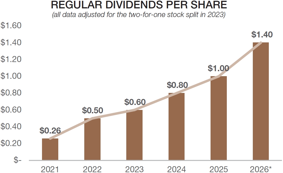 In 2025, we raised our regular quarterly dividend by 25%, our fifth consecutive annual increase above 20%. For 2026, we have announced another 40% increase to the dividend, raising it from $1.00 to $1.40 per share on an annual basis.