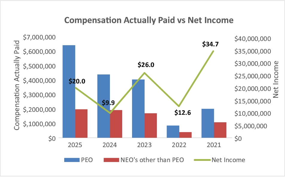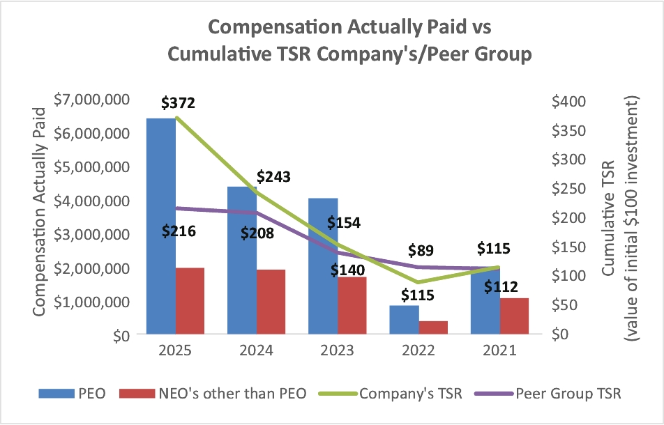 Because CAP also includes multi-year performance-based equity awards influenced by stock price, alignment with financial performance is most apparent over multiple years. Overall, the Company believes that CAP demonstrates a clear relationship with both key financial objectives and long-term shareholder value creation. Relationship between Compensation Actually Paid and Company’s TSR/Peer Group TSR As described in more detail in the section “Compensation Discussion and Analysis,” the Company’s executive compensation program is comprised of a variety of components including a performance-based approach. While the Company utilizes several performance metrics to align executive compensation with Company performance, not all of these are covered by the Pay Versus Performance table. Further, while the Company seeks to incentivize long-term performance, this is not necessarily aligned with “compensation actually paid” (as computed in accordance with Item 402(v) of Regulation S-K) for a particular year. In accordance with Item 402(v) of Regulation S-K, the Company describes below the relationship between Compensation Actually Paid (“CAP”) to our Principal Executive Officer and other NEOs and (i) the Company’s cumulative Total Shareholder Return (“TSR”) and (ii) the cumulative TSR of our peer group. Over the five-year period presented, the Company’s cumulative TSR increased significantly, with a $100 investment on December 31, 2020 growing to approximately $371.75 by December 31, 2025. This compares to cumulative peer group TSR over the same period, which increased a $100 investment to approximately $216.23. The Company’s TSR reflects volatility in 2021 and 2022, followed by substantial stock price appreciation from 2023 through 2025. CAP to our Principal Executive Officer and the average CAP to our other NEOs generally tracked these performance trends. In periods of stock price decline, CAP was lower due to reduced equity award valuations and incentive outcomes. Conversely, as the Company’s stock price appreciated significantly from 2023 through 2025, CAP increased, reflecting higher valuations of outstanding equity awards and performance-based compensation results. The Company’s cumulative TSR outperformed the cumulative TSR of the peer group over the measurement period. CAP outcomes during the later years of the period reflect this relative outperformance, consistent with the design of our compensation program, which emphasizes long-term shareholder value creation and includes a significant proportion of performance-based and equity-based compensation. Accordingly, the Company believes that CAP, as calculated under SEC rules, demonstrates alignment between executive compensation and both absolute and relative TSR performance over the periods presented.