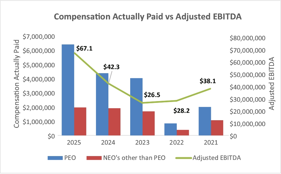 | Additional 402(v) Disclosure | Analysis of the Information Presented in the Pay Versus Performance Tables Relationship Between CAP and Selected Financial Performance Measures The Company’s key financial performance measures for executive compensation purposes are revenue and adjusted EBITDA, which are directly linked to annual cash and long-term equity incentive awards. Over the period presented, revenue and adjusted EBITDA experienced moderate volatility in 2021 and 2022, followed by stronger growth from 2023 through 2025. CAP generally aligned with these trends: