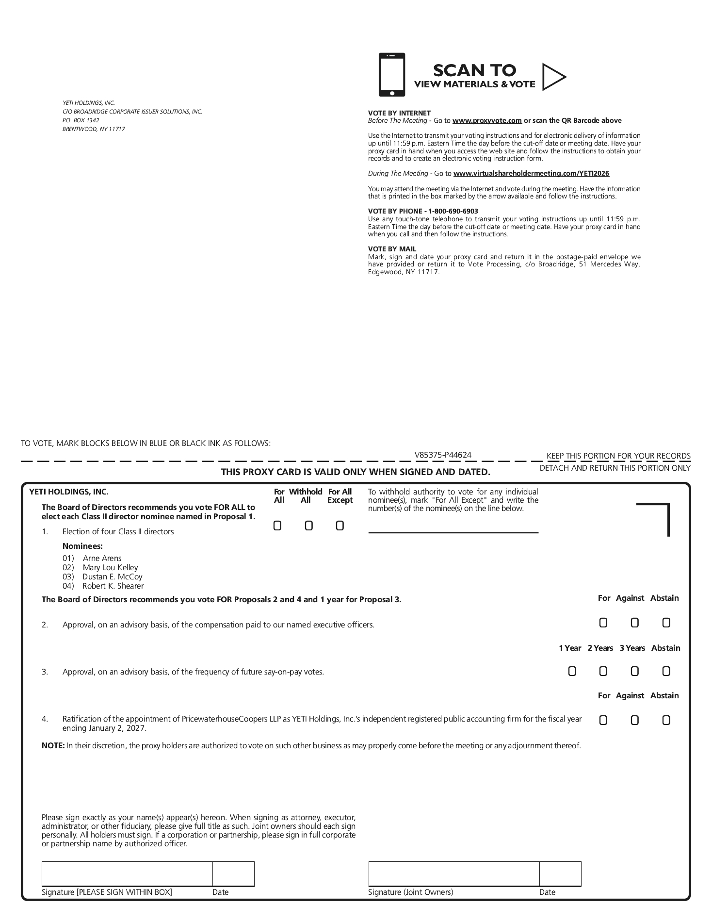 YETI cannot provide a single proxy or instruction card for stockholders who own shares in multiple forms as registered stockholders or beneficial owners. As a result, if your shares are held in multiple types of accounts, you must submit your votes for each type of account in accordance with the instructions you receive for that account.