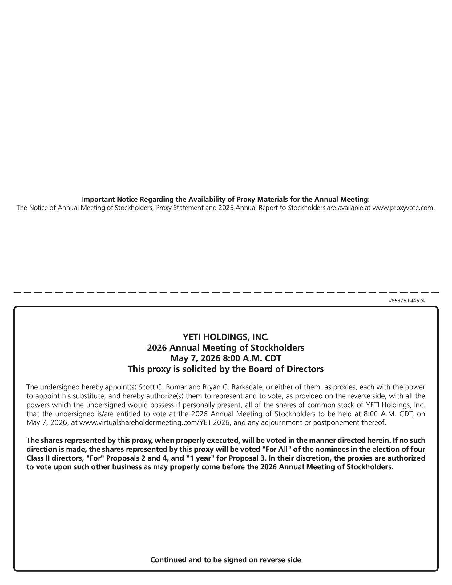 With respect to eligible stockholders who share a single address and did not receive a Notice of Internet Availability, we are sending only one Proxy Statement and Annual Report to that address unless we received instructions to the contrary from any stockholder at that address. This practice, known as “householding,” is designed to reduce our printing and postage costs. However, if a stockholder of record residing at such address wishes to receive a separate Proxy Statement or Annual Report in the future, he or she may contact YETI Holdings, Inc., 7601 Southwest Parkway, Austin, Texas 78735, Attn: Investor Relations,
