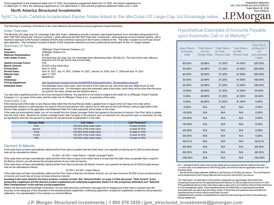 The following is a summary of the terms of the notes offered by the preliminary pricing supplement hyperlinked below. Index Overview The MerQube US Large - Cap Vol Advantage Index (the “Index”) attempts to provide a dynamic rules - based exposure to an unfunded rolling positi on in E - Mini ® S&P 500 ® futures (the “Futures Contracts”), which reference the S&P 500 ® Index (the “Constituent”), while targeting a level of implied volatility, with a maximum exposure to the Futures Contracts of 500% and a minimum exposure to the Futures Contracts of 0%. The Index is subjec t t o a 6.0% per annum daily deduction. The Constituent consists of stocks of 500 companies selected to provide a performance benchmark for the U.S . e quity markets. Summary of Terms Issuer: JPMorgan Chase Financial Company LLC Guarantor: JPMorgan Chase & Co. Minimum Denomination: $1,000 Index (Index Ticker): The MerQube US Large - Cap Vol Advantage Index (Bloomberg ticker: MQUSLVA). The level of the Index reflects a deduction of 6.0% per annum that accrues daily. Upside Leverage Factor: 5.00 Barrier Amount: 50.00% of the Initial Value Pricing Date: April 14, 2026 Review Dates: April 16, 2027, July 14, 2027, October 14, 2027, Januray 14, 2028, April 17, 2028 and April 14, 2031 Maturity Date: April 17, 2031 CUSIP: 46660R3L6 Preliminary Pricing Supplement: http://sp.jpmorgan.com/document/cusip/46660R3L6/doctype/Product_Termsheet/document.pdf Estimated Value: The estimated value of the notes, when the terms of the notes are set, will not be less than $890.00 per $1,000 principal amount note. For information about the estimated value of the notes, which likely will be lower than the price you paid for the notes, please see the hyperlink above. You may lose a significant portion or all of your principal at maturity. Any payment on the notes is subject to the credit ri sk of JPMorgan Chase Financial Company LLC, as issuer of the notes, and the credit risk of JPMorgan Chase & Co., as guarantor of the notes. Automatic Call If the closing level of the Index on any Review Date (other than the final Review Date) is greater than or equal to the Call Val ue, the notes will be automatically called for a cash payment, for each $1,000 principal amount note, equal to (a) $1,000 plus (b) the Call Premium Amount applicable to that Review Date, payable on the applicable Call Settlement Date. No further payments will be made on the notes. If the notes are automatically called, you will not benefit from the Upside Leverage Factor that applies to the payment at ma tur ity if the Final Value is greater than the Initial Value. Because the Upside Leverage Factor does not apply to the payment upon an automatic call, the payment up on an automatic call may be significantly less than the payment at maturity for the same level of appreciation in the Index. Payment At Maturity If the notes have not been automatically called and the Final Value is greater than the Initial Value, your payment at maturi ty per $1,000 principal amount note will be calculated as follows: $1,000 + ($1,000 î Index Return î Upside Leverage Factor) If the notes have not been automatically called and the Final Value is equal to the Initial Value or is less than the Initial Va lue but greater than or equal to the Barrier Amount, you will receive the principal amount of your notes at maturity. If the notes have not been automatically called and the Final Value is less than the Barrier Amount, your payment at maturity pe r $1,000 principal amount note will be calculated as follows: $1,000 + ($1,000 î Index Return) If the notes have not been automatically called and the Final Value is less than the Barrier Amount, you will lose more than 50. 00% of your principal amount at maturity and could lose all of your principal amount at maturity. Investing in the notes linked to the Index involves a number of risks. See "Selected Risks" on page 2 of this document, "Risk Fa ctors" in the prospectus supplement and the relevant product supplement and underlying supplement, Annex A to the prospectus addendum and " Sel ected Risk Considerations" in the relevant pricing supplement. Neither the Securities and Exchange Commission nor any state securities commission has approved or disapproved of the notes o r p assed upon the accuracy or the adequacy of this document or the relevant product supplement, underlying supplement, prospectus supplement, p ros pectus and prospectus addendum. Any representation to the contrary is a criminal offense. J.P. Morgan Structured Investments | 1 800 576 3529 | jpm_structured_investments@jpmorgan.com 5yNC1y Auto Callable Accelerated Barrier Notes linked to the MerQube US Large - Cap Vol Advantage Index North America Structured Investments N/A – indicates that the notes would not be called and no payment would be made for that date. * In each case, to be determined on the Pricing Date, but not less than the applicable minimum Call Premium listed. ** Not all Review Dates reflected. Reflects a Call Premium of 20.80% per annum. The Call Premium will be determined on the Pricing Date and will not be less than 20.80% per annum. The “total return” as used above is the number, expressed as a percentage, that results from comparing the payment on the applicable payment date per $1,000 principal amount note to $1,000. The hypothetical returns on the notes shown above apply only if you hold the notes for their entire term or until automatically called. These hypotheticals do not reflect fees or expenses that would be associated with any sale in the secondary market. If these fees and expenses were included, the hypothetical returns shown above would likely be lower. Capitalized terms used but not defined herein shall have the meanings set forth in the preliminary pricing supplement. Terms supplement to the prospectus dated April 13, 2023, the prospectus supplement dated April 13, 2023, the product suppleme nt no. 4 - I dated April 13, 2023, the underlyin