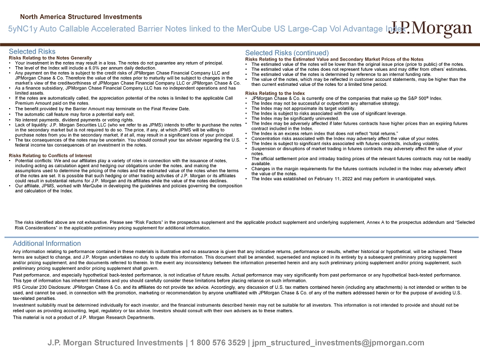 J.P. Morgan Structured Investments | 1 800 576 3529 | jpm_structured_investments@jpmorgan.com Selected Risks Risks Relating to the Notes Generally • Your investment in the notes may result in a loss. The notes do not guarantee any return of principal. • The level of the Index will include a 6.0% per annum daily deduction. • Any payment on the notes is subject to the credit risks of JPMorgan Chase Financial Company LLC and JPMorgan Chase & Co. Therefore the value of the notes prior to maturity will be subject to changes in the market’s view of the creditworthiness of JPMorgan Chase Financial Company LLC or JPMorgan Chase & Co. • As a finance subsidiary, JPMorgan Chase Financial Company LLC has no independent operations and has limited assets. • If the notes are automatically called, the appreciation potential of the notes is limited to the applicable Call Premium Amount paid on the notes. • The benefit provided by the Barrier Amount may terminate on the Final Review Date. • The automatic call feature may force a potential early exit. • No interest payments, dividend payments or voting rights. • Lack of liquidity: J.P. Morgan Securities LLC (who we refer to as JPMS) intends to offer to purchase the notes in the secondary market but is not required to do so. The price, if any, at which JPMS will be willing to purchase notes from you in the secondary market, if at all, may result in a significant loss of your principal. • The tax consequences of the notes may be uncertain. You should consult your tax adviser regarding the U.S. federal income tax consequences of an investment in the notes. Risks Relating to Conflicts of Interest • Potential conflicts: We and our affiliates play a variety of roles in connection with the issuance of notes, including acting as calculation agent and hedging our obligations under the notes, and making the assumptions used to determine the pricing of the notes and the estimated value of the notes when the terms of the notes are set. It is possible that such hedging or other trading activities of J.P. Morgan or its affiliates could result in substantial returns for J.P. Morgan and its affiliates while the value of the notes declines. • Our affiliate, JPMS, worked with MerQube in developing the guidelines and policies governing the composition and calculation of the Index. Selected Risks (continued) Risks Relating to the Estimated Value and Secondary Market Prices of the Notes • The estimated value of the notes will be lower than the original issue price (price to public) of the notes. • The estimated value of the notes does not represent future values and may differ from others’ estimates. • The estimated value of the notes is determined by reference to an internal funding rate. • The value of the notes, which may be reflected in customer account statements, may be higher than the then current estimated value of the notes for a limited time period. Risks Relating to the Index • JPMorgan Chase & Co. is currently one of the companies that make up the S&P 500 ® Index. • The Index may not be successful or outperform any alternative strategy. • The Index may not approximate its target volatility. • The Index is subject to risks associated with the use of significant leverage. • The Index may be significantly uninvested. • The Index may be adversely affected if later futures contracts have higher prices than an expiring futures contract included in the Index. • The Index is an excess return index that does not reflect “total returns.” • Concentration risks associated with the Index may adversely affect the value of your notes. • The Index is subject to significant risks associated with futures contracts, including volatility. • Suspension or disruptions of market trading in futures contracts may adversely affect the value of your notes. • The official settlement price and intraday trading prices of the relevant futures contracts may not be readily available. • Changes in the margin requirements for the futures contracts included in the Index may adversely affect the value of the notes. • The Index was established on February 11, 2022 and may perform in unanticipated ways. Additional Information Any information relating to performance contained in these materials is illustrative and no assurance is given that any indic ati ve returns, performance or results, whether historical or hypothetical, will be achieved. These terms are subject to change, and J.P. Morgan undertakes no duty to update this information. This document shall be amended, s upe rseded and replaced in its entirety by a subsequent preliminary pricing supplement and/or pricing supplement, and the documents referred to therein. In the event any inconsistency between the information pres ent ed herein and any such preliminary pricing supplement and/or pricing supplement, such preliminary pricing supplement and/or pricing supplement shall govern. Past performance, and especially hypothetical back - tested performance, is not indicative of future results. Actual performance m ay vary significantly from past performance or any hypothetical back - tested performance. This type of information has inherent limitations and you should carefully consider these limitations before placing reliance on such information. IRS Circular 230 Disclosure: JPMorgan Chase & Co. and its affiliates do not provide tax advice. Accordingly, any discussion o f U .S. tax matters contained herein (including any attachments) is not intended or written to be used, and cannot be used, in connection with the promotion, marketing or recommendation by anyone unaffiliated with JPMorgan Cha se & Co. of any of the matters addressed herein or for the purpose of avoiding U.S. tax - related penalties. Investment suitability must be determined individually for each investor, and the financial instruments described herein may not be suitable for all investors. This information is not inte