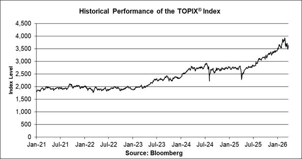 The TOPIX® Index, also known as the Tokyo Stock Price Index, is a free float-adjusted market capitalization-weighted index of common stocks listed on the Tokyo Stock Exchange, Inc. covering an extensive portion of the Japanese stock market. For additional information about the TOPIX® Index, see the information set forth under “Equity Index Descriptions — The TOPIX® Index” on page US-93 of the accompanying underlying supplement.