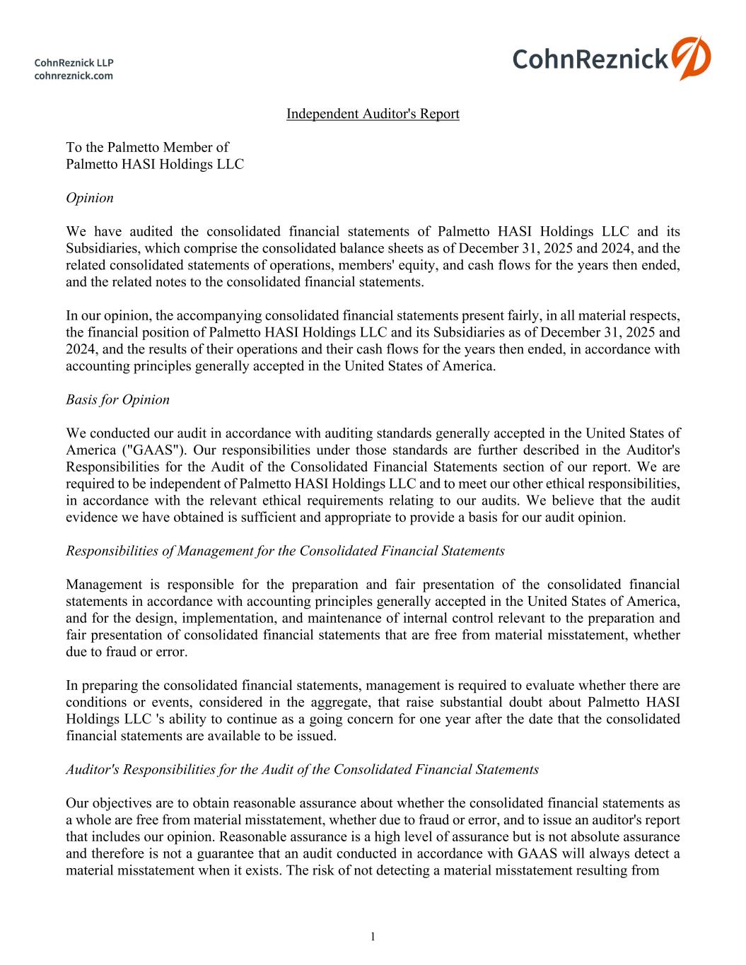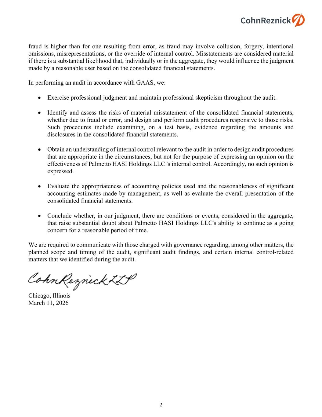 2 fraud is higher than for one resulting from error, as fraud may involve collusion, forgery, intentional omissions, misrepresentations, or the override of internal control. Misstatements are considered material if there is a substantial likelihood that, individually or in the aggregate, they would influence the judgment made by a reasonable user based on the consolidated financial statements. In performing an audit in accordance with GAAS, we: Exercise professional judgment and maintain professional skepticism throughout the audit. Identify and assess the risks of material misstatement of the consolidated financial statements, whether due to fraud or error, and design and perform audit procedures responsive to those risks. Such procedures include examining, on a test basis, evidence regarding the amounts and disclosures in the consolidated financial statements. Obtain an understanding of internal control relevant to the audit in order to design audit procedures that are appropriate in the circumstances, but not for the purpose of expressing an opinion on the effectiveness of Palmetto HASI Holdings LLC 's internal control. Accordingly, no such opinion is expressed. Evaluate the appropriateness of accounting policies used and the reasonableness of significant accounting estimates made by management, as well as evaluate the overall presentation of the consolidated financial statements. Conclude whether, in our judgment, there are conditions or events, considered in the aggregate, that raise substantial doubt about Palmetto HASI Holdings LLC's ability to continue as a going concern for a reasonable period of time. We are required to communicate with those charged with governance regarding, among other matters, the planned scope and timing of the audit, significant audit findings, and certain internal control-related matters that we identified during the audit. Chicago, Illinois March 11, 2026