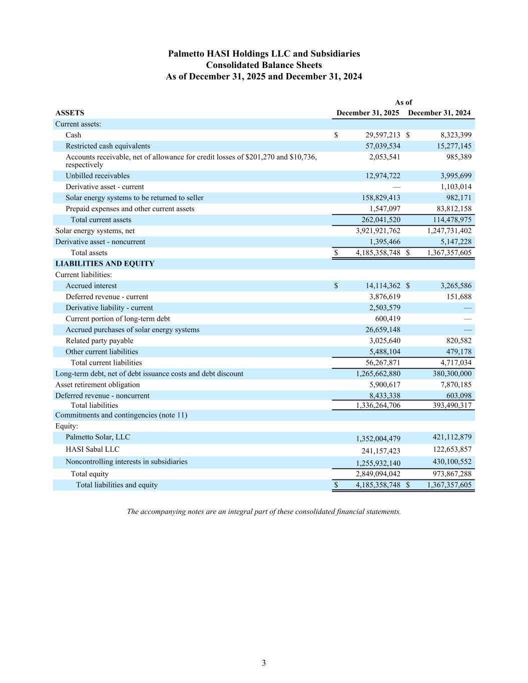 Palmetto HASI Holdings LLC and Subsidiaries Consolidated Balance Sheets As of December 31, 2025 and December 31, 2024 As of ASSETS December 31, 2025 December 31, 2024 Current assets: Cash $ 29,597,213 $ 8,323,399 Restricted cash equivalents 57,039,534 15,277,145 Accounts receivable, net of allowance for credit losses of $201,270 and $10,736, respectively 2,053,541 985,389 Unbilled receivables 12,974,722 3,995,699 Derivative asset - current — 1,103,014 Solar energy systems to be returned to seller 158,829,413 982,171 Prepaid expenses and other current assets 1,547,097 83,812,158 Total current assets 262,041,520 114,478,975 Solar energy systems, net 3,921,921,762 1,247,731,402 Derivative asset - noncurrent 1,395,466 5,147,228 Total assets $ 4,185,358,748 $ 1,367,357,605 LIABILITIES AND EQUITY Current liabilities: Accrued interest $ 14,114,362 $ 3,265,586 Deferred revenue - current 3,876,619 151,688 Derivative liability - current 2,503,579 — Current portion of long-term debt 600,419 — Accrued purchases of solar energy systems 26,659,148 — Related party payable 3,025,640 820,582 Other current liabilities 5,488,104 479,178 Total current liabilities 56,267,871 4,717,034 Long-term debt, net of debt issuance costs and debt discount 1,265,662,880 380,300,000 Asset retirement obligation 5,900,617 7,870,185 Deferred revenue - noncurrent 8,433,338 603,098 Total liabilities 1,336,264,706 393,490,317 Commitments and contingencies (note 11) Equity: Palmetto Solar, LLC 1,352,004,479 421,112,879 HASI Sabal LLC 241,157,423 122,653,857 Noncontrolling interests in subsidiaries 1,255,932,140 430,100,552 Total equity 2,849,094,042 973,867,288 Total liabilities and equity $ 4,185,358,748 $ 1,367,357,605 The accompanying notes are an integral part of these consolidated financial statements. 3