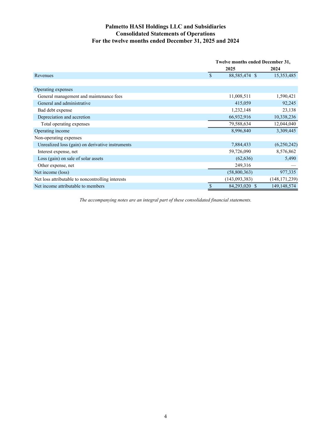Palmetto HASI Holdings LLC and Subsidiaries Consolidated Statements of Operations For the twelve months ended December 31, 2025 and 2024 Twelve months ended December 31, 2025 2024 Revenues $ 88,585,474 $ 15,353,485 Operating expenses General management and maintenance fees 11,008,511 1,590,421 General and administrative 415,059 92,245 Bad debt expense 1,232,148 23,138 Depreciation and accretion 66,932,916 10,338,236 Total operating expenses 79,588,634 12,044,040 Operating income 8,996,840 3,309,445 Non-operating expenses Unrealized loss (gain) on derivative instruments 7,884,433 (6,250,242) Interest expense, net 59,726,090 8,576,862 Loss (gain) on sale of solar assets (62,636) 5,490 Other expense, net 249,316 — Net income (loss) (58,800,363) 977,335 Net loss attributable to noncontrolling interests (143,093,383) (148,171,239) Net income attributable to members $ 84,293,020 $ 149,148,574 The accompanying notes are an integral part of these consolidated financial statements. 4