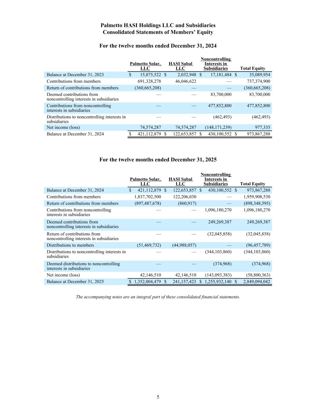 Palmetto HASI Holdings LLC and Subsidiaries Consolidated Statements of Members’ Equity For the twelve months ended December 31, 2024 Palmetto Solar, LLC HASI Sabal LLC Noncontrolling Interests in Subsidiaries Total Equity Balance at December 31, 2023 $ 15,875,522 $ 2,032,948 $ 17,181,484 $ 35,089,954 Contributions from members 691,328,278 46,046,622 — 737,374,900 Return of contributions from members (360,665,208) — — (360,665,208) Deemed contributions from noncontrolling interests in subsidiaries — — 83,700,000 83,700,000 Contributions from noncontrolling interests in subsidiaries — — 477,852,800 477,852,800 Distributions to noncontrolling interests in subsidiaries — — (462,493) (462,493) Net income (loss) 74,574,287 74,574,287 (148,171,239) 977,335 Balance at December 31, 2024 $ 421,112,879 $ 122,653,857 $ 430,100,552 $ 973,867,288 For the twelve months ended December 31, 2025 Palmetto Solar, LLC HASI Sabal LLC Noncontrolling Interests in Subsidiaries Total Equity Balance at December 31, 2024 $ 421,112,879 $ 122,653,857 $ 430,100,552 $ 973,867,288 Contributions from members 1,837,702,500 122,206,030 — 1,959,908,530 Return of contributions from members (897,487,678) (860,917) — (898,348,595) Contributions from noncontrolling interests in subsidiaries — — 1,096,180,270 1,096,180,270 Deemed contributions from noncontrolling interests in subsidiaries — — 249,269,387 249,269,387 Return of contributions from noncontrolling interests in subsidiaries — — (32,045,858) (32,045,858) Distributions to members (51,469,732) (44,988,057) — (96,457,789) Distributions to noncontrolling interests in subsidiaries — — (344,103,860) (344,103,860) Deemed distributions to noncontrolling interests in subsidiaries — — (374,968) (374,968) Net income (loss) 42,146,510 42,146,510 (143,093,383) (58,800,363) Balance at December 31, 2025 $ 1,352,004,479 $ 241,157,423 $ 1,255,932,140 $ 2,849,094,042 The accompanying notes are an integral part of these consolidated financial statements. 5