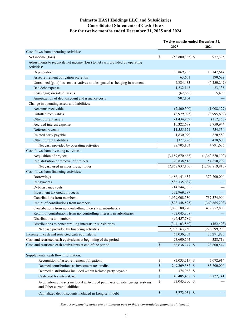 Palmetto HASI Holdings LLC and Subsidiaries Consolidated Statements of Cash Flows For the twelve months ended December 31, 2025 and 2024 Twelve months ended December 31, 2025 2024 Cash flows from operating activities: Net income (loss) $ (58,800,363) $ 977,335 Adjustments to reconcile net income (loss) to net cash provided by operating activities: Depreciation 66,869,265 10,147,614 Asset retirement obligation accretion 63,651 190,622 Unrealized (gain) loss on derivatives not designated as hedging instruments 7,884,433 (6,250,242) Bad debt expense 1,232,148 23,138 Loss (gain) on sale of assets (62,636) 5,490 Amortization of debt discount and issuance costs 902,134 — Change in operating assets and liabilities: Accounts receivable (2,300,300) (1,008,127) Unbilled receivables (8,979,023) (3,995,699) Other current assets (1,434,939) (112,158) Accrued interest expense 10,322,698 2,759,944 Deferred revenue 11,555,171 754,534 Related party payable 1,830,090 820,582 Other current liabilities (377,226) 478,603 Net cash provided by operating activities 28,705,103 4,791,636 Cash flows from investing activities: Acquisition of projects (3,189,670,666) (1,362,670,102) Redistribution or removal of projects 320,838,516 154,850,292 Net cash used in investing activities (2,868,832,150) (1,207,819,810) Cash flows from financing activities: Borrowings 1,486,141,637 372,200,000 Repayments (586,335,637) — Debt issuance costs (14,744,835) — Investment tax credit proceeds 332,969,387 — Contributions from members 1,959,908,530 737,374,900 Return of contributions from members (898,348,595) (360,665,208) Contributions from noncontrolling interests in subsidiaries 1,096,180,270 477,852,800 Return of contributions from noncontrolling interests in subsidiaries (32,045,858) — Distributions to members (96,457,789) — Distributions to noncontrolling interests in subsidiaries (344,103,860) (462,493) Net cash provided by financing activities 2,903,163,250 1,226,299,999 Increase in cash and restricted cash equivalents 63,036,203 23,271,825 Cash and restricted cash equivalents at beginning of the period 23,600,544 328,719 Cash and restricted cash equivalents at end of the period $ 86,636,747 $ 23,600,544 Supplemental cash flow information: Recognition of asset retirement obligations $ (2,033,219) $ 7,672,914 Deemed contributions as investment tax credits $ 249,269,387 $ 83,700,000 Deemed distributions included within Related party payable $ 374,968 $ — Cash paid for interest, net $ 46,485,438 $ 6,122,741 Acquisition of assets included in Accrued purchases of solar energy systems and Other current liabilities $ 32,045,300 $ — Capitalized debt discounts included in Long-term debt $ 5,772,954 $ — The accompanying notes are an integral part of these consolidated financial statements. 6