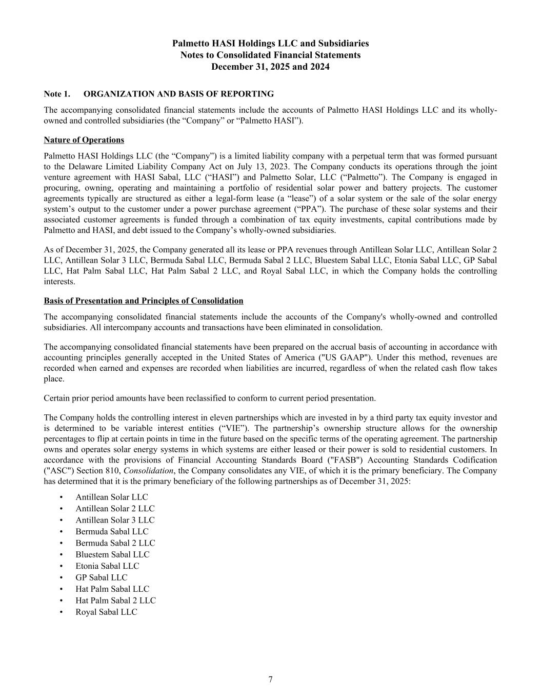 Palmetto HASI Holdings LLC and Subsidiaries Notes to Consolidated Financial Statements December 31, 2025 and 2024 Note 1. ORGANIZATION AND BASIS OF REPORTING The accompanying consolidated financial statements include the accounts of Palmetto HASI Holdings LLC and its wholly- owned and controlled subsidiaries (the “Company” or “Palmetto HASI”). Nature of Operations Palmetto HASI Holdings LLC (the “Company”) is a limited liability company with a perpetual term that was formed pursuant to the Delaware Limited Liability Company Act on July 13, 2023. The Company conducts its operations through the joint venture agreement with HASI Sabal, LLC (“HASI”) and Palmetto Solar, LLC (“Palmetto”). The Company is engaged in procuring, owning, operating and maintaining a portfolio of residential solar power and battery projects. The customer agreements typically are structured as either a legal-form lease (a “lease”) of a solar system or the sale of the solar energy system’s output to the customer under a power purchase agreement (“PPA”). The purchase of these solar systems and their associated customer agreements is funded through a combination of tax equity investments, capital contributions made by Palmetto and HASI, and debt issued to the Company’s wholly-owned subsidiaries. As of December 31, 2025, the Company generated all its lease or PPA revenues through Antillean Solar LLC, Antillean Solar 2 LLC, Antillean Solar 3 LLC, Bermuda Sabal LLC, Bermuda Sabal 2 LLC, Bluestem Sabal LLC, Etonia Sabal LLC, GP Sabal LLC, Hat Palm Sabal LLC, Hat Palm Sabal 2 LLC, and Royal Sabal LLC, in which the Company holds the controlling interests. Basis of Presentation and Principles of Consolidation The accompanying consolidated financial statements include the accounts of the Company's wholly-owned and controlled subsidiaries. All intercompany accounts and transactions have been eliminated in consolidation. The accompanying consolidated financial statements have been prepared on the accrual basis of accounting in accordance with accounting principles generally accepted in the United States of America ("US GAAP"). Under this method, revenues are recorded when earned and expenses are recorded when liabilities are incurred, regardless of when the related cash flow takes place. Certain prior period amounts have been reclassified to conform to current period presentation. The Company holds the controlling interest in eleven partnerships which are invested in by a third party tax equity investor and is determined to be variable interest entities (“VIE”). The partnership’s ownership structure allows for the ownership percentages to flip at certain points in time in the future based on the specific terms of the operating agreement. The partnership owns and operates solar energy systems in which systems are either leased or their power is sold to residential customers. In accordance with the provisions of Financial Accounting Standards Board ("FASB") Accounting Standards Codification ("ASC") Section 810, Consolidation, the Company consolidates any VIE, of which it is the primary beneficiary. The Company has determined that it is the primary beneficiary of the following partnerships as of December 31, 2025: • Antillean Solar LLC • Antillean Solar 2 LLC • Antillean Solar 3 LLC • Bermuda Sabal LLC • Bermuda Sabal 2 LLC • Bluestem Sabal LLC • Etonia Sabal LLC • GP Sabal LLC • Hat Palm Sabal LLC • Hat Palm Sabal 2 LLC • Royal Sabal LLC 7