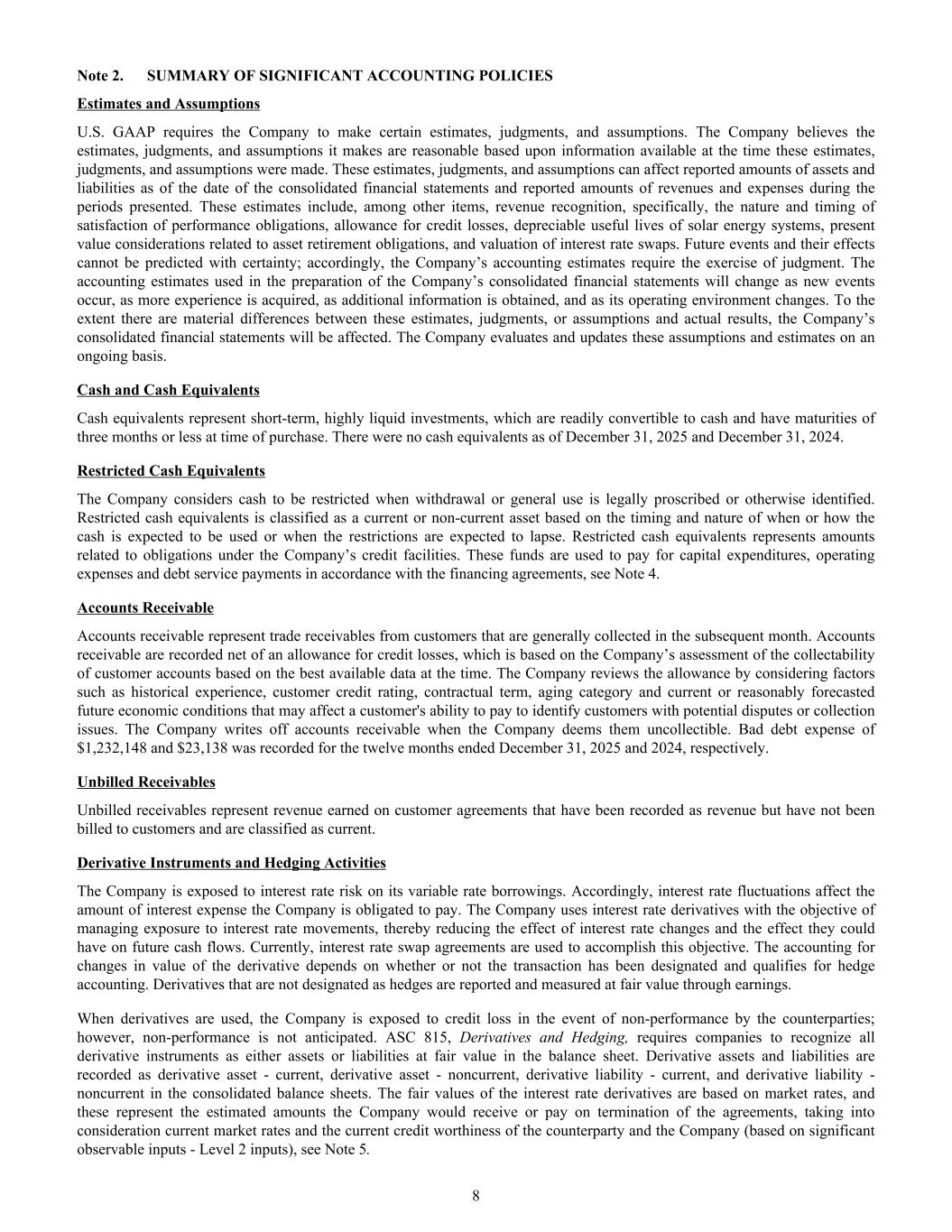 Note 2. SUMMARY OF SIGNIFICANT ACCOUNTING POLICIES Estimates and Assumptions U.S. GAAP requires the Company to make certain estimates, judgments, and assumptions. The Company believes the estimates, judgments, and assumptions it makes are reasonable based upon information available at the time these estimates, judgments, and assumptions were made. These estimates, judgments, and assumptions can affect reported amounts of assets and liabilities as of the date of the consolidated financial statements and reported amounts of revenues and expenses during the periods presented. These estimates include, among other items, revenue recognition, specifically, the nature and timing of satisfaction of performance obligations, allowance for credit losses, depreciable useful lives of solar energy systems, present value considerations related to asset retirement obligations, and valuation of interest rate swaps. Future events and their effects cannot be predicted with certainty; accordingly, the Company’s accounting estimates require the exercise of judgment. The accounting estimates used in the preparation of the Company’s consolidated financial statements will change as new events occur, as more experience is acquired, as additional information is obtained, and as its operating environment changes. To the extent there are material differences between these estimates, judgments, or assumptions and actual results, the Company’s consolidated financial statements will be affected. The Company evaluates and updates these assumptions and estimates on an ongoing basis. Cash and Cash Equivalents Cash equivalents represent short-term, highly liquid investments, which are readily convertible to cash and have maturities of three months or less at time of purchase. There were no cash equivalents as of December 31, 2025 and December 31, 2024. Restricted Cash Equivalents The Company considers cash to be restricted when withdrawal or general use is legally proscribed or otherwise identified. Restricted cash equivalents is classified as a current or non-current asset based on the timing and nature of when or how the cash is expected to be used or when the restrictions are expected to lapse. Restricted cash equivalents represents amounts related to obligations under the Company’s credit facilities. These funds are used to pay for capital expenditures, operating expenses and debt service payments in accordance with the financing agreements, see Note 4. Accounts Receivable Accounts receivable represent trade receivables from customers that are generally collected in the subsequent month. Accounts receivable are recorded net of an allowance for credit losses, which is based on the Company’s assessment of the collectability of customer accounts based on the best available data at the time. The Company reviews the allowance by considering factors such as historical experience, customer credit rating, contractual term, aging category and current or reasonably forecasted future economic conditions that may affect a customer's ability to pay to identify customers with potential disputes or collection issues. The Company writes off accounts receivable when the Company deems them uncollectible. Bad debt expense of $1,232,148 and $23,138 was recorded for the twelve months ended December 31, 2025 and 2024, respectively. Unbilled Receivables Unbilled receivables represent revenue earned on customer agreements that have been recorded as revenue but have not been billed to customers and are classified as current. Derivative Instruments and Hedging Activities The Company is exposed to interest rate risk on its variable rate borrowings. Accordingly, interest rate fluctuations affect the amount of interest expense the Company is obligated to pay. The Company uses interest rate derivatives with the objective of managing exposure to interest rate movements, thereby reducing the effect of interest rate changes and the effect they could have on future cash flows. Currently, interest rate swap agreements are used to accomplish this objective. The accounting for changes in value of the derivative depends on whether or not the transaction has been designated and qualifies for hedge accounting. Derivatives that are not designated as hedges are reported and measured at fair value through earnings. When derivatives are used, the Company is exposed to credit loss in the event of non-performance by the counterparties; however, non-performance is not anticipated. ASC 815, Derivatives and Hedging, requires companies to recognize all derivative instruments as either assets or liabilities at fair value in the balance sheet. Derivative assets and liabilities are recorded as derivative asset - current, derivative asset - noncurrent, derivative liability - current, and derivative liability - noncurrent in the consolidated balance sheets. The fair values of the interest rate derivatives are based on market rates, and these represent the estimated amounts the Company would receive or pay on termination of the agreements, taking into consideration current market rates and the current credit worthiness of the counterparty and the Company (based on significant observable inputs - Level 2 inputs), see Note 5. 8