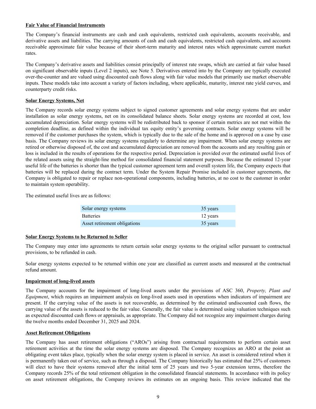Fair Value of Financial Instruments The Company’s financial instruments are cash and cash equivalents, restricted cash equivalents, accounts receivable, and derivative assets and liabilities. The carrying amounts of cash and cash equivalents, restricted cash equivalents, and accounts receivable approximate fair value because of their short-term maturity and interest rates which approximate current market rates. The Company’s derivative assets and liabilities consist principally of interest rate swaps, which are carried at fair value based on significant observable inputs (Level 2 inputs), see Note 5. Derivatives entered into by the Company are typically executed over-the-counter and are valued using discounted cash flows along with fair value models that primarily use market observable inputs. These models take into account a variety of factors including, where applicable, maturity, interest rate yield curves, and counterparty credit risks. Solar Energy Systems, Net The Company records solar energy systems subject to signed customer agreements and solar energy systems that are under installation as solar energy systems, net on its consolidated balance sheets. Solar energy systems are recorded at cost, less accumulated depreciation. Solar energy systems will be redistributed back to sponsor if certain metrics are not met within the completion deadline, as defined within the individual tax equity entity’s governing contracts. Solar energy systems will be removed if the customer purchases the system, which is typically due to the sale of the home and is approved on a case by case basis. The Company reviews its solar energy systems regularly to determine any impairment. When solar energy systems are retired or otherwise disposed of, the cost and accumulated depreciation are removed from the accounts and any resulting gain or loss is included in the results of operations for the respective period. Depreciation is provided over the estimated useful lives of the related assets using the straight-line method for consolidated financial statement purposes. Because the estimated 12-year useful life of the batteries is shorter than the typical customer agreement term and overall system life, the Company expects that batteries will be replaced during the contract term. Under the System Repair Promise included in customer agreements, the Company is obligated to repair or replace non-operational components, including batteries, at no cost to the customer in order to maintain system operability. The estimated useful lives are as follows: Solar energy systems 35 years Batteries 12 years Asset retirement obligations 35 years Solar Energy Systems to be Returned to Seller The Company may enter into agreements to return certain solar energy systems to the original seller pursuant to contractual provisions, to be refunded in cash. Solar energy systems expected to be returned within one year are classified as current assets and measured at the contractual refund amount. Impairment of long-lived assets The Company accounts for the impairment of long-lived assets under the provisions of ASC 360, Property, Plant and Equipment, which requires an impairment analysis on long-lived assets used in operations when indicators of impairment are present. If the carrying value of the assets is not recoverable, as determined by the estimated undiscounted cash flows, the carrying value of the assets is reduced to the fair value. Generally, the fair value is determined using valuation techniques such as expected discounted cash flows or appraisals, as appropriate. The Company did not recognize any impairment charges during the twelve months ended December 31, 2025 and 2024. Asset Retirement Obligations The Company has asset retirement obligations (“AROs”) arising from contractual requirements to perform certain asset retirement activities at the time the solar energy systems are disposed. The Company recognizes an ARO at the point an obligating event takes place, typically when the solar energy system is placed in service. An asset is considered retired when it is permanently taken out of service, such as through a disposal. The Company historically has estimated that 25% of customers will elect to have their systems removed after the initial term of 25 years and two 5-year extension terms, therefore the Company records 25% of the total retirement obligation in the consolidated financial statements. In accordance with its policy on asset retirement obligations, the Company reviews its estimates on an ongoing basis. This review indicated that the 9