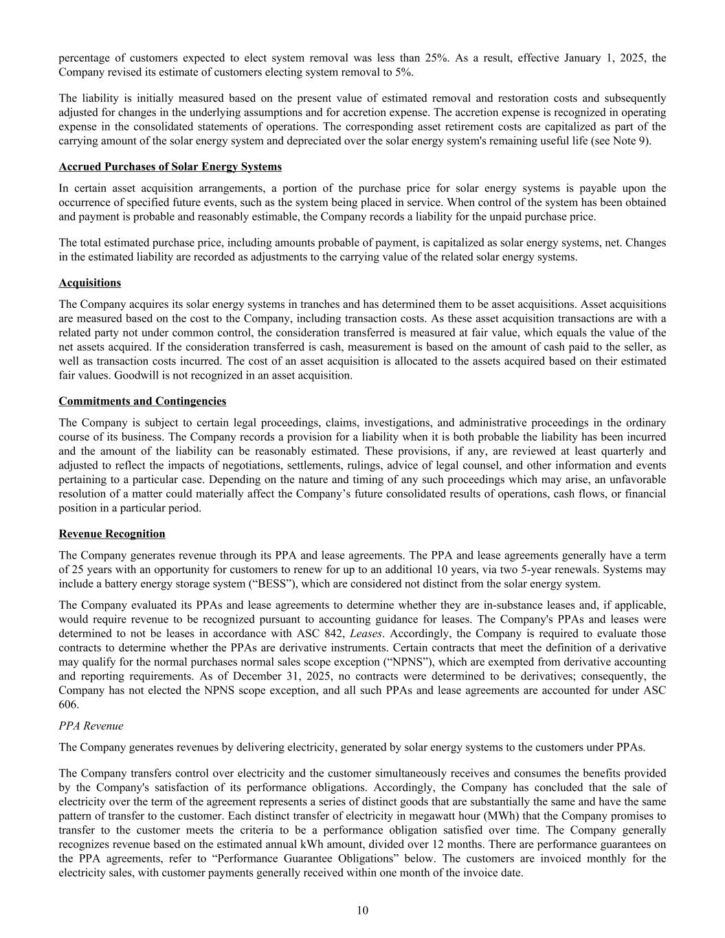 percentage of customers expected to elect system removal was less than 25%. As a result, effective January 1, 2025, the Company revised its estimate of customers electing system removal to 5%. The liability is initially measured based on the present value of estimated removal and restoration costs and subsequently adjusted for changes in the underlying assumptions and for accretion expense. The accretion expense is recognized in operating expense in the consolidated statements of operations. The corresponding asset retirement costs are capitalized as part of the carrying amount of the solar energy system and depreciated over the solar energy system's remaining useful life (see Note 9). Accrued Purchases of Solar Energy Systems In certain asset acquisition arrangements, a portion of the purchase price for solar energy systems is payable upon the occurrence of specified future events, such as the system being placed in service. When control of the system has been obtained and payment is probable and reasonably estimable, the Company records a liability for the unpaid purchase price. The total estimated purchase price, including amounts probable of payment, is capitalized as solar energy systems, net. Changes in the estimated liability are recorded as adjustments to the carrying value of the related solar energy systems. Acquisitions The Company acquires its solar energy systems in tranches and has determined them to be asset acquisitions. Asset acquisitions are measured based on the cost to the Company, including transaction costs. As these asset acquisition transactions are with a related party not under common control, the consideration transferred is measured at fair value, which equals the value of the net assets acquired. If the consideration transferred is cash, measurement is based on the amount of cash paid to the seller, as well as transaction costs incurred. The cost of an asset acquisition is allocated to the assets acquired based on their estimated fair values. Goodwill is not recognized in an asset acquisition. Commitments and Contingencies The Company is subject to certain legal proceedings, claims, investigations, and administrative proceedings in the ordinary course of its business. The Company records a provision for a liability when it is both probable the liability has been incurred and the amount of the liability can be reasonably estimated. These provisions, if any, are reviewed at least quarterly and adjusted to reflect the impacts of negotiations, settlements, rulings, advice of legal counsel, and other information and events pertaining to a particular case. Depending on the nature and timing of any such proceedings which may arise, an unfavorable resolution of a matter could materially affect the Company’s future consolidated results of operations, cash flows, or financial position in a particular period. Revenue Recognition The Company generates revenue through its PPA and lease agreements. The PPA and lease agreements generally have a term of 25 years with an opportunity for customers to renew for up to an additional 10 years, via two 5-year renewals. Systems may include a battery energy storage system (“BESS”), which are considered not distinct from the solar energy system. The Company evaluated its PPAs and lease agreements to determine whether they are in-substance leases and, if applicable, would require revenue to be recognized pursuant to accounting guidance for leases. The Company's PPAs and leases were determined to not be leases in accordance with ASC 842, Leases. Accordingly, the Company is required to evaluate those contracts to determine whether the PPAs are derivative instruments. Certain contracts that meet the definition of a derivative may qualify for the normal purchases normal sales scope exception (“NPNS”), which are exempted from derivative accounting and reporting requirements. As of December 31, 2025, no contracts were determined to be derivatives; consequently, the Company has not elected the NPNS scope exception, and all such PPAs and lease agreements are accounted for under ASC 606. PPA Revenue The Company generates revenues by delivering electricity, generated by solar energy systems to the customers under PPAs. The Company transfers control over electricity and the customer simultaneously receives and consumes the benefits provided by the Company's satisfaction of its performance obligations. Accordingly, the Company has concluded that the sale of electricity over the term of the agreement represents a series of distinct goods that are substantially the same and have the same pattern of transfer to the customer. Each distinct transfer of electricity in megawatt hour (MWh) that the Company promises to transfer to the customer meets the criteria to be a performance obligation satisfied over time. The Company generally recognizes revenue based on the estimated annual kWh amount, divided over 12 months. There are performance guarantees on the PPA agreements, refer to “Performance Guarantee Obligations” below. The customers are invoiced monthly for the electricity sales, with customer payments generally received within one month of the invoice date. 10