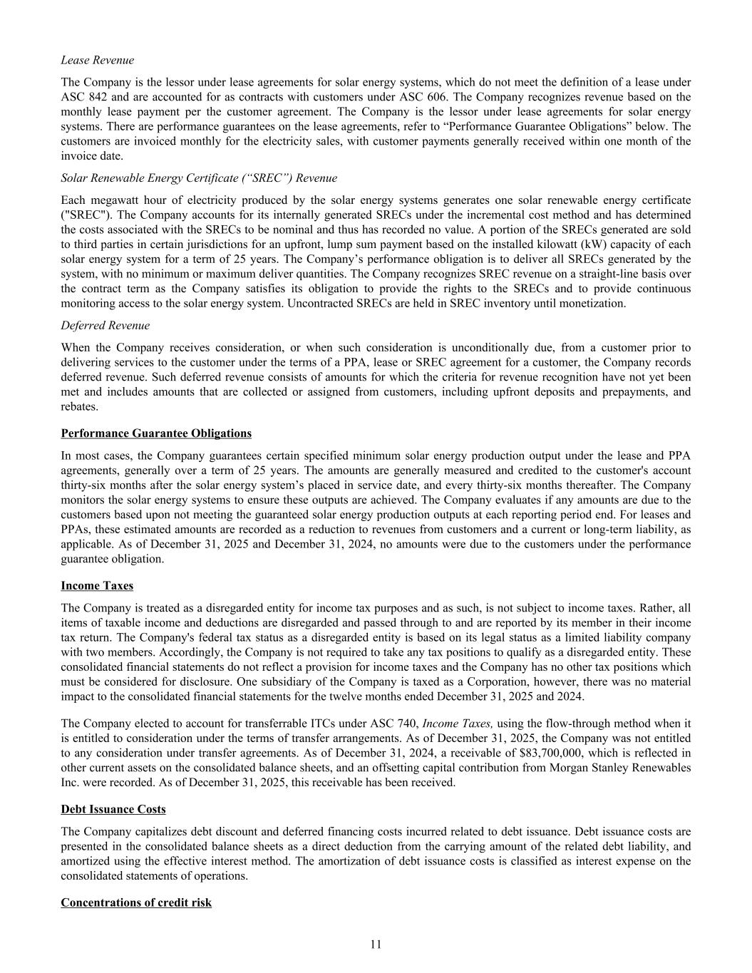 Lease Revenue The Company is the lessor under lease agreements for solar energy systems, which do not meet the definition of a lease under ASC 842 and are accounted for as contracts with customers under ASC 606. The Company recognizes revenue based on the monthly lease payment per the customer agreement. The Company is the lessor under lease agreements for solar energy systems. There are performance guarantees on the lease agreements, refer to “Performance Guarantee Obligations” below. The customers are invoiced monthly for the electricity sales, with customer payments generally received within one month of the invoice date. Solar Renewable Energy Certificate (“SREC”) Revenue Each megawatt hour of electricity produced by the solar energy systems generates one solar renewable energy certificate ("SREC"). The Company accounts for its internally generated SRECs under the incremental cost method and has determined the costs associated with the SRECs to be nominal and thus has recorded no value. A portion of the SRECs generated are sold to third parties in certain jurisdictions for an upfront, lump sum payment based on the installed kilowatt (kW) capacity of each solar energy system for a term of 25 years. The Company’s performance obligation is to deliver all SRECs generated by the system, with no minimum or maximum deliver quantities. The Company recognizes SREC revenue on a straight-line basis over the contract term as the Company satisfies its obligation to provide the rights to the SRECs and to provide continuous monitoring access to the solar energy system. Uncontracted SRECs are held in SREC inventory until monetization. Deferred Revenue When the Company receives consideration, or when such consideration is unconditionally due, from a customer prior to delivering services to the customer under the terms of a PPA, lease or SREC agreement for a customer, the Company records deferred revenue. Such deferred revenue consists of amounts for which the criteria for revenue recognition have not yet been met and includes amounts that are collected or assigned from customers, including upfront deposits and prepayments, and rebates. Performance Guarantee Obligations In most cases, the Company guarantees certain specified minimum solar energy production output under the lease and PPA agreements, generally over a term of 25 years. The amounts are generally measured and credited to the customer's account thirty-six months after the solar energy system’s placed in service date, and every thirty-six months thereafter. The Company monitors the solar energy systems to ensure these outputs are achieved. The Company evaluates if any amounts are due to the customers based upon not meeting the guaranteed solar energy production outputs at each reporting period end. For leases and PPAs, these estimated amounts are recorded as a reduction to revenues from customers and a current or long-term liability, as applicable. As of December 31, 2025 and December 31, 2024, no amounts were due to the customers under the performance guarantee obligation. Income Taxes The Company is treated as a disregarded entity for income tax purposes and as such, is not subject to income taxes. Rather, all items of taxable income and deductions are disregarded and passed through to and are reported by its member in their income tax return. The Company's federal tax status as a disregarded entity is based on its legal status as a limited liability company with two members. Accordingly, the Company is not required to take any tax positions to qualify as a disregarded entity. These consolidated financial statements do not reflect a provision for income taxes and the Company has no other tax positions which must be considered for disclosure. One subsidiary of the Company is taxed as a Corporation, however, there was no material impact to the consolidated financial statements for the twelve months ended December 31, 2025 and 2024. The Company elected to account for transferrable ITCs under ASC 740, Income Taxes, using the flow-through method when it is entitled to consideration under the terms of transfer arrangements. As of December 31, 2025, the Company was not entitled to any consideration under transfer agreements. As of December 31, 2024, a receivable of $83,700,000, which is reflected in other current assets on the consolidated balance sheets, and an offsetting capital contribution from Morgan Stanley Renewables Inc. were recorded. As of December 31, 2025, this receivable has been received. Debt Issuance Costs The Company capitalizes debt discount and deferred financing costs incurred related to debt issuance. Debt issuance costs are presented in the consolidated balance sheets as a direct deduction from the carrying amount of the related debt liability, and amortized using the effective interest method. The amortization of debt issuance costs is classified as interest expense on the consolidated statements of operations. Concentrations of credit risk 11