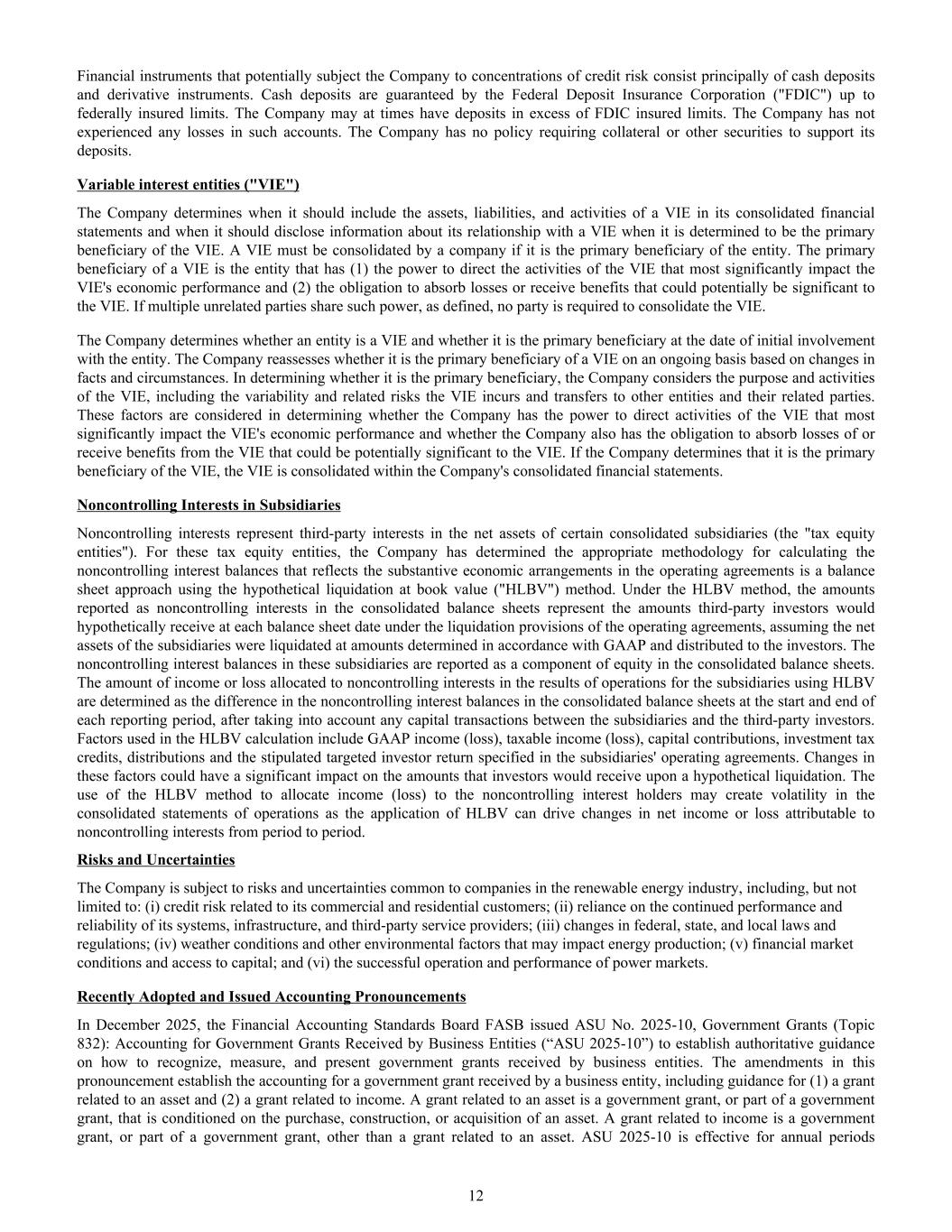 Financial instruments that potentially subject the Company to concentrations of credit risk consist principally of cash deposits and derivative instruments. Cash deposits are guaranteed by the Federal Deposit Insurance Corporation ("FDIC") up to federally insured limits. The Company may at times have deposits in excess of FDIC insured limits. The Company has not experienced any losses in such accounts. The Company has no policy requiring collateral or other securities to support its deposits. Variable interest entities ("VIE") The Company determines when it should include the assets, liabilities, and activities of a VIE in its consolidated financial statements and when it should disclose information about its relationship with a VIE when it is determined to be the primary beneficiary of the VIE. A VIE must be consolidated by a company if it is the primary beneficiary of the entity. The primary beneficiary of a VIE is the entity that has (1) the power to direct the activities of the VIE that most significantly impact the VIE's economic performance and (2) the obligation to absorb losses or receive benefits that could potentially be significant to the VIE. If multiple unrelated parties share such power, as defined, no party is required to consolidate the VIE. The Company determines whether an entity is a VIE and whether it is the primary beneficiary at the date of initial involvement with the entity. The Company reassesses whether it is the primary beneficiary of a VIE on an ongoing basis based on changes in facts and circumstances. In determining whether it is the primary beneficiary, the Company considers the purpose and activities of the VIE, including the variability and related risks the VIE incurs and transfers to other entities and their related parties. These factors are considered in determining whether the Company has the power to direct activities of the VIE that most significantly impact the VIE's economic performance and whether the Company also has the obligation to absorb losses of or receive benefits from the VIE that could be potentially significant to the VIE. If the Company determines that it is the primary beneficiary of the VIE, the VIE is consolidated within the Company's consolidated financial statements. Noncontrolling Interests in Subsidiaries Noncontrolling interests represent third-party interests in the net assets of certain consolidated subsidiaries (the "tax equity entities"). For these tax equity entities, the Company has determined the appropriate methodology for calculating the noncontrolling interest balances that reflects the substantive economic arrangements in the operating agreements is a balance sheet approach using the hypothetical liquidation at book value ("HLBV") method. Under the HLBV method, the amounts reported as noncontrolling interests in the consolidated balance sheets represent the amounts third-party investors would hypothetically receive at each balance sheet date under the liquidation provisions of the operating agreements, assuming the net assets of the subsidiaries were liquidated at amounts determined in accordance with GAAP and distributed to the investors. The noncontrolling interest balances in these subsidiaries are reported as a component of equity in the consolidated balance sheets. The amount of income or loss allocated to noncontrolling interests in the results of operations for the subsidiaries using HLBV are determined as the difference in the noncontrolling interest balances in the consolidated balance sheets at the start and end of each reporting period, after taking into account any capital transactions between the subsidiaries and the third-party investors. Factors used in the HLBV calculation include GAAP income (loss), taxable income (loss), capital contributions, investment tax credits, distributions and the stipulated targeted investor return specified in the subsidiaries' operating agreements. Changes in these factors could have a significant impact on the amounts that investors would receive upon a hypothetical liquidation. The use of the HLBV method to allocate income (loss) to the noncontrolling interest holders may create volatility in the consolidated statements of operations as the application of HLBV can drive changes in net income or loss attributable to noncontrolling interests from period to period. Risks and Uncertainties The Company is subject to risks and uncertainties common to companies in the renewable energy industry, including, but not limited to: (i) credit risk related to its commercial and residential customers; (ii) reliance on the continued performance and reliability of its systems, infrastructure, and third-party service providers; (iii) changes in federal, state, and local laws and regulations; (iv) weather conditions and other environmental factors that may impact energy production; (v) financial market conditions and access to capital; and (vi) the successful operation and performance of power markets. Recently Adopted and Issued Accounting Pronouncements In December 2025, the Financial Accounting Standards Board FASB issued ASU No. 2025-10, Government Grants (Topic 832): Accounting for Government Grants Received by Business Entities (“ASU 2025-10”) to establish authoritative guidance on how to recognize, measure, and present government grants received by business entities. The amendments in this pronouncement establish the accounting for a government grant received by a business entity, including guidance for (1) a grant related to an asset and (2) a grant related to income. A grant related to an asset is a government grant, or part of a government grant, that is conditioned on the purchase, construction, or acquisition of an asset. A grant related to income is a government grant, or part of a government grant, other than a grant related to an asset. ASU 2025-10 is effective for annual periods 12