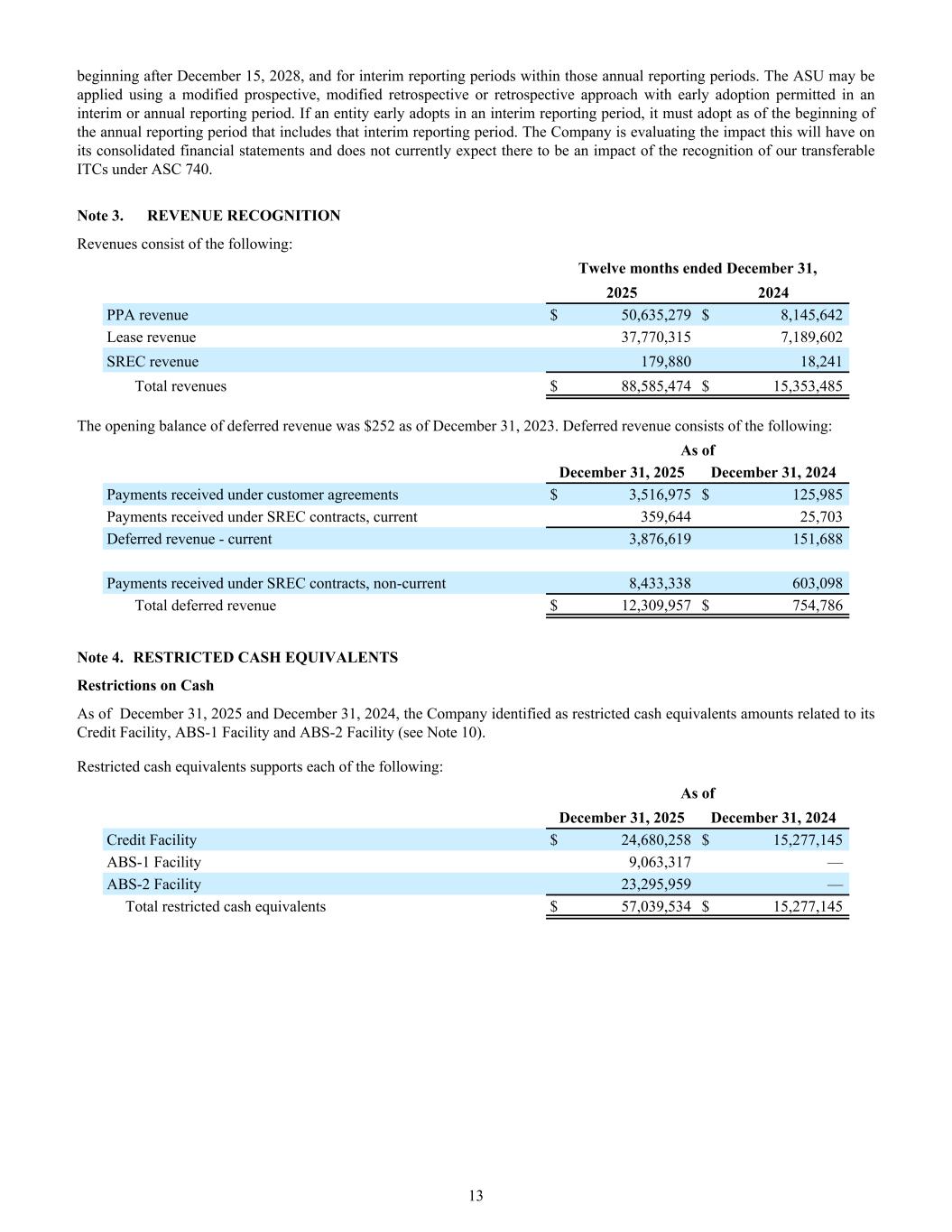 beginning after December 15, 2028, and for interim reporting periods within those annual reporting periods. The ASU may be applied using a modified prospective, modified retrospective or retrospective approach with early adoption permitted in an interim or annual reporting period. If an entity early adopts in an interim reporting period, it must adopt as of the beginning of the annual reporting period that includes that interim reporting period. The Company is evaluating the impact this will have on its consolidated financial statements and does not currently expect there to be an impact of the recognition of our transferable ITCs under ASC 740. Note 3. REVENUE RECOGNITION Revenues consist of the following: Twelve months ended December 31, 2025 2024 PPA revenue $ 50,635,279 $ 8,145,642 Lease revenue 37,770,315 7,189,602 SREC revenue 179,880 18,241 Total revenues $ 88,585,474 $ 15,353,485 The opening balance of deferred revenue was $252 as of December 31, 2023. Deferred revenue consists of the following: As of December 31, 2025 December 31, 2024 Payments received under customer agreements $ 3,516,975 $ 125,985 Payments received under SREC contracts, current 359,644 25,703 Deferred revenue - current 3,876,619 151,688 Payments received under SREC contracts, non-current 8,433,338 603,098 Total deferred revenue $ 12,309,957 $ 754,786 Note 4. RESTRICTED CASH EQUIVALENTS Restrictions on Cash As of December 31, 2025 and December 31, 2024, the Company identified as restricted cash equivalents amounts related to its Credit Facility, ABS-1 Facility and ABS-2 Facility (see Note 10). Restricted cash equivalents supports each of the following: As of December 31, 2025 December 31, 2024 Credit Facility $ 24,680,258 $ 15,277,145 ABS-1 Facility 9,063,317 — ABS-2 Facility 23,295,959 — Total restricted cash equivalents $ 57,039,534 $ 15,277,145 13