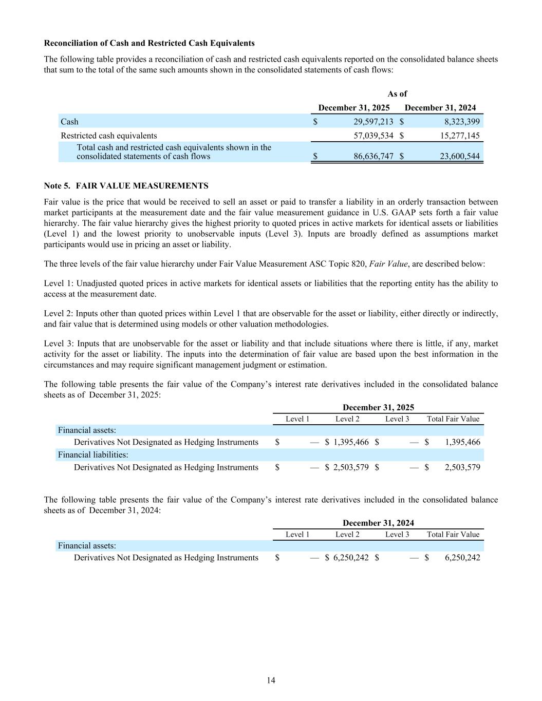 Reconciliation of Cash and Restricted Cash Equivalents The following table provides a reconciliation of cash and restricted cash equivalents reported on the consolidated balance sheets that sum to the total of the same such amounts shown in the consolidated statements of cash flows: As of December 31, 2025 December 31, 2024 Cash $ 29,597,213 $ 8,323,399 Restricted cash equivalents 57,039,534 $ 15,277,145 Total cash and restricted cash equivalents shown in the consolidated statements of cash flows $ 86,636,747 $ 23,600,544 Note 5. FAIR VALUE MEASUREMENTS Fair value is the price that would be received to sell an asset or paid to transfer a liability in an orderly transaction between market participants at the measurement date and the fair value measurement guidance in U.S. GAAP sets forth a fair value hierarchy. The fair value hierarchy gives the highest priority to quoted prices in active markets for identical assets or liabilities (Level 1) and the lowest priority to unobservable inputs (Level 3). Inputs are broadly defined as assumptions market participants would use in pricing an asset or liability. The three levels of the fair value hierarchy under Fair Value Measurement ASC Topic 820, Fair Value, are described below: Level 1: Unadjusted quoted prices in active markets for identical assets or liabilities that the reporting entity has the ability to access at the measurement date. Level 2: Inputs other than quoted prices within Level 1 that are observable for the asset or liability, either directly or indirectly, and fair value that is determined using models or other valuation methodologies. Level 3: Inputs that are unobservable for the asset or liability and that include situations where there is little, if any, market activity for the asset or liability. The inputs into the determination of fair value are based upon the best information in the circumstances and may require significant management judgment or estimation. The following table presents the fair value of the Company’s interest rate derivatives included in the consolidated balance sheets as of December 31, 2025: December 31, 2025 Level 1 Level 2 Level 3 Total Fair Value Financial assets: Derivatives Not Designated as Hedging Instruments $ — $ 1,395,466 $ — $ 1,395,466 Financial liabilities: Derivatives Not Designated as Hedging Instruments $ — $ 2,503,579 $ — $ 2,503,579 The following table presents the fair value of the Company’s interest rate derivatives included in the consolidated balance sheets as of December 31, 2024: December 31, 2024 Level 1 Level 2 Level 3 Total Fair Value Financial assets: Derivatives Not Designated as Hedging Instruments $ — $ 6,250,242 $ — $ 6,250,242 14