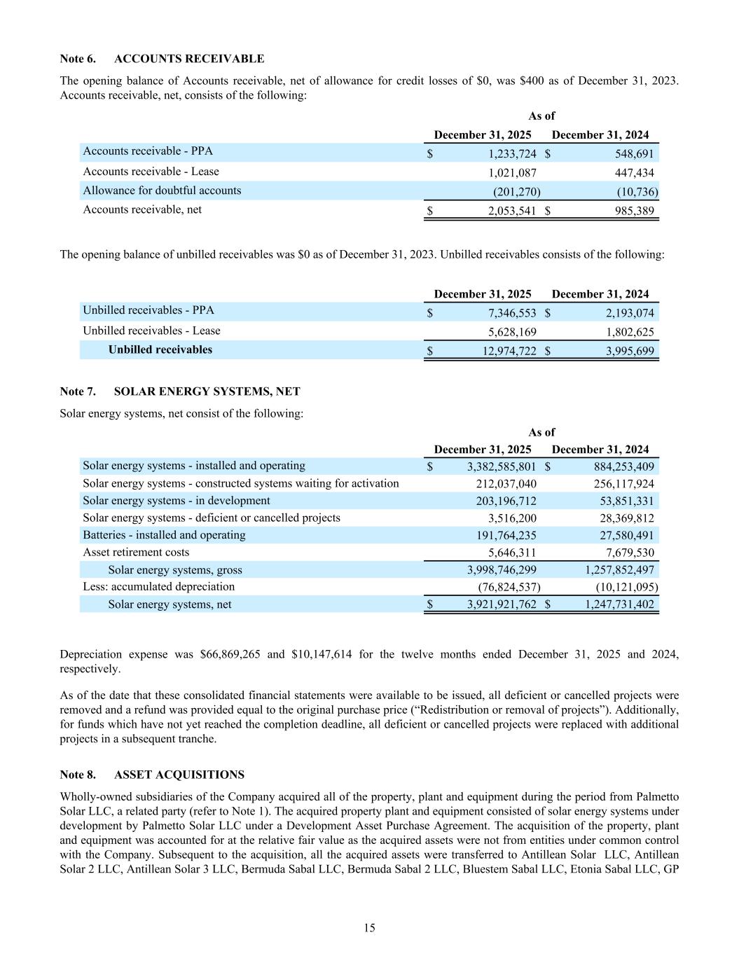 Note 6. ACCOUNTS RECEIVABLE The opening balance of Accounts receivable, net of allowance for credit losses of $0, was $400 as of December 31, 2023. Accounts receivable, net, consists of the following: As of December 31, 2025 December 31, 2024 Accounts receivable - PPA $ 1,233,724 $ 548,691 Accounts receivable - Lease 1,021,087 447,434 Allowance for doubtful accounts (201,270) (10,736) Accounts receivable, net $ 2,053,541 $ 985,389 The opening balance of unbilled receivables was $0 as of December 31, 2023. Unbilled receivables consists of the following: December 31, 2025 December 31, 2024 Unbilled receivables - PPA $ 7,346,553 $ 2,193,074 Unbilled receivables - Lease 5,628,169 1,802,625 Unbilled receivables $ 12,974,722 $ 3,995,699 Note 7. SOLAR ENERGY SYSTEMS, NET Solar energy systems, net consist of the following: As of December 31, 2025 December 31, 2024 Solar energy systems - installed and operating $ 3,382,585,801 $ 884,253,409 Solar energy systems - constructed systems waiting for activation 212,037,040 256,117,924 Solar energy systems - in development 203,196,712 53,851,331 Solar energy systems - deficient or cancelled projects 3,516,200 28,369,812 Batteries - installed and operating 191,764,235 27,580,491 Asset retirement costs 5,646,311 7,679,530 Solar energy systems, gross 3,998,746,299 1,257,852,497 Less: accumulated depreciation (76,824,537) (10,121,095) Solar energy systems, net $ 3,921,921,762 $ 1,247,731,402 Depreciation expense was $66,869,265 and $10,147,614 for the twelve months ended December 31, 2025 and 2024, respectively. As of the date that these consolidated financial statements were available to be issued, all deficient or cancelled projects were removed and a refund was provided equal to the original purchase price (“Redistribution or removal of projects”). Additionally, for funds which have not yet reached the completion deadline, all deficient or cancelled projects were replaced with additional projects in a subsequent tranche. Note 8. ASSET ACQUISITIONS Wholly-owned subsidiaries of the Company acquired all of the property, plant and equipment during the period from Palmetto Solar LLC, a related party (refer to Note 1). The acquired property plant and equipment consisted of solar energy systems under development by Palmetto Solar LLC under a Development Asset Purchase Agreement. The acquisition of the property, plant and equipment was accounted for at the relative fair value as the acquired assets were not from entities under common control with the Company. Subsequent to the acquisition, all the acquired assets were transferred to Antillean Solar LLC, Antillean Solar 2 LLC, Antillean Solar 3 LLC, Bermuda Sabal LLC, Bermuda Sabal 2 LLC, Bluestem Sabal LLC, Etonia Sabal LLC, GP 15