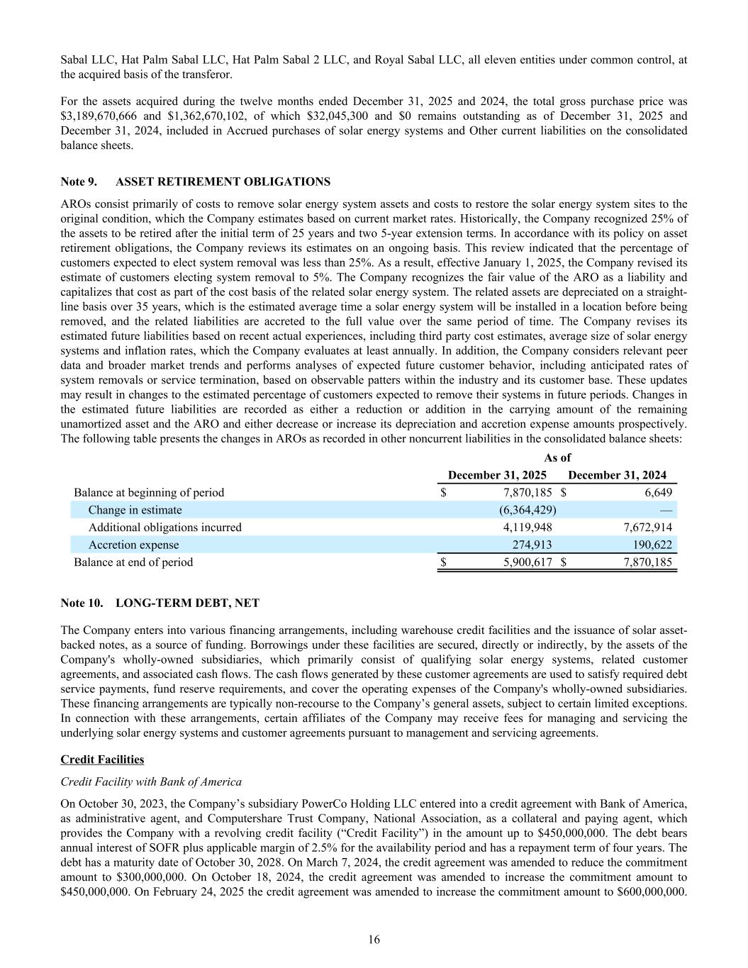Sabal LLC, Hat Palm Sabal LLC, Hat Palm Sabal 2 LLC, and Royal Sabal LLC, all eleven entities under common control, at the acquired basis of the transferor. For the assets acquired during the twelve months ended December 31, 2025 and 2024, the total gross purchase price was $3,189,670,666 and $1,362,670,102, of which $32,045,300 and $0 remains outstanding as of December 31, 2025 and December 31, 2024, included in Accrued purchases of solar energy systems and Other current liabilities on the consolidated balance sheets. Note 9. ASSET RETIREMENT OBLIGATIONS AROs consist primarily of costs to remove solar energy system assets and costs to restore the solar energy system sites to the original condition, which the Company estimates based on current market rates. Historically, the Company recognized 25% of the assets to be retired after the initial term of 25 years and two 5-year extension terms. In accordance with its policy on asset retirement obligations, the Company reviews its estimates on an ongoing basis. This review indicated that the percentage of customers expected to elect system removal was less than 25%. As a result, effective January 1, 2025, the Company revised its estimate of customers electing system removal to 5%. The Company recognizes the fair value of the ARO as a liability and capitalizes that cost as part of the cost basis of the related solar energy system. The related assets are depreciated on a straight- line basis over 35 years, which is the estimated average time a solar energy system will be installed in a location before being removed, and the related liabilities are accreted to the full value over the same period of time. The Company revises its estimated future liabilities based on recent actual experiences, including third party cost estimates, average size of solar energy systems and inflation rates, which the Company evaluates at least annually. In addition, the Company considers relevant peer data and broader market trends and performs analyses of expected future customer behavior, including anticipated rates of system removals or service termination, based on observable patters within the industry and its customer base. These updates may result in changes to the estimated percentage of customers expected to remove their systems in future periods. Changes in the estimated future liabilities are recorded as either a reduction or addition in the carrying amount of the remaining unamortized asset and the ARO and either decrease or increase its depreciation and accretion expense amounts prospectively. The following table presents the changes in AROs as recorded in other noncurrent liabilities in the consolidated balance sheets: As of December 31, 2025 December 31, 2024 Balance at beginning of period $ 7,870,185 $ 6,649 Change in estimate (6,364,429) — Additional obligations incurred 4,119,948 7,672,914 Accretion expense 274,913 190,622 Balance at end of period $ 5,900,617 $ 7,870,185 Note 10. LONG-TERM DEBT, NET The Company enters into various financing arrangements, including warehouse credit facilities and the issuance of solar asset- backed notes, as a source of funding. Borrowings under these facilities are secured, directly or indirectly, by the assets of the Company's wholly-owned subsidiaries, which primarily consist of qualifying solar energy systems, related customer agreements, and associated cash flows. The cash flows generated by these customer agreements are used to satisfy required debt service payments, fund reserve requirements, and cover the operating expenses of the Company's wholly-owned subsidiaries. These financing arrangements are typically non-recourse to the Company’s general assets, subject to certain limited exceptions. In connection with these arrangements, certain affiliates of the Company may receive fees for managing and servicing the underlying solar energy systems and customer agreements pursuant to management and servicing agreements. Credit Facilities Credit Facility with Bank of America On October 30, 2023, the Company’s subsidiary PowerCo Holding LLC entered into a credit agreement with Bank of America, as administrative agent, and Computershare Trust Company, National Association, as a collateral and paying agent, which provides the Company with a revolving credit facility (“Credit Facility”) in the amount up to $450,000,000. The debt bears annual interest of SOFR plus applicable margin of 2.5% for the availability period and has a repayment term of four years. The debt has a maturity date of October 30, 2028. On March 7, 2024, the credit agreement was amended to reduce the commitment amount to $300,000,000. On October 18, 2024, the credit agreement was amended to increase the commitment amount to $450,000,000. On February 24, 2025 the credit agreement was amended to increase the commitment amount to $600,000,000. 16