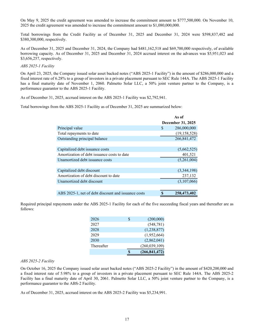 On May 9, 2025 the credit agreement was amended to increase the commitment amount to $777,500,000. On November 10, 2025 the credit agreement was amended to increase the commitment amount to $1,080,000,000. Total borrowings from the Credit Facility as of December 31, 2025 and December 31, 2024 were $598,837,482 and $380,300,000, respectively. As of December 31, 2025 and December 31, 2024, the Company had $481,162,518 and $69,700,000 respectively, of available borrowing capacity. As of December 31, 2025 and December 31, 2024 accrued interest on the advances was $5,951,023 and $3,656,257, respectively. ABS 2025-1 Facility On April 23, 2025, the Company issued solar asset backed notes (“ABS 2025-1 Facility”) in the amount of $286,000,000 and a fixed interest rate of 6.28% to a group of investors in a private placement pursuant to SEC Rule 144A. The ABS 2025-1 Facility has a final maturity date of November 1, 2060. Palmetto Solar LLC, a 50% joint venture partner to the Company, is a performance guarantor to the ABS 2025-1 Facility. As of December 31, 2025, accrued interest on the ABS 2025-1 Facility was $2,792,941. Total borrowings from the ABS 2025-1 Facility as of December 31, 2025 are summarized below: As of December 31, 2025 Principal value $ 286,000,000 Total repayments to date (19,158,528) Outstanding principal balance 266,841,472 Capitalized debt issuance costs (5,662,525) Amortization of debt issuance costs to date 401,521 Unamortized debt issuance costs (5,261,004) Capitalized debt discount (3,344,198) Amortization of debt discount to date 237,132 Unamortized debt discount (3,107,066) ABS 2025-1, net of debt discount and issuance costs $ 258,473,402 Required principal repayments under the ABS 2025-1 Facility for each of the five succeeding fiscal years and thereafter are as follows: 2026 $ (200,000) 2027 (548,781) 2028 (1,238,877) 2029 (1,952,664) 2030 (2,862,041) Thereafter (260,039,109) $ (266,841,472) ABS 2025-2 Facility On October 16, 2025 the Company issued solar asset backed notes (“ABS 2025-2 Facility”) in the amount of $420,200,000 and a fixed interest rate of 5.98% to a group of investors in a private placement pursuant to SEC Rule 144A. The ABS 2025-2 Facility has a final maturity date of April 30, 2061. Palmetto Solar LLC, a 50% joint venture partner to the Company, is a performance guarantor to the ABS-2 Facility. As of December 31, 2025, accrued interest on the ABS 2025-2 Facility was $5,234,991. 17