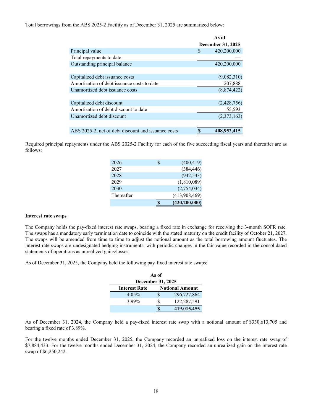 Total borrowings from the ABS 2025-2 Facility as of December 31, 2025 are summarized below: As of December 31, 2025 Principal value $ 420,200,000 Total repayments to date — Outstanding principal balance 420,200,000 Capitalized debt issuance costs (9,082,310) Amortization of debt issuance costs to date 207,888 Unamortized debt issuance costs (8,874,422) Capitalized debt discount (2,428,756) Amortization of debt discount to date 55,593 Unamortized debt discount (2,373,163) ABS 2025-2, net of debt discount and issuance costs $ 408,952,415 Required principal repayments under the ABS 2025-2 Facility for each of the five succeeding fiscal years and thereafter are as follows: 2026 $ (400,419) 2027 (384,446) 2028 (942,543) 2029 (1,810,089) 2030 (2,754,034) Thereafter (413,908,469) $ (420,200,000) Interest rate swaps The Company holds the pay-fixed interest rate swaps, bearing a fixed rate in exchange for receiving the 3-month SOFR rate. The swaps has a mandatory early termination date to coincide with the stated maturity on the credit facility of October 21, 2027. The swaps will be amended from time to time to adjust the notional amount as the total borrowing amount fluctuates. The interest rate swaps are undesignated hedging instruments, with periodic changes in the fair value recorded in the consolidated statements of operations as unrealized gains/losses. As of December 31, 2025, the Company held the following pay-fixed interest rate swaps: As of December 31, 2025 Interest Rate Notional Amount 4.05% $ 296,727,864 3.99% $ 122,287,591 $ 419,015,455 As of December 31, 2024, the Company held a pay-fixed interest rate swap with a notional amount of $330,613,705 and bearing a fixed rate of 3.89%. For the twelve months ended December 31, 2025, the Company recorded an unrealized loss on the interest rate swap of $7,884,433. For the twelve months ended December 31, 2024, the Company recorded an unrealized gain on the interest rate swap of $6,250,242. 18