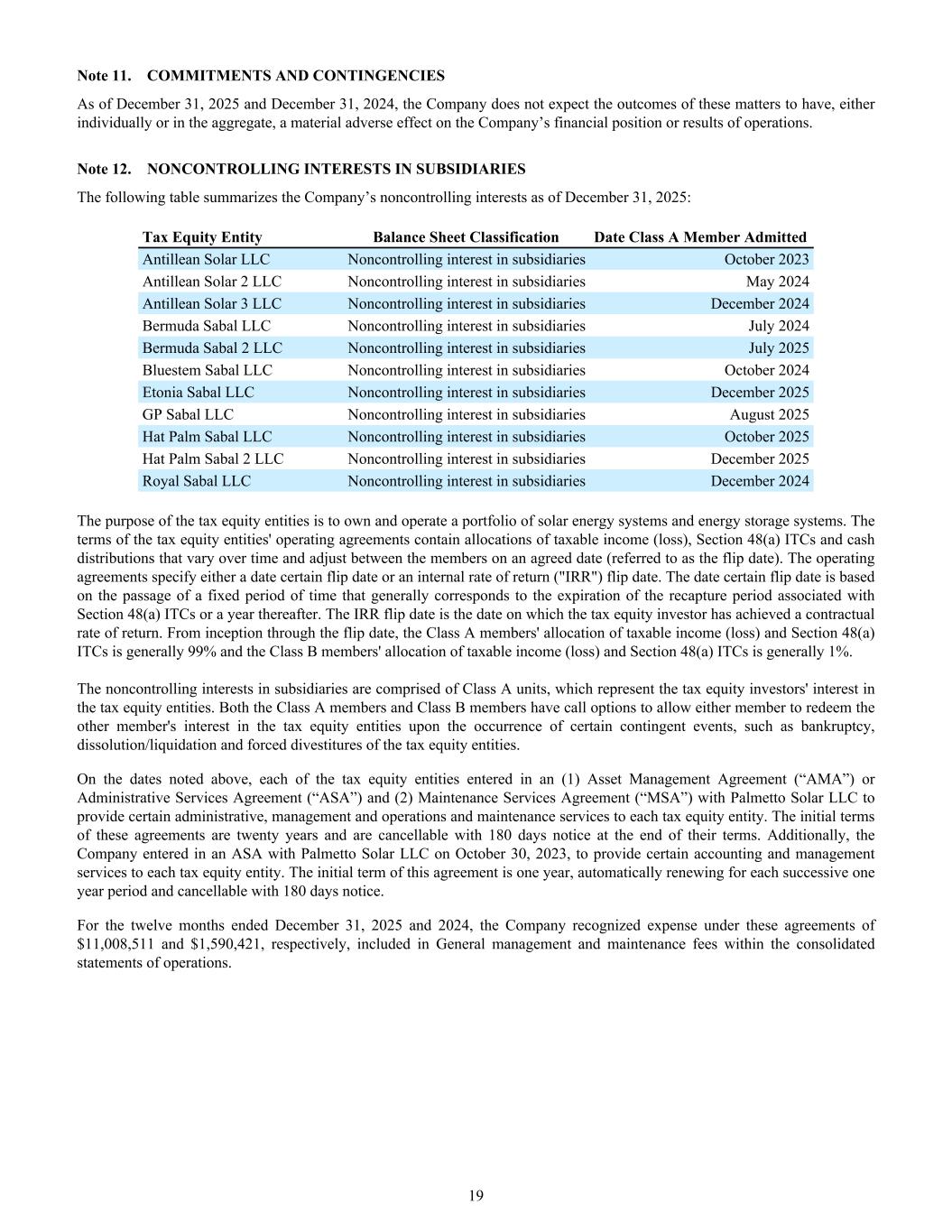Note 11. COMMITMENTS AND CONTINGENCIES As of December 31, 2025 and December 31, 2024, the Company does not expect the outcomes of these matters to have, either individually or in the aggregate, a material adverse effect on the Company’s financial position or results of operations. Note 12. NONCONTROLLING INTERESTS IN SUBSIDIARIES The following table summarizes the Company’s noncontrolling interests as of December 31, 2025: Tax Equity Entity Balance Sheet Classification Date Class A Member Admitted Antillean Solar LLC Noncontrolling interest in subsidiaries October 2023 Antillean Solar 2 LLC Noncontrolling interest in subsidiaries May 2024 Antillean Solar 3 LLC Noncontrolling interest in subsidiaries December 2024 Bermuda Sabal LLC Noncontrolling interest in subsidiaries July 2024 Bermuda Sabal 2 LLC Noncontrolling interest in subsidiaries July 2025 Bluestem Sabal LLC Noncontrolling interest in subsidiaries October 2024 Etonia Sabal LLC Noncontrolling interest in subsidiaries December 2025 GP Sabal LLC Noncontrolling interest in subsidiaries August 2025 Hat Palm Sabal LLC Noncontrolling interest in subsidiaries October 2025 Hat Palm Sabal 2 LLC Noncontrolling interest in subsidiaries December 2025 Royal Sabal LLC Noncontrolling interest in subsidiaries December 2024 The purpose of the tax equity entities is to own and operate a portfolio of solar energy systems and energy storage systems. The terms of the tax equity entities' operating agreements contain allocations of taxable income (loss), Section 48(a) ITCs and cash distributions that vary over time and adjust between the members on an agreed date (referred to as the flip date). The operating agreements specify either a date certain flip date or an internal rate of return ("IRR") flip date. The date certain flip date is based on the passage of a fixed period of time that generally corresponds to the expiration of the recapture period associated with Section 48(a) ITCs or a year thereafter. The IRR flip date is the date on which the tax equity investor has achieved a contractual rate of return. From inception through the flip date, the Class A members' allocation of taxable income (loss) and Section 48(a) ITCs is generally 99% and the Class B members' allocation of taxable income (loss) and Section 48(a) ITCs is generally 1%. The noncontrolling interests in subsidiaries are comprised of Class A units, which represent the tax equity investors' interest in the tax equity entities. Both the Class A members and Class B members have call options to allow either member to redeem the other member's interest in the tax equity entities upon the occurrence of certain contingent events, such as bankruptcy, dissolution/liquidation and forced divestitures of the tax equity entities. On the dates noted above, each of the tax equity entities entered in an (1) Asset Management Agreement (“AMA”) or Administrative Services Agreement (“ASA”) and (2) Maintenance Services Agreement (“MSA”) with Palmetto Solar LLC to provide certain administrative, management and operations and maintenance services to each tax equity entity. The initial terms of these agreements are twenty years and are cancellable with 180 days notice at the end of their terms. Additionally, the Company entered in an ASA with Palmetto Solar LLC on October 30, 2023, to provide certain accounting and management services to each tax equity entity. The initial term of this agreement is one year, automatically renewing for each successive one year period and cancellable with 180 days notice. For the twelve months ended December 31, 2025 and 2024, the Company recognized expense under these agreements of $11,008,511 and $1,590,421, respectively, included in General management and maintenance fees within the consolidated statements of operations. 19