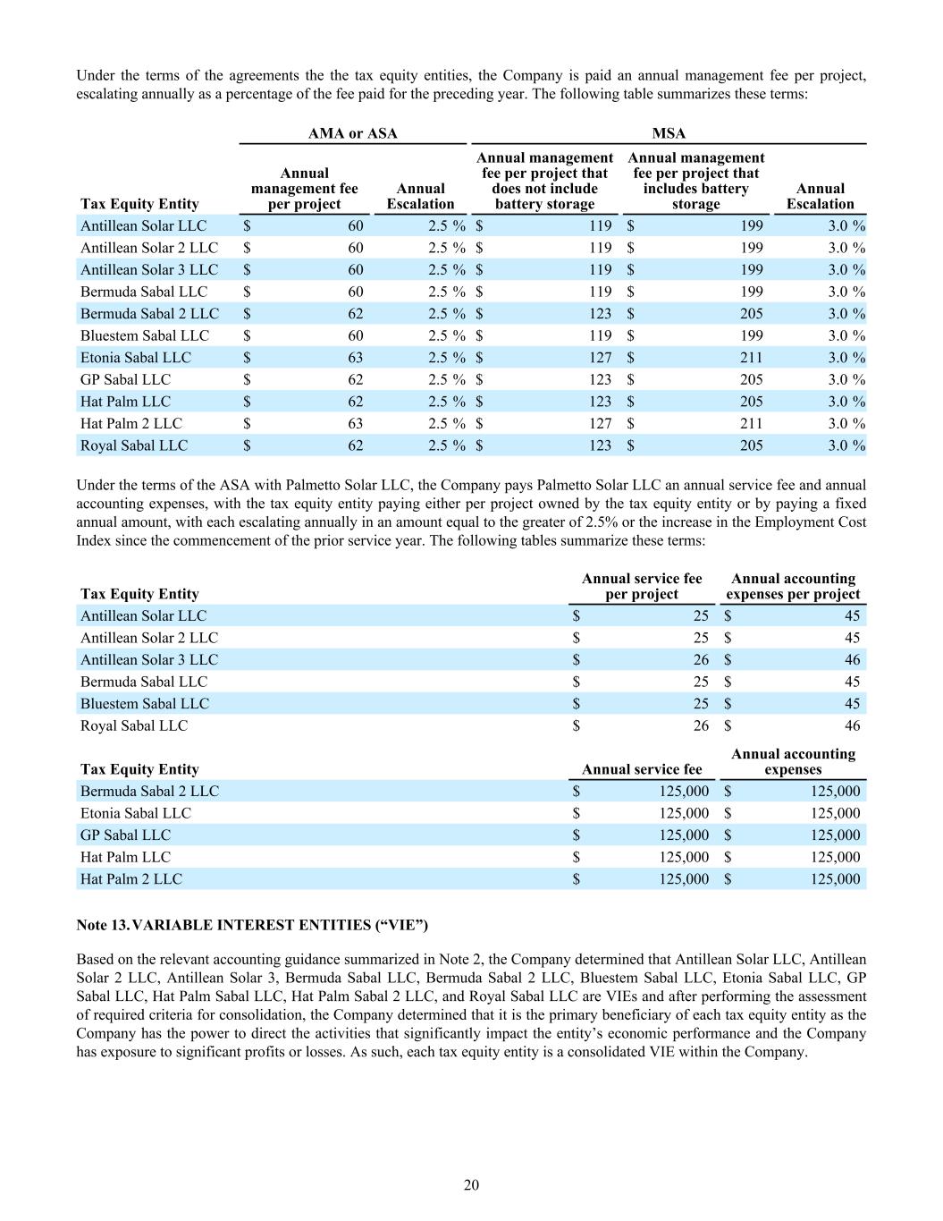 Under the terms of the agreements the the tax equity entities, the Company is paid an annual management fee per project, escalating annually as a percentage of the fee paid for the preceding year. The following table summarizes these terms: AMA or ASA MSA Tax Equity Entity Annual management fee per project Annual Escalation Annual management fee per project that does not include battery storage Annual management fee per project that includes battery storage Annual Escalation Antillean Solar LLC $ 60 2.5 % $ 119 $ 199 3.0 % Antillean Solar 2 LLC $ 60 2.5 % $ 119 $ 199 3.0 % Antillean Solar 3 LLC $ 60 2.5 % $ 119 $ 199 3.0 % Bermuda Sabal LLC $ 60 2.5 % $ 119 $ 199 3.0 % Bermuda Sabal 2 LLC $ 62 2.5 % $ 123 $ 205 3.0 % Bluestem Sabal LLC $ 60 2.5 % $ 119 $ 199 3.0 % Etonia Sabal LLC $ 63 2.5 % $ 127 $ 211 3.0 % GP Sabal LLC $ 62 2.5 % $ 123 $ 205 3.0 % Hat Palm LLC $ 62 2.5 % $ 123 $ 205 3.0 % Hat Palm 2 LLC $ 63 2.5 % $ 127 $ 211 3.0 % Royal Sabal LLC $ 62 2.5 % $ 123 $ 205 3.0 % Under the terms of the ASA with Palmetto Solar LLC, the Company pays Palmetto Solar LLC an annual service fee and annual accounting expenses, with the tax equity entity paying either per project owned by the tax equity entity or by paying a fixed annual amount, with each escalating annually in an amount equal to the greater of 2.5% or the increase in the Employment Cost Index since the commencement of the prior service year. The following tables summarize these terms: Tax Equity Entity Annual service fee per project Annual accounting expenses per project Antillean Solar LLC $ 25 $ 45 Antillean Solar 2 LLC $ 25 $ 45 Antillean Solar 3 LLC $ 26 $ 46 Bermuda Sabal LLC $ 25 $ 45 Bluestem Sabal LLC $ 25 $ 45 Royal Sabal LLC $ 26 $ 46 Tax Equity Entity Annual service fee Annual accounting expenses Bermuda Sabal 2 LLC $ 125,000 $ 125,000 Etonia Sabal LLC $ 125,000 $ 125,000 GP Sabal LLC $ 125,000 $ 125,000 Hat Palm LLC $ 125,000 $ 125,000 Hat Palm 2 LLC $ 125,000 $ 125,000 Note 13. VARIABLE INTEREST ENTITIES (“VIE”) Based on the relevant accounting guidance summarized in Note 2, the Company determined that Antillean Solar LLC, Antillean Solar 2 LLC, Antillean Solar 3, Bermuda Sabal LLC, Bermuda Sabal 2 LLC, Bluestem Sabal LLC, Etonia Sabal LLC, GP Sabal LLC, Hat Palm Sabal LLC, Hat Palm Sabal 2 LLC, and Royal Sabal LLC are VIEs and after performing the assessment of required criteria for consolidation, the Company determined that it is the primary beneficiary of each tax equity entity as the Company has the power to direct the activities that significantly impact the entity’s economic performance and the Company has exposure to significant profits or losses. As such, each tax equity entity is a consolidated VIE within the Company. 20