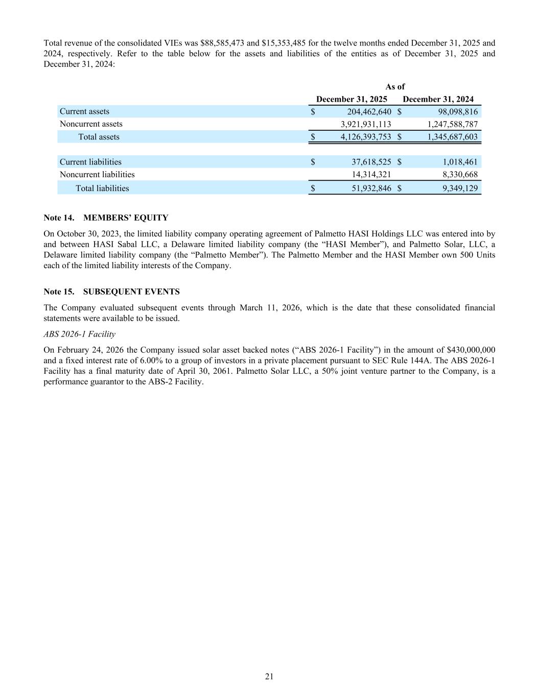 Total revenue of the consolidated VIEs was $88,585,473 and $15,353,485 for the twelve months ended December 31, 2025 and 2024, respectively. Refer to the table below for the assets and liabilities of the entities as of December 31, 2025 and December 31, 2024: As of December 31, 2025 December 31, 2024 Current assets $ 204,462,640 $ 98,098,816 Noncurrent assets 3,921,931,113 1,247,588,787 Total assets $ 4,126,393,753 $ 1,345,687,603 Current liabilities $ 37,618,525 $ 1,018,461 Noncurrent liabilities 14,314,321 8,330,668 Total liabilities $ 51,932,846 $ 9,349,129 Note 14. MEMBERS’ EQUITY On October 30, 2023, the limited liability company operating agreement of Palmetto HASI Holdings LLC was entered into by and between HASI Sabal LLC, a Delaware limited liability company (the “HASI Member”), and Palmetto Solar, LLC, a Delaware limited liability company (the “Palmetto Member”). The Palmetto Member and the HASI Member own 500 Units each of the limited liability interests of the Company. Note 15. SUBSEQUENT EVENTS The Company evaluated subsequent events through March 11, 2026, which is the date that these consolidated financial statements were available to be issued. ABS 2026-1 Facility On February 24, 2026 the Company issued solar asset backed notes (“ABS 2026-1 Facility”) in the amount of $430,000,000 and a fixed interest rate of 6.00% to a group of investors in a private placement pursuant to SEC Rule 144A. The ABS 2026-1 Facility has a final maturity date of April 30, 2061. Palmetto Solar LLC, a 50% joint venture partner to the Company, is a performance guarantor to the ABS-2 Facility. 21