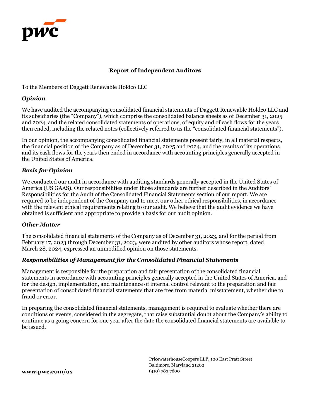 PricewaterhouseCoopers LLP, 100 East Pratt Street Baltimore, Maryland 21202 www.pwc.com/us (410) 783 7600 Report of Independent Auditors To the Members of Daggett Renewable Holdco LLC Opinion We have audited the accompanying consolidated financial statements of Daggett Renewable Holdco LLC and its subsidiaries (the “Company”), which comprise the consolidated balance sheets as of December 31, 2025 and 2024, and the related consolidated statements of operations, of equity and of cash flows for the years then ended, including the related notes (collectively referred to as the “consolidated financial statements”). In our opinion, the accompanying consolidated financial statements present fairly, in all material respects, the financial position of the Company as of December 31, 2025 and 2024, and the results of its operations and its cash flows for the years then ended in accordance with accounting principles generally accepted in the United States of America. Basis for Opinion We conducted our audit in accordance with auditing standards generally accepted in the United States of America (US GAAS). Our responsibilities under those standards are further described in the Auditors’ Responsibilities for the Audit of the Consolidated Financial Statements section of our report. We are required to be independent of the Company and to meet our other ethical responsibilities, in accordance with the relevant ethical requirements relating to our audit. We believe that the audit evidence we have obtained is sufficient and appropriate to provide a basis for our audit opinion. Other Matter The consolidated financial statements of the Company as of December 31, 2023, and for the period from February 17, 2023 through December 31, 2023, were audited by other auditors whose report, dated March 28, 2024, expressed an unmodified opinion on those statements. Responsibilities of Management for the Consolidated Financial Statements Management is responsible for the preparation and fair presentation of the consolidated financial statements in accordance with accounting principles generally accepted in the United States of America, and for the design, implementation, and maintenance of internal control relevant to the preparation and fair presentation of consolidated financial statements that are free from material misstatement, whether due to fraud or error. In preparing the consolidated financial statements, management is required to evaluate whether there are conditions or events, considered in the aggregate, that raise substantial doubt about the Company’s ability to continue as a going concern for one year after the date the consolidated financial statements are available to be issued.